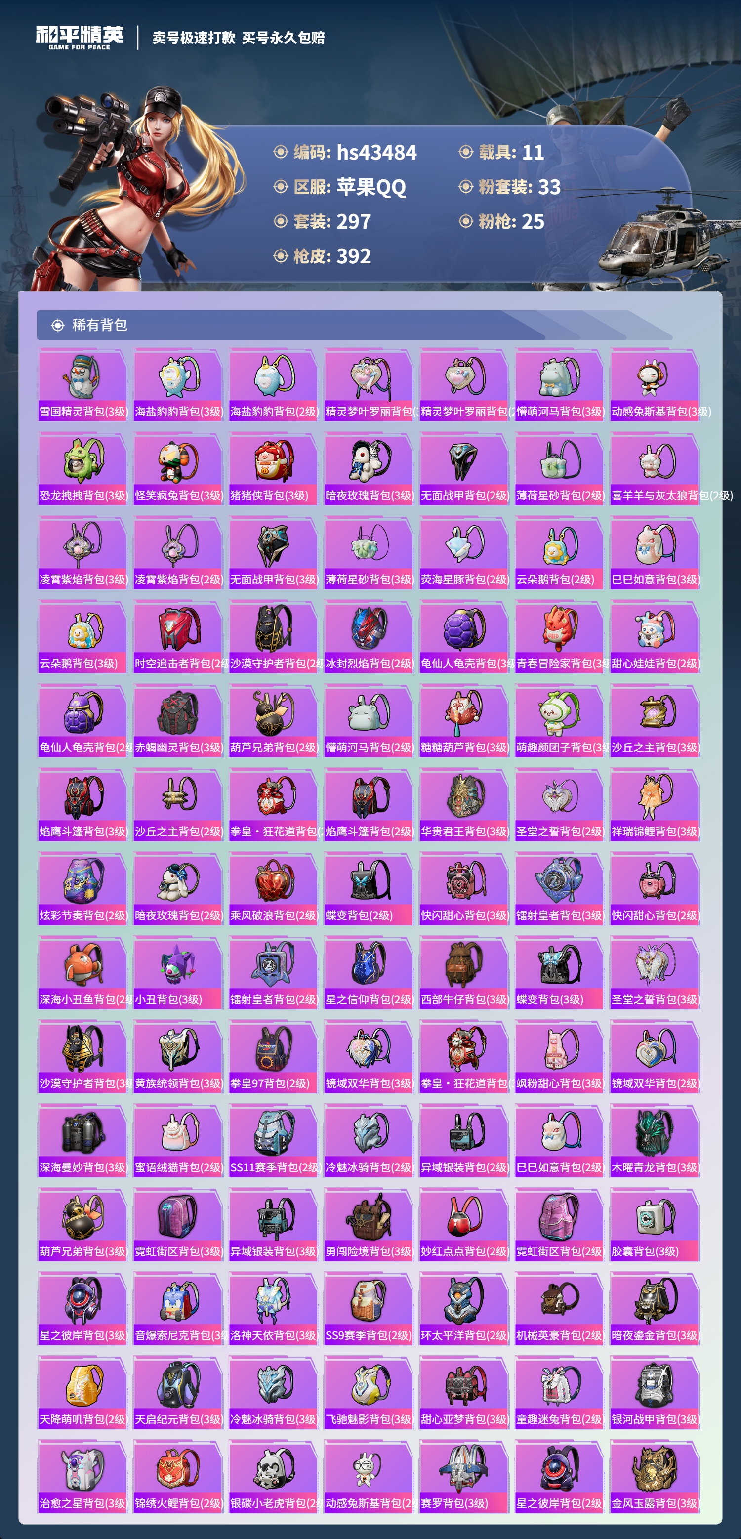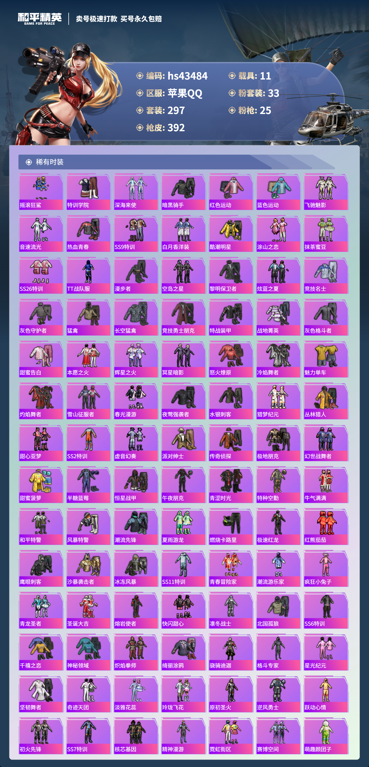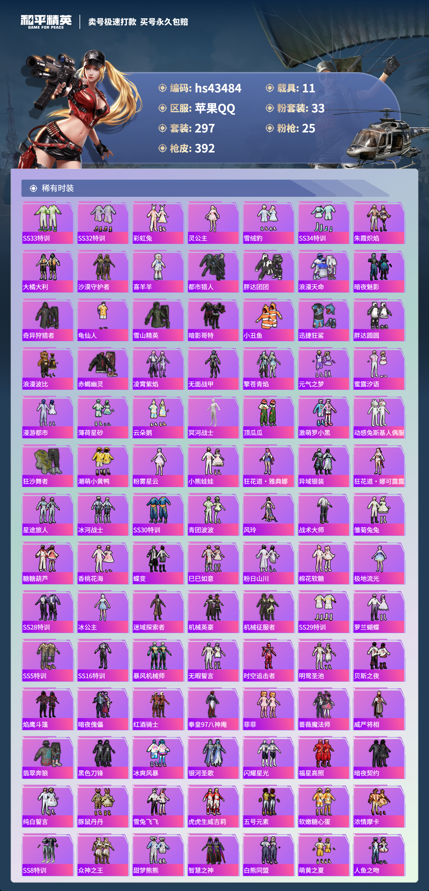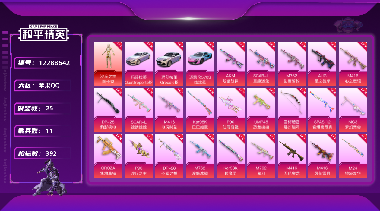 【10871848】【不可二次】【苹果QQ】M762-甜蜜誓约 水银刺客 迈凯伦570S 炫冰蓝 漫步者 金属狂野 SCAR-童趣迷兔 桀骜红莲 AUG-星之彼岸 Kar98K-伏魔团 紫电风暴 M24-镜域双华 迅捷狂鲨 狂沙舞者 玛莎拉蒂蓝色 爆炸猎弓 木曜青龙 P90-仙履奇缘 P90-沙丘之主 SPAS-12-音爆索尼克 新星烈龙 机械英豪 极速红龙 M416-电玩时刻 软嫩糖心蛋 激萌
