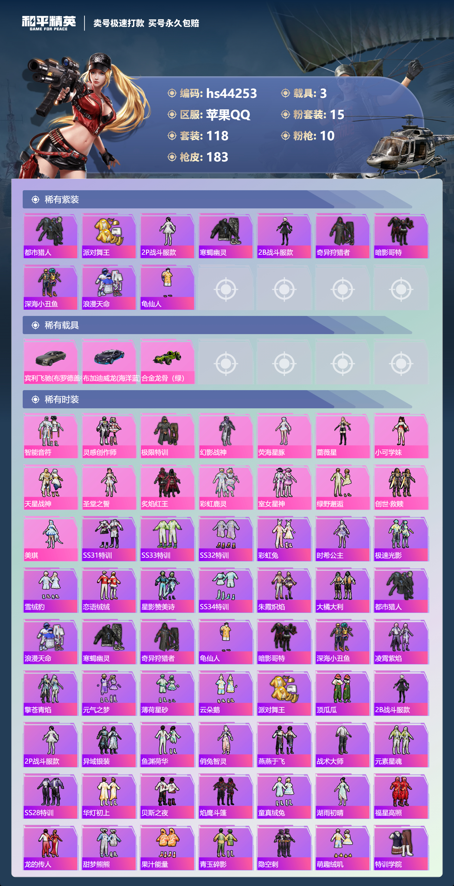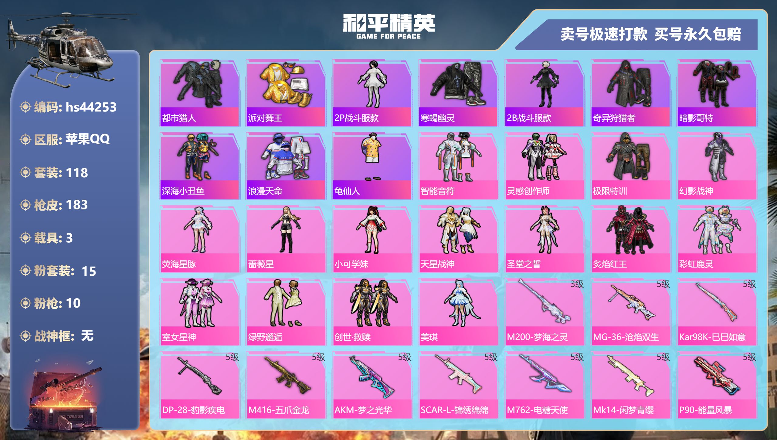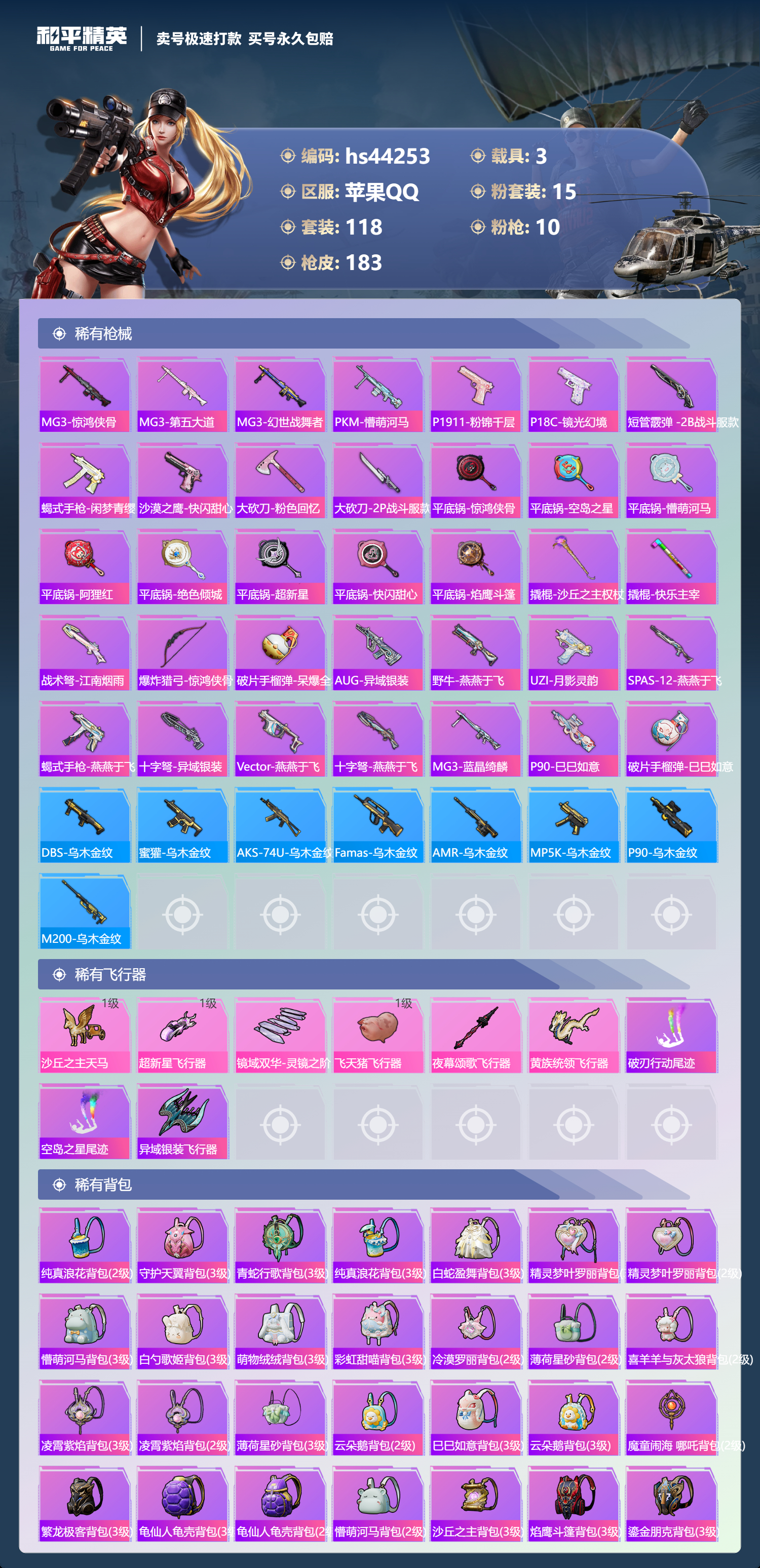 【10887836】【可二次】【苹果QQ】龟仙人 水银刺客 M416-五爪金龙 漫步者 都市猎人 炙焰红王 极限特训 MK14-闲梦青缨 寒蝎幽灵 MK47-林间仙鹿 深海小丑鱼 夜幕颂歌飞行器 智能音符 浪漫天命 P90-能量风暴 M762-电糖天使 合金龙骨绿色 奇异狩猎者 彩虹鹿灵 黄族统领飞行器 M762-风花雪月 SCAR-L-锦绣绵绵 布加迪威龙(海洋蓝) AKM-梦之光华 AKM-