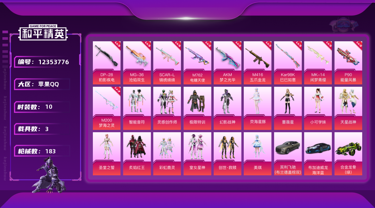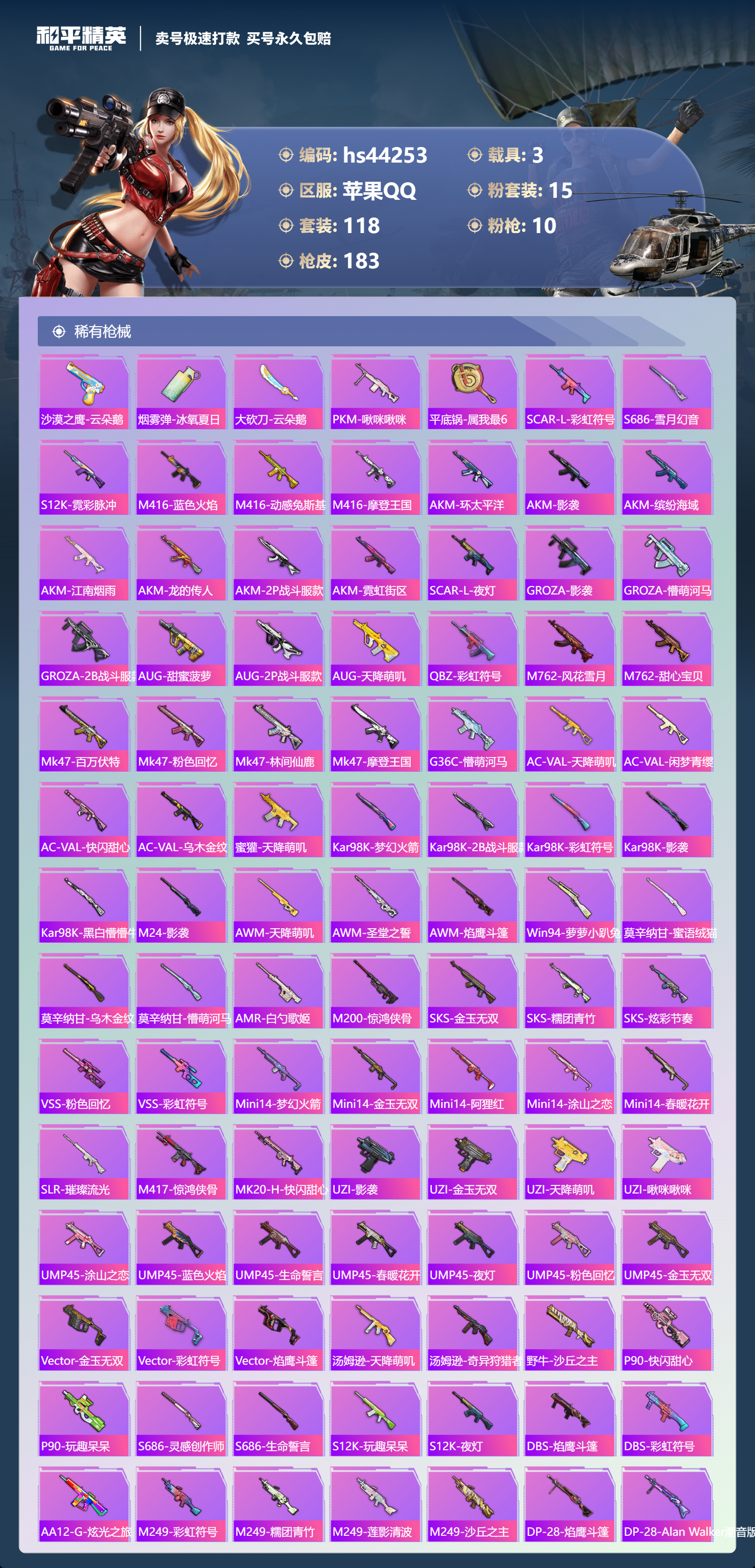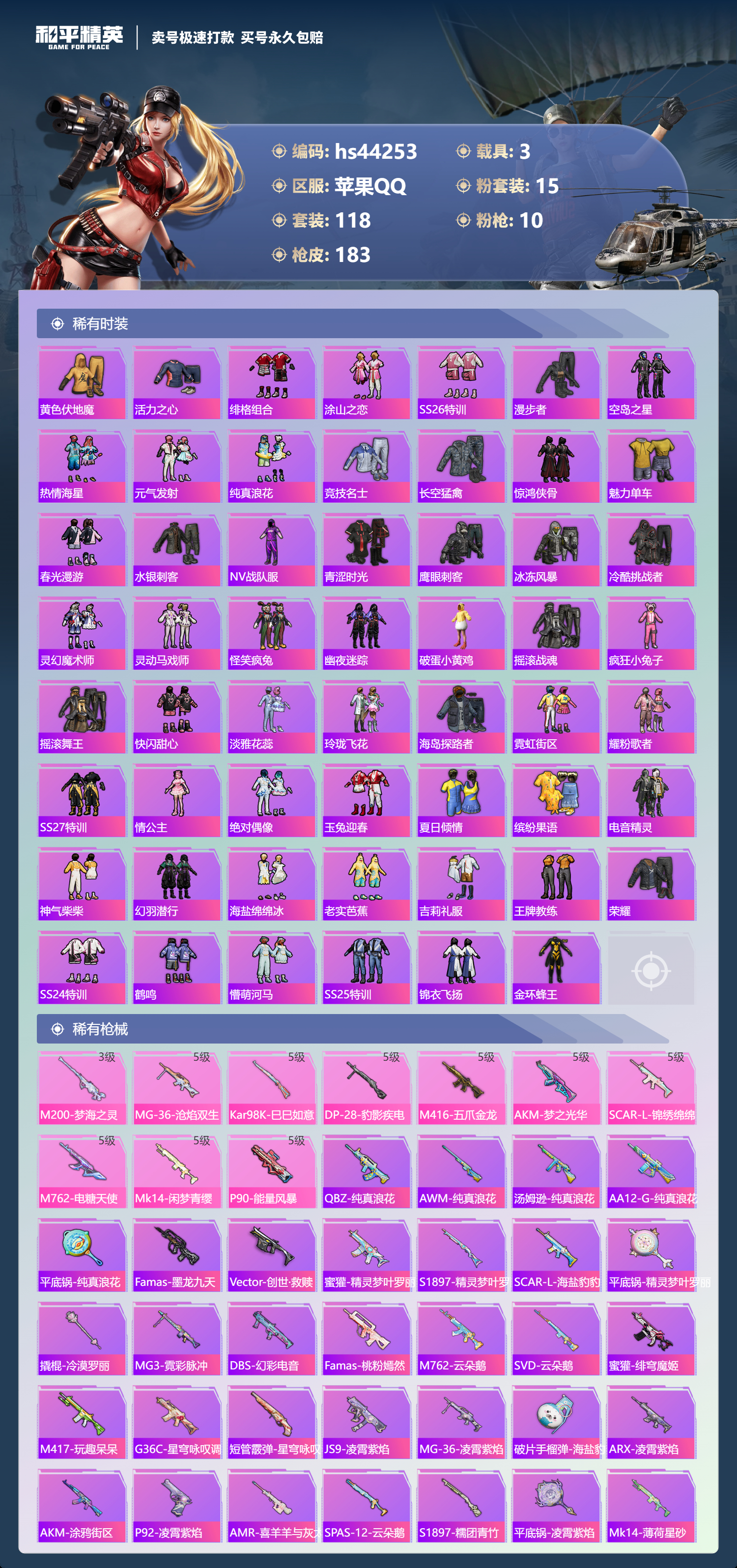 【10887836】【可二次】【苹果QQ】龟仙人 水银刺客 M416-五爪金龙 漫步者 都市猎人 炙焰红王 极限特训 MK14-闲梦青缨 寒蝎幽灵 MK47-林间仙鹿 深海小丑鱼 夜幕颂歌飞行器 智能音符 浪漫天命 P90-能量风暴 M762-电糖天使 合金龙骨绿色 奇异狩猎者 彩虹鹿灵 黄族统领飞行器 M762-风花雪月 SCAR-L-锦绣绵绵 布加迪威龙(海洋蓝) AKM-梦之光华 AKM-