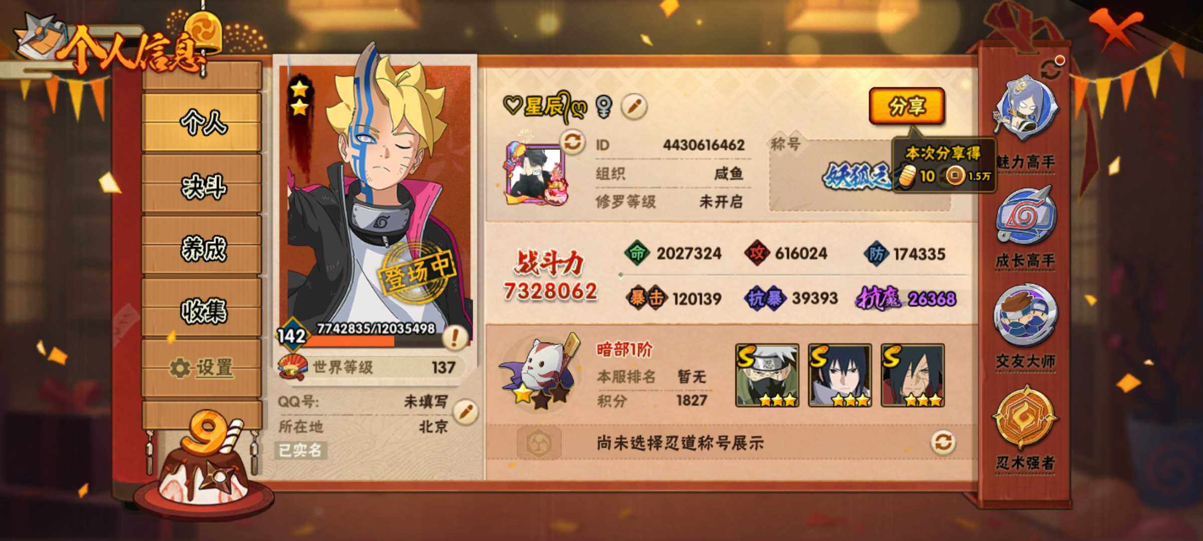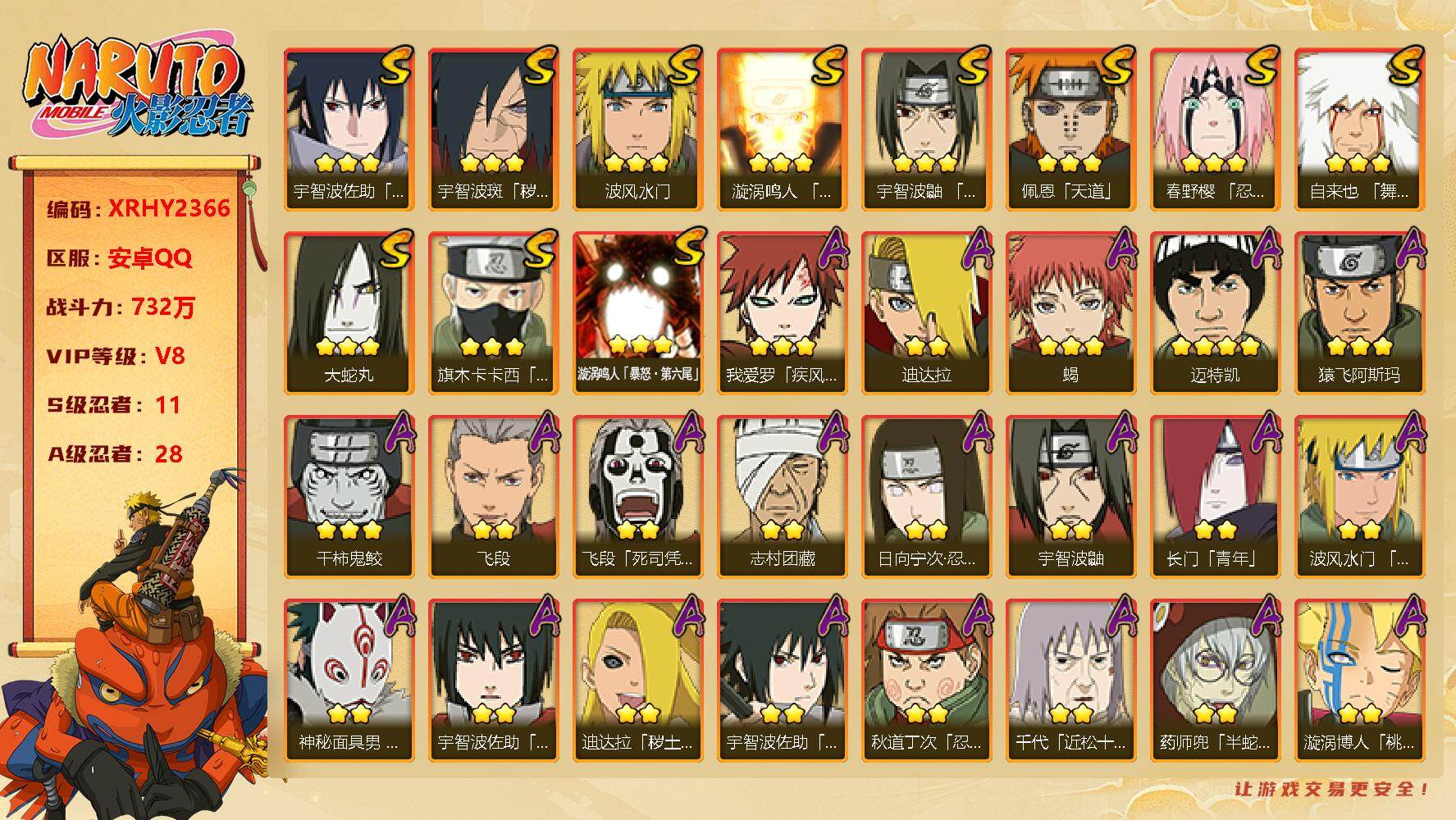 [13108518]Xr43040-安卓QQ-11S级忍者数-28A级忍者数 【S级忍者】:宇智波斑「秽土转生·解」(3星),春野樱「忍界大战」(3星),宇智波鼬「须佐能乎」(3星),旗木卡卡西「须佐能乎」(3星),自来也「舞之豪杰」(3星),大蛇丸(3星),波风水门(3星),漩涡鸣人「九喇嘛连结」(3星),佩恩「天道」(3星),宇智波佐助「永恒万花...