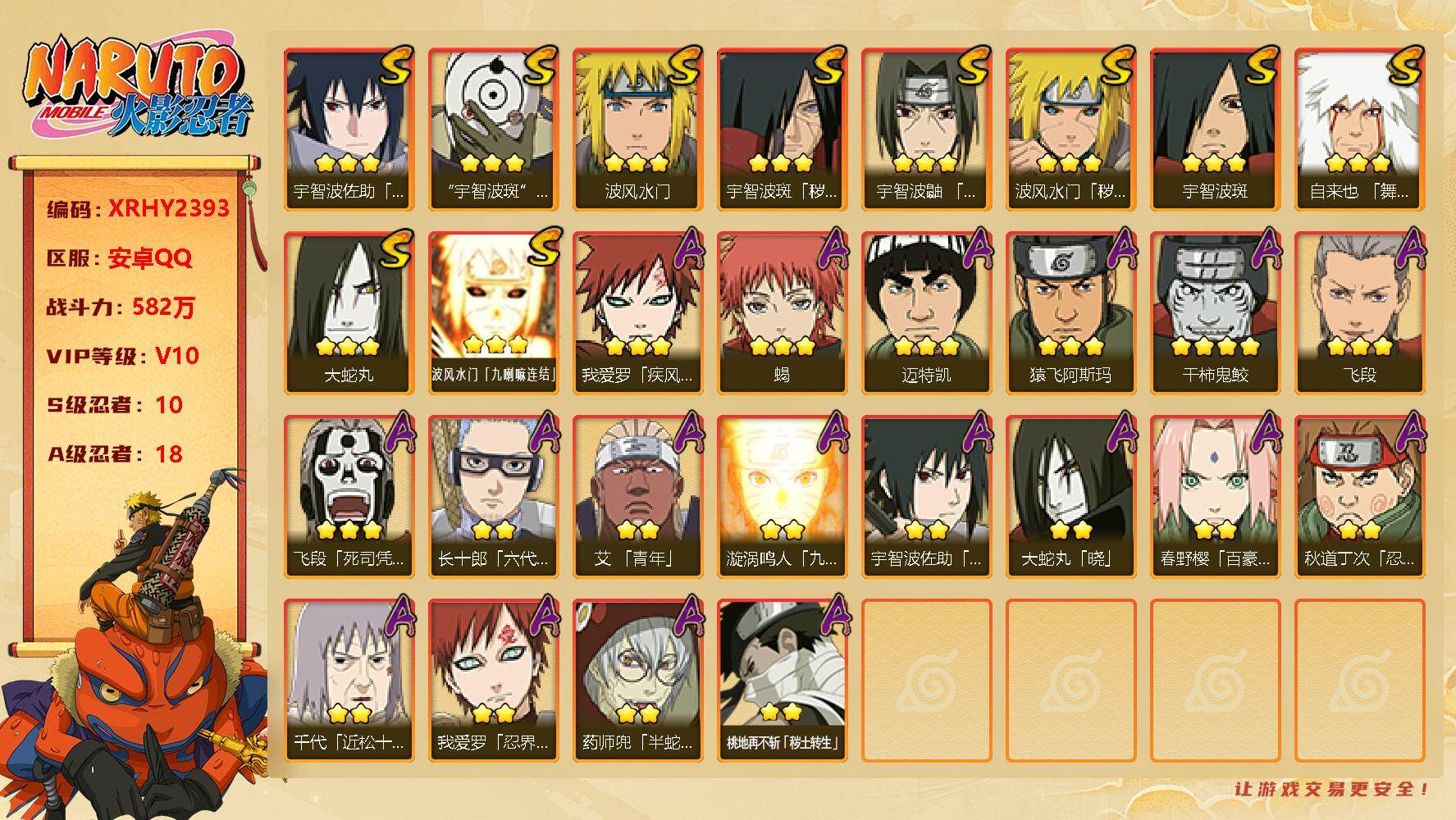 [13108521]Xr43445-安卓qq-10S级忍者数-18A级忍者数 【S级忍者】:波风水门「秽土转生」(3星),宇智波斑「秽土转生」(3星),宇智波鼬「须佐能乎」(3星),自来也「舞之豪杰」(3星),大蛇丸(3星),宇智波斑(3星),波风水门(3星),宇智波佐助「永恒万花筒」(3星),宇智波斑 「白面具」(3星宇智波斑「白面具」),波风水门「...