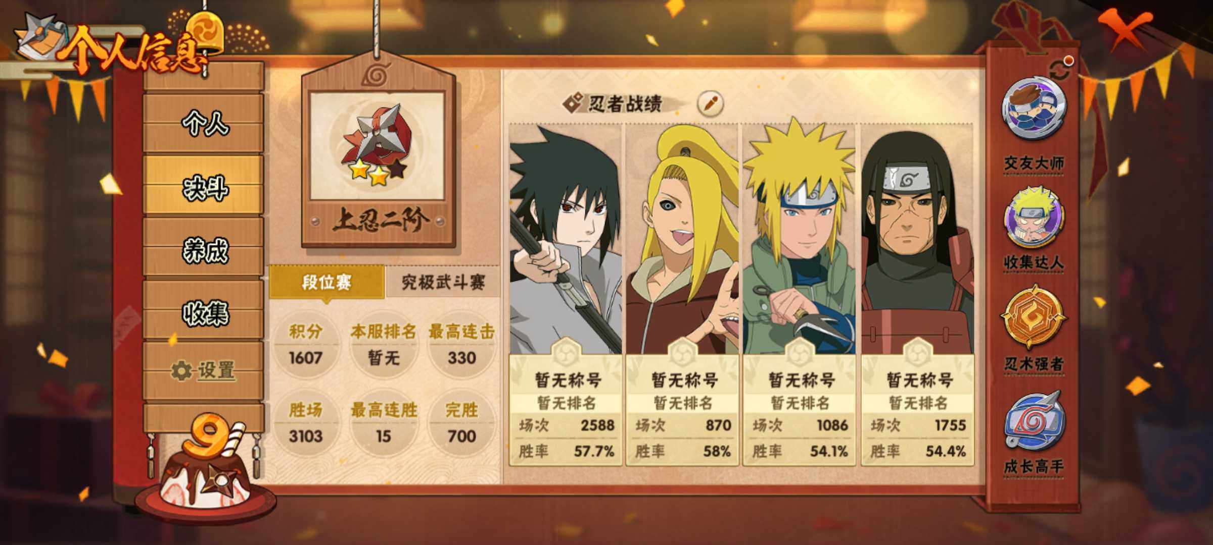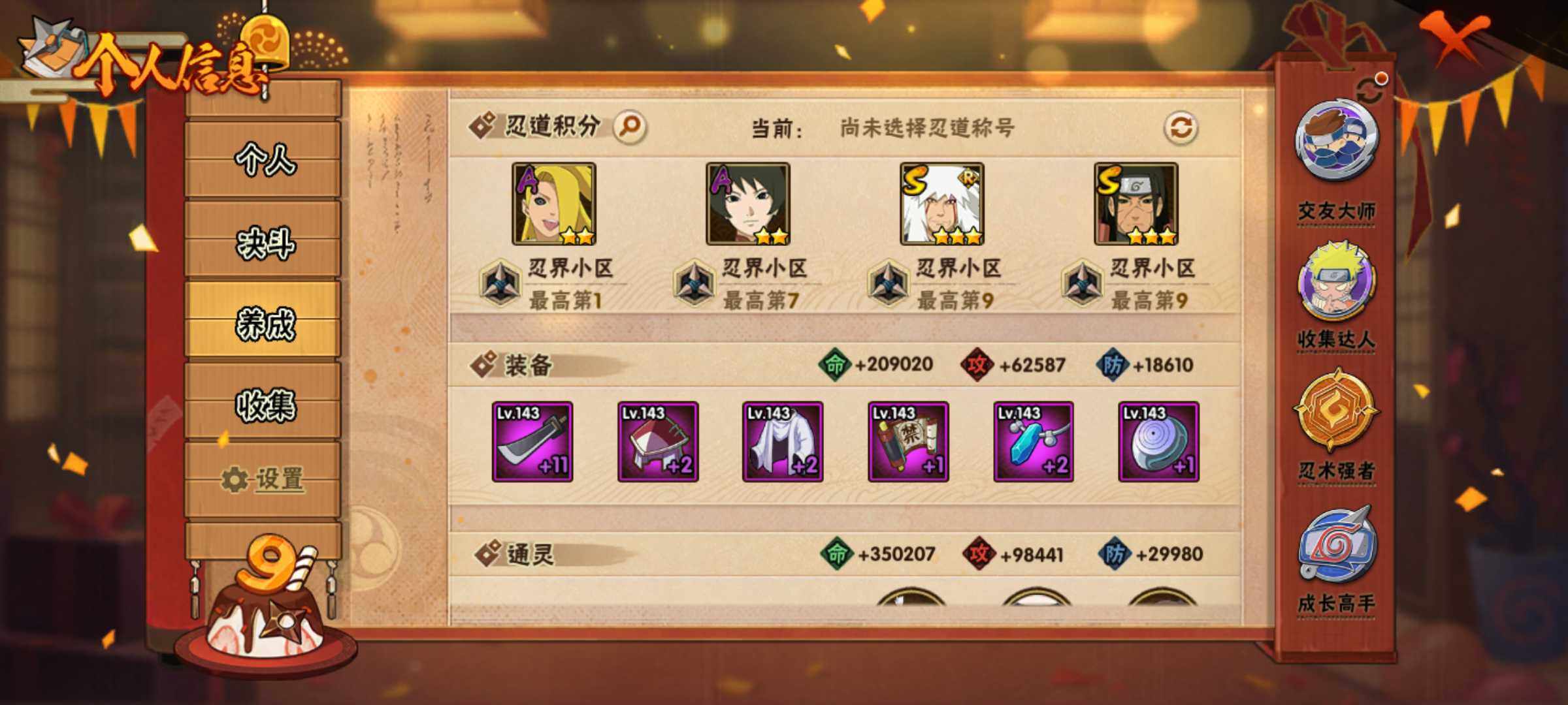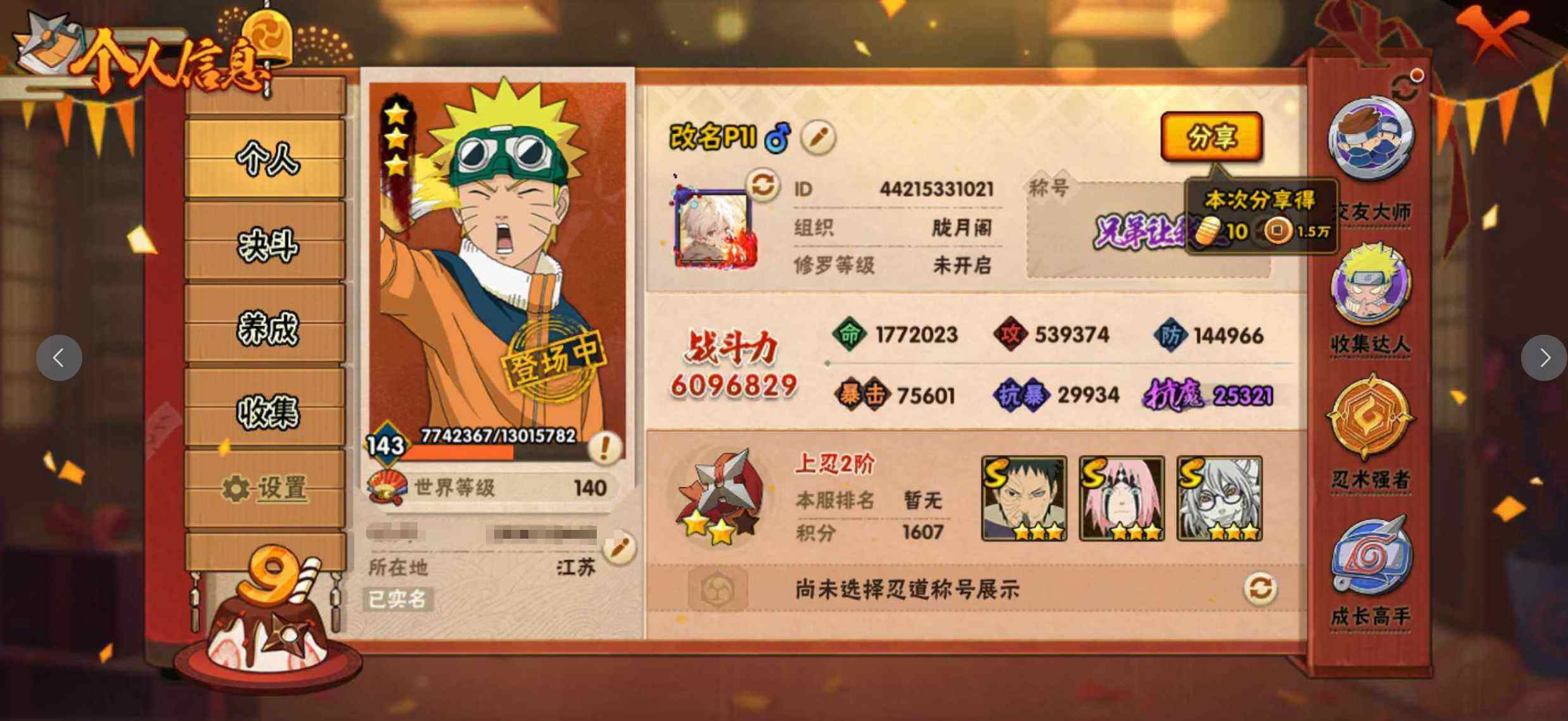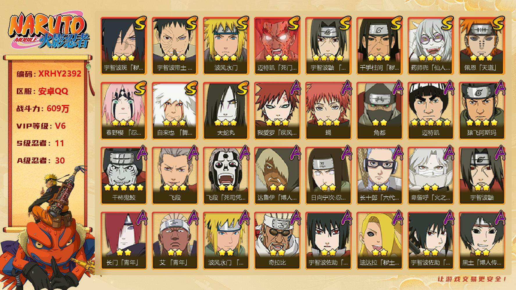 [13108524]Xr43439-安卓qq-可二次-11S级忍者数-30A级忍者数 【S级忍者】:千手柱间「秽土转生」(3星),宇智波斑「秽土转生·解」(3星),春野樱「忍界大战」(3星),宇智波带土「忍界大战」(3星),宇智波鼬「须佐能乎」(4星),自来也「舞之豪杰」(3星),大蛇丸(3星),波风水门(3星),药师兜「仙人模式」(3星),迈特凯「死...