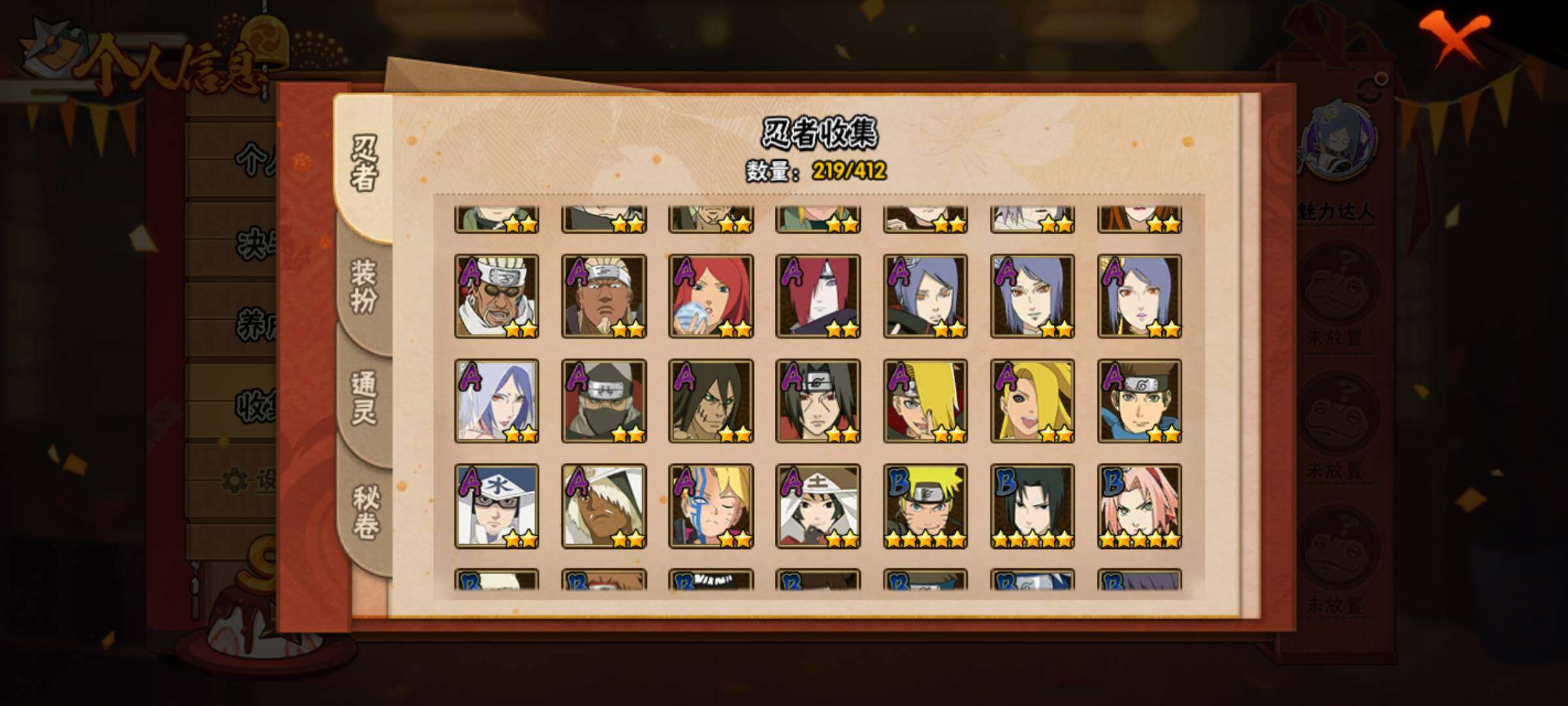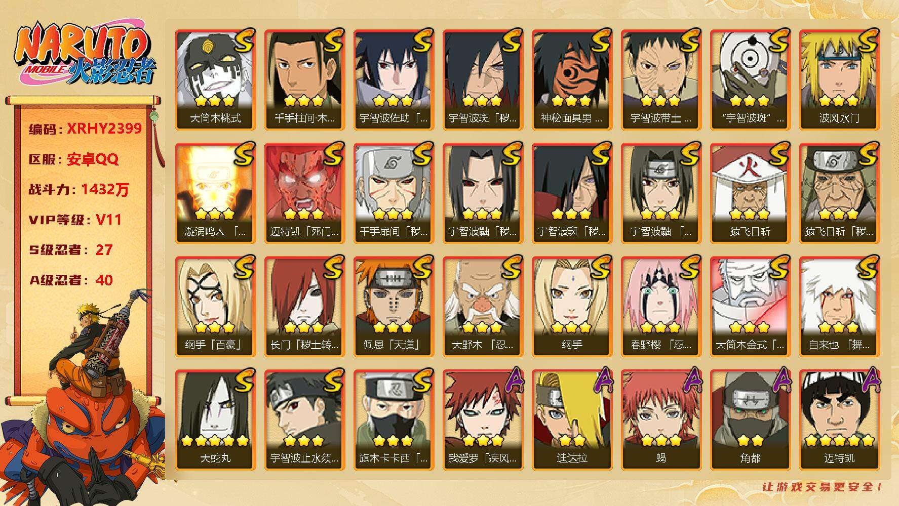 [13108526]Xr43480-安卓Q-区服2103-27S级忍者数-40A级忍者数 【S级忍者】:长门「秽土转生」(3星),猿飞日斩「秽土转生」(3星),千手扉间「秽土转生」(3星),宇智波鼬「秽土转生」(3星),宇智波斑「秽土转生」(3星),宇智波斑「秽土转生·解」(3星),大野木「忍界大战」(3星),春野樱「忍界大战」(3星),宇智波带土「忍...