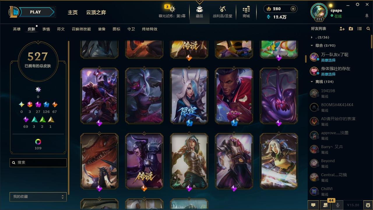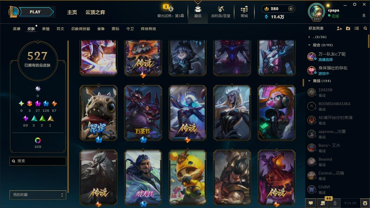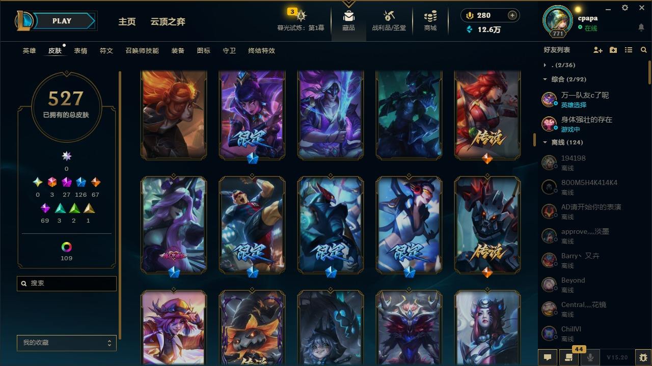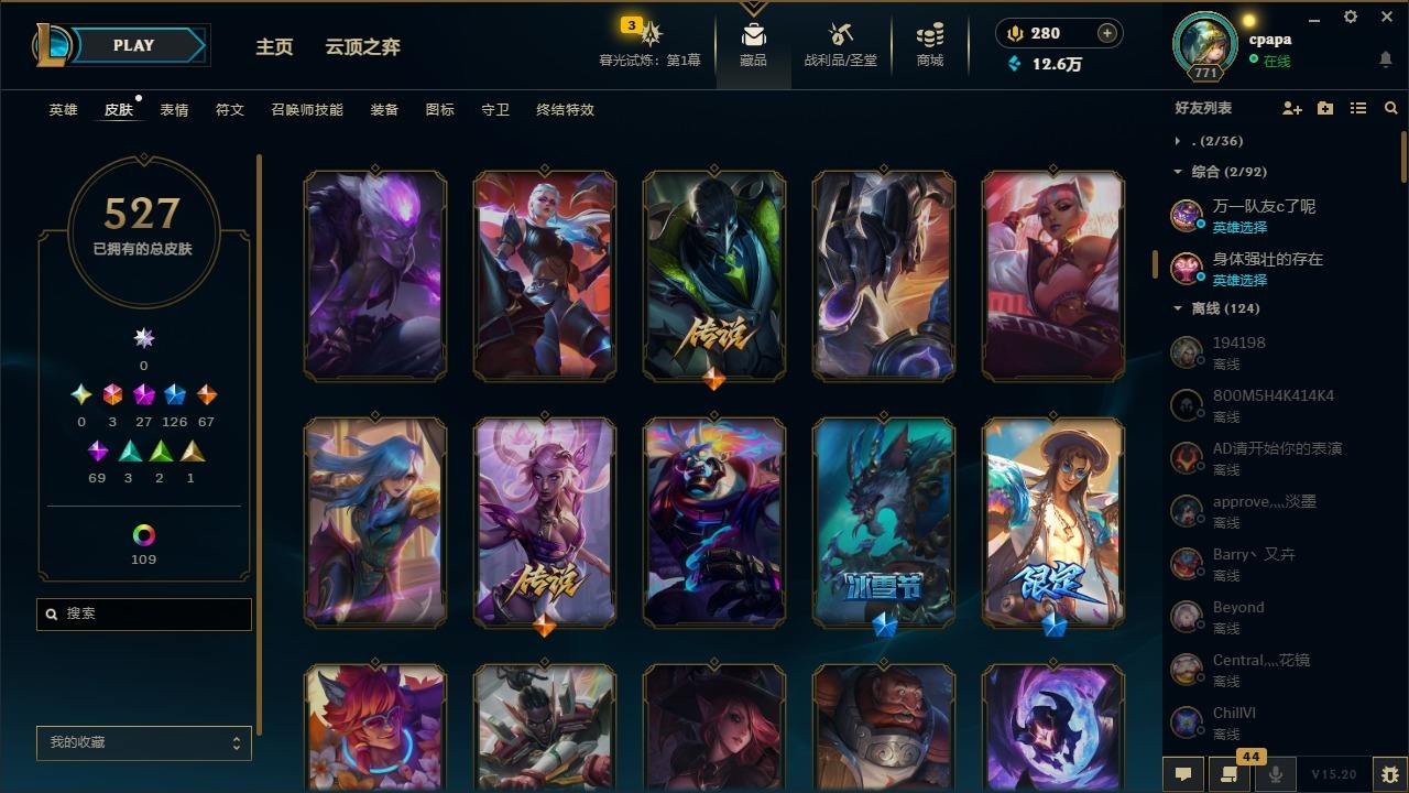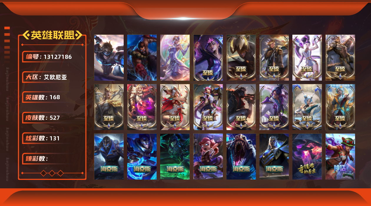 【11058274】[13127186]3终极 27神话 126限定 67传说 69史诗 527皮肤 131炫彩 168英雄 可二次 可修改实名 【至臻】:至臻 天龙之子 伊泽瑞尔,至臻 玉剑传说 琴仙子,至臻 暗星女王 黛安娜,至臻 黑夜使者 李青,至臻 灵能特工 伊泽瑞尔,至臻 K/DA ALL OUT卡莎,至臻 源计划:逆流 塞拉斯,至臻 魔女 乐芙兰,至臻 神龙尊者均衡之龙 沃利贝尔,至