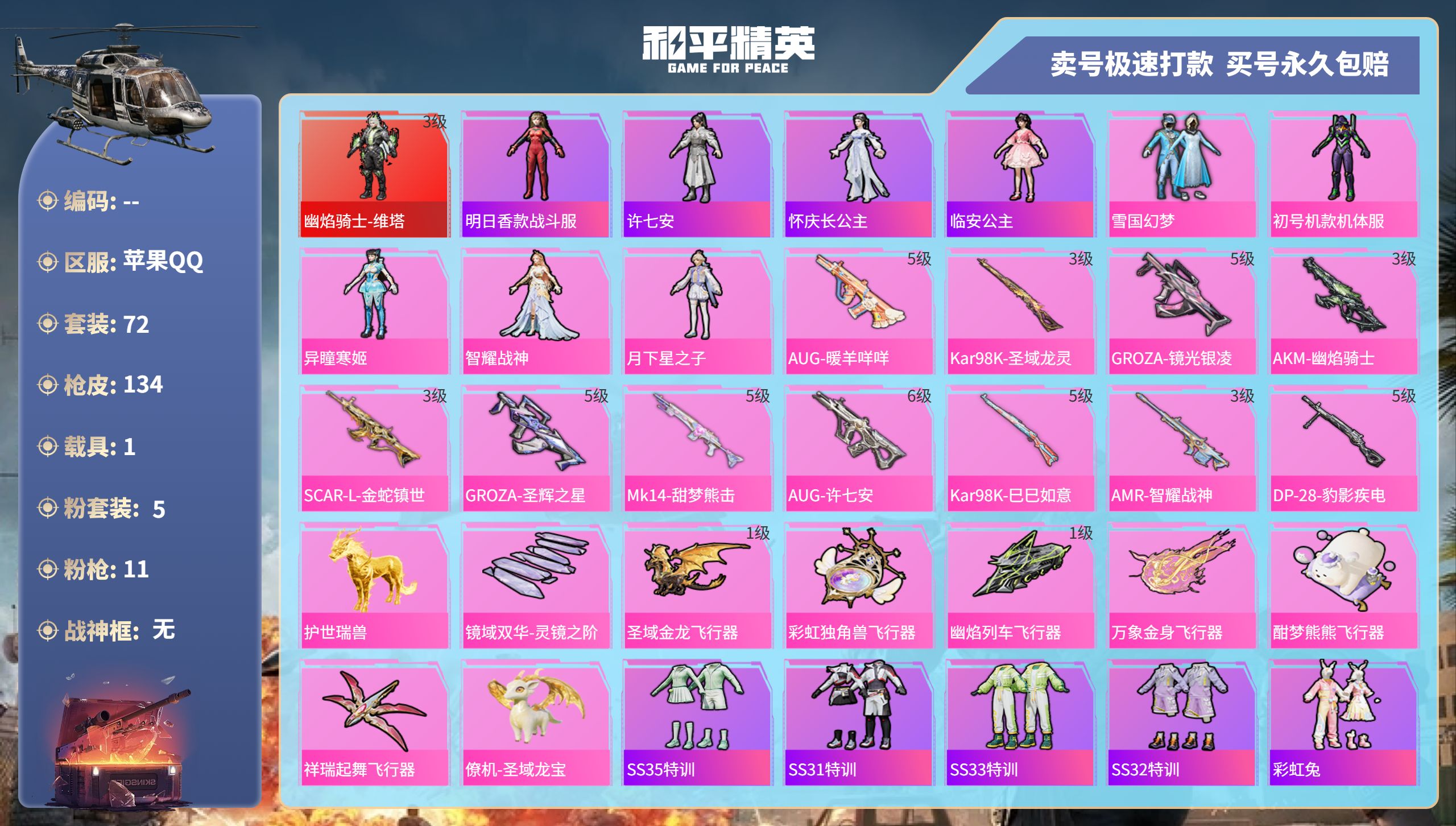 服务保障: 签约卖家 签约卖家安全可靠,90天内找回全额包赔。 快速交易 根据游戏种类不同,完成换绑后延时放款