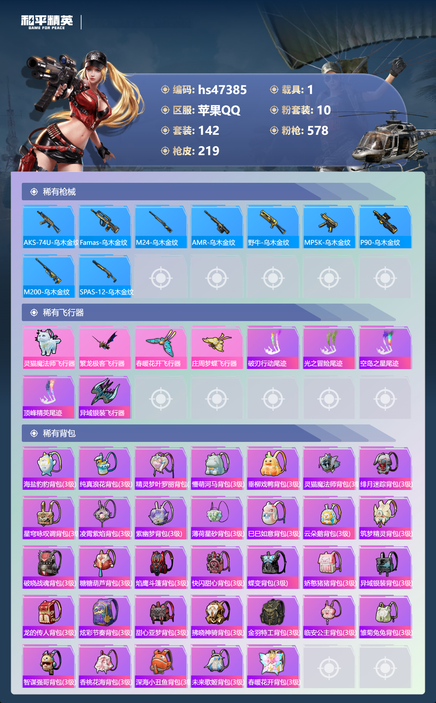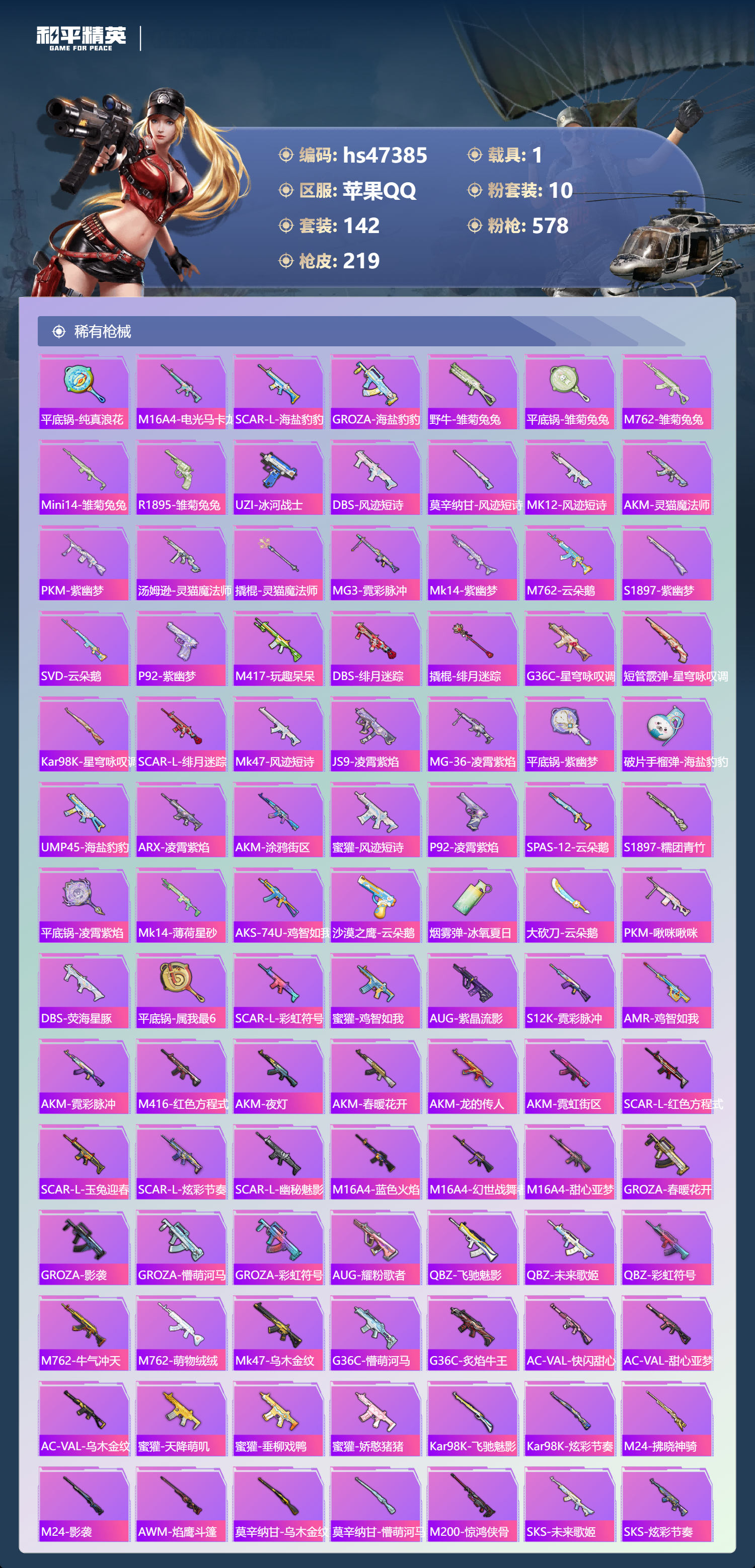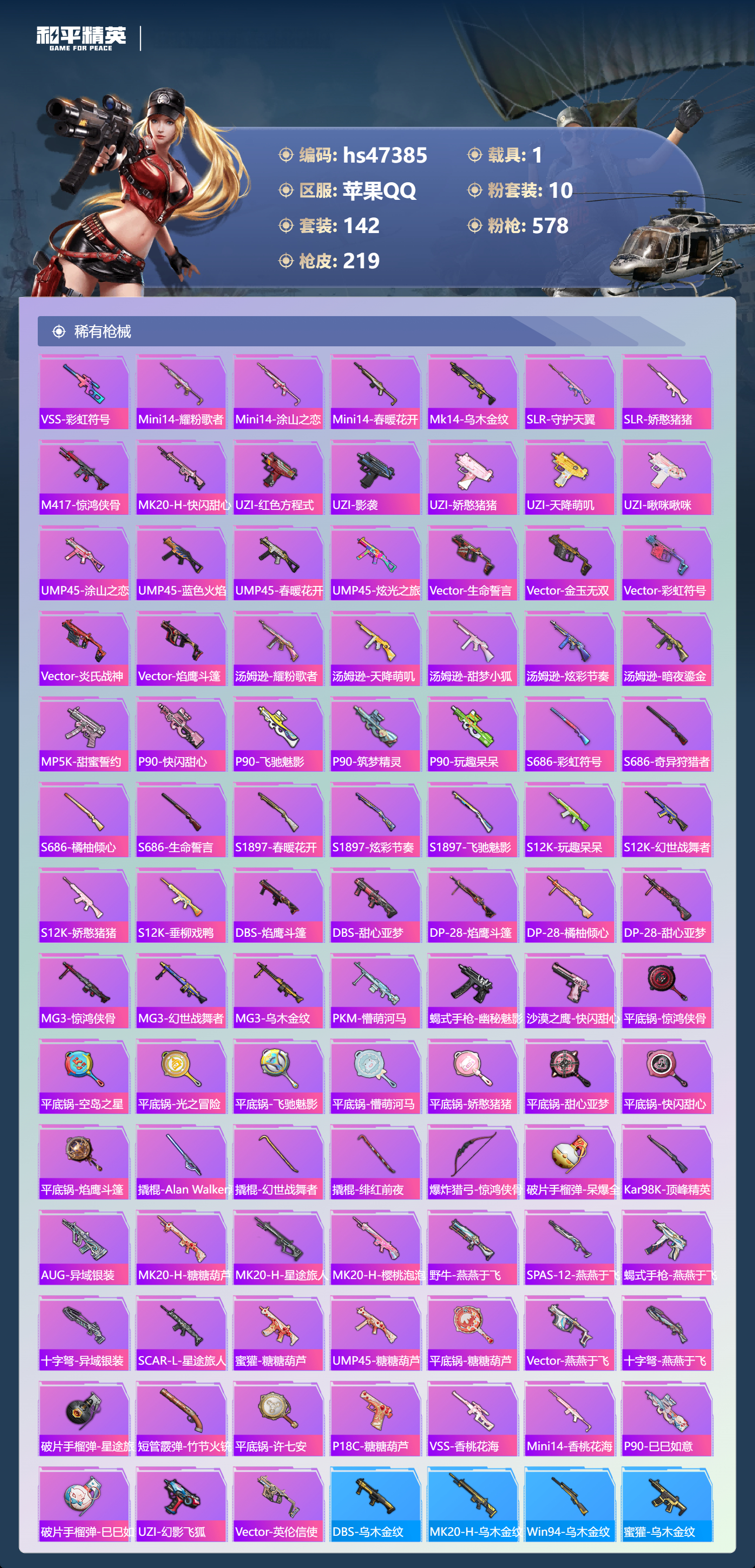 【11069499】【不可二次】【苹果QQ】龟仙人 红熊茄茄 水银刺客 S686-奇异狩猎者 AKM-星际浪客 漫步者 繁龙极客飞行器 合金龙骨绿色 Vector-环太平洋 春暖花开飞行器 忍者信条 庄周梦蝶飞行器 SCAR-L-锦绣绵绵 暗夜玫瑰 M416-心之恋语 缤纷油彩 蝶舞迷情 纯白誓言