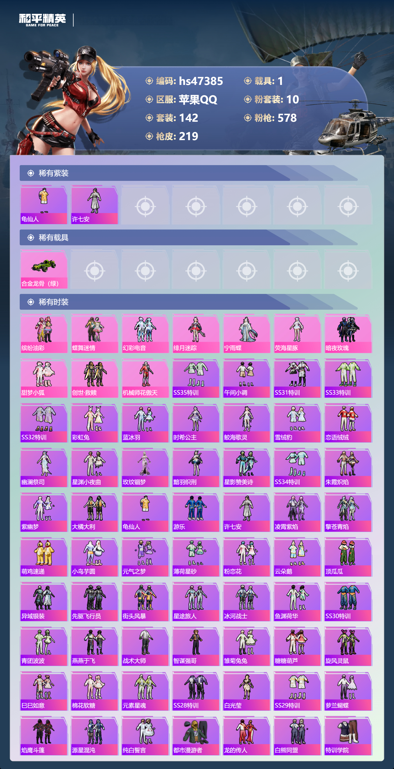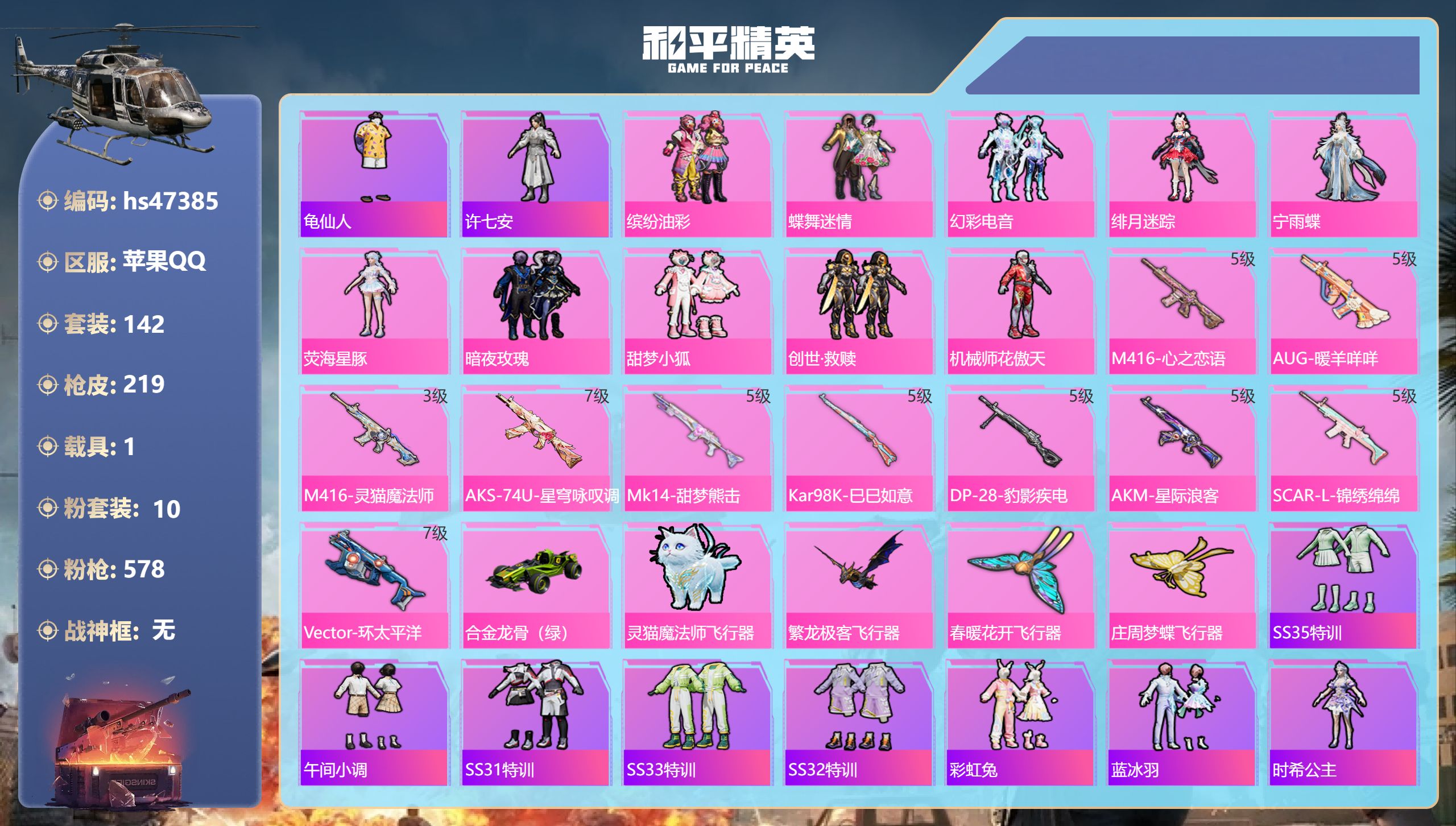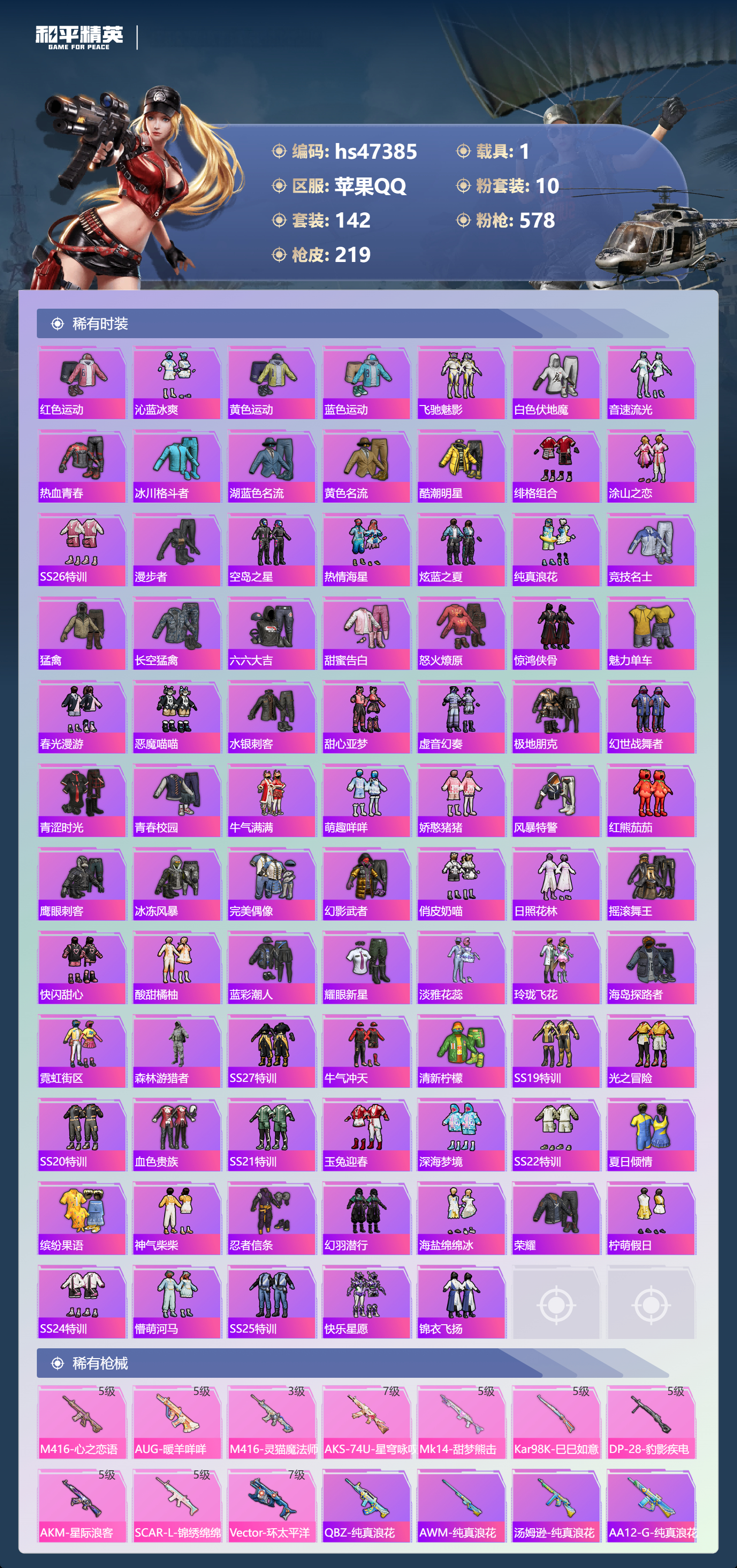 【11069499】【不可二次】【苹果QQ】龟仙人 红熊茄茄 水银刺客 S686-奇异狩猎者 AKM-星际浪客 漫步者 繁龙极客飞行器 合金龙骨绿色 Vector-环太平洋 春暖花开飞行器 忍者信条 庄周梦蝶飞行器 SCAR-L-锦绣绵绵 暗夜玫瑰 M416-心之恋语 缤纷油彩 蝶舞迷情 纯白誓言