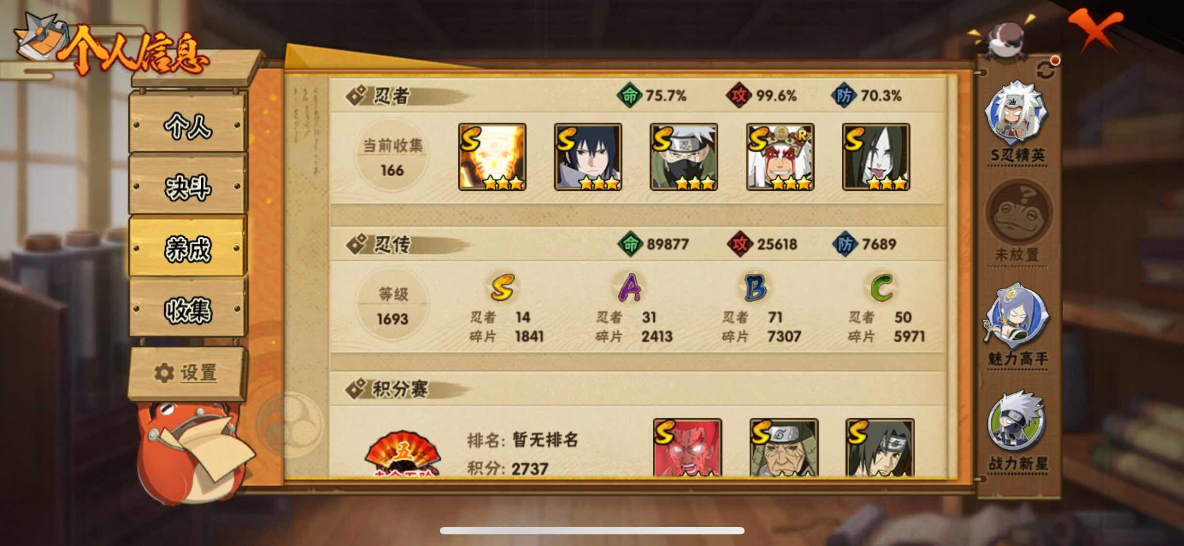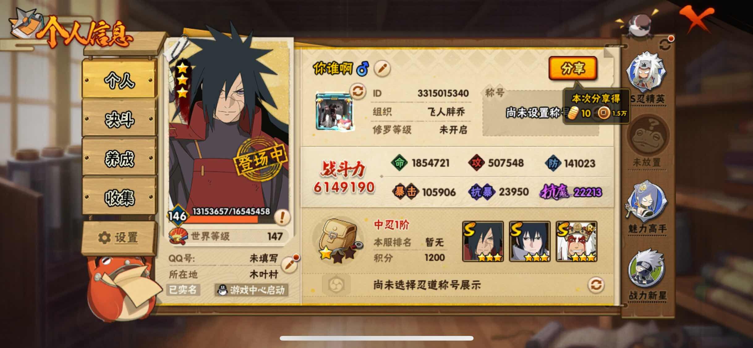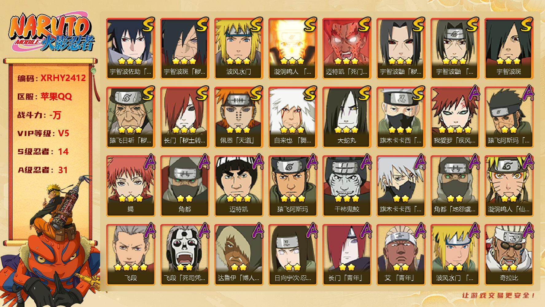 [13200305]Xr43746-果Q-14S级忍者数-31A级忍者数 【S级忍者】:长门「秽土转生」(3星),猿飞日斩「秽土转生」(3星),宇智波鼬「秽土转生」(3星),宇智波斑「秽土转生·解」(3星),宇智波鼬「须佐能乎」(3星),旗木卡卡西「须佐能乎」(3星),自来也「舞之豪杰」(3星),大蛇丸(3星),宇智波斑(3星),波风水门(3星),漩涡...