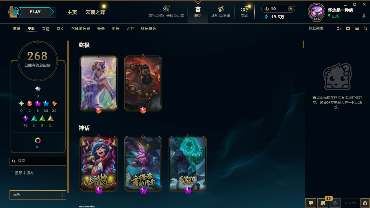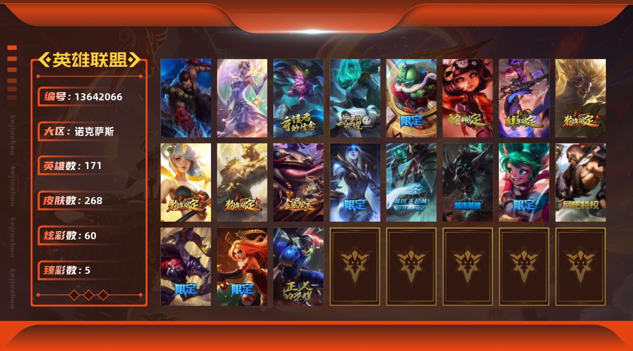 【11181262】[13642066]t30148【诺克萨斯】268皮肤 60炫彩 5臻彩 3神话/33限定/22传说/171英雄 账号等级:414【重要头像】春晖神女拉克丝 幼犬内瑟斯 【重要皮肤】永恒之森奥恩 胜利之王泰达米尔 春晖神女拉克丝 你看见过我的熊猫吗安妮 北辰之威内瑟斯 南天之怒沃里克 玉净夜叉凯特琳 纳财大帝塔姆 胜利女神奥莉安娜 胜利枪神格雷福斯 胜