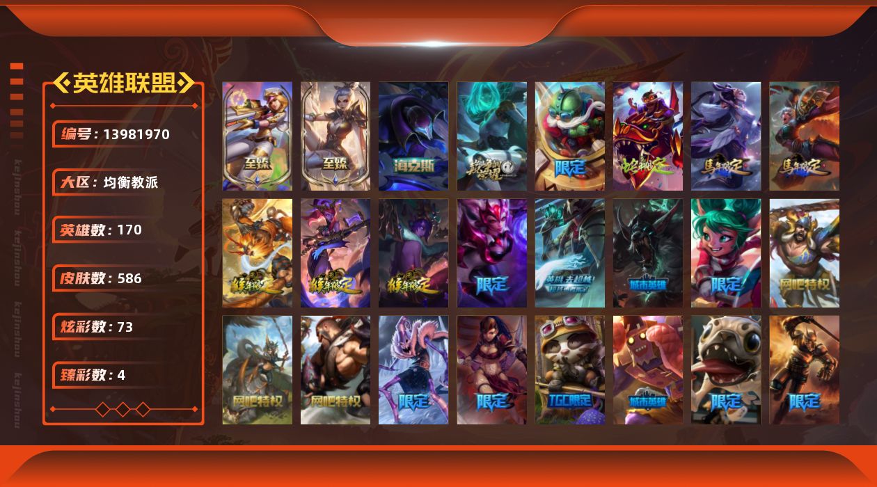 【75866】[13981970]t30846 皇冠账号【均衡教派】原皮龙瞎 586皮肤 73炫彩 4臻彩 5神话/89限定/49传说/170英雄 账号等级:466 单双排段位:白银 【重要头像】电玩女神凯特琳 【重要皮肤】电玩女神凯特琳至臻 玉剑传说武剑仙至臻 海克斯科技魔腾 生化领主泰达米尔 勇敢的心德莱厄斯 电玩女神厄运小姐 电玩勇者锐雯 电玩女神阿狸 星之守护者伊泽瑞