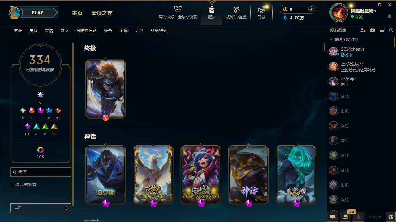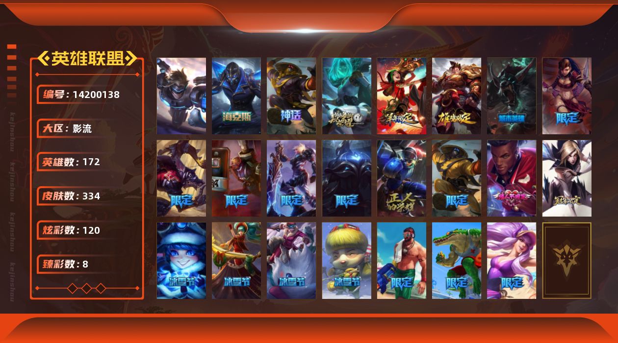【85111】[14200138]t31374【影流】334皮肤 120炫彩 8臻彩 5神话/35限定/23传说/172英雄 账号等级:540 单双排段位:青铜【重要头像】击拳 披萨鸡 【重要皮肤】新卧虎藏龙贾克斯 点心宝贝阿木木 天龙之子斯莫德 神龙烈焰金克丝 定海神珍孙悟空 张辽文远 胜利机器人布里茨 胜利枪神卢锡安 胜利之剑亚托克斯 觅心游侠卢锡安 寒冬精灵璐璐