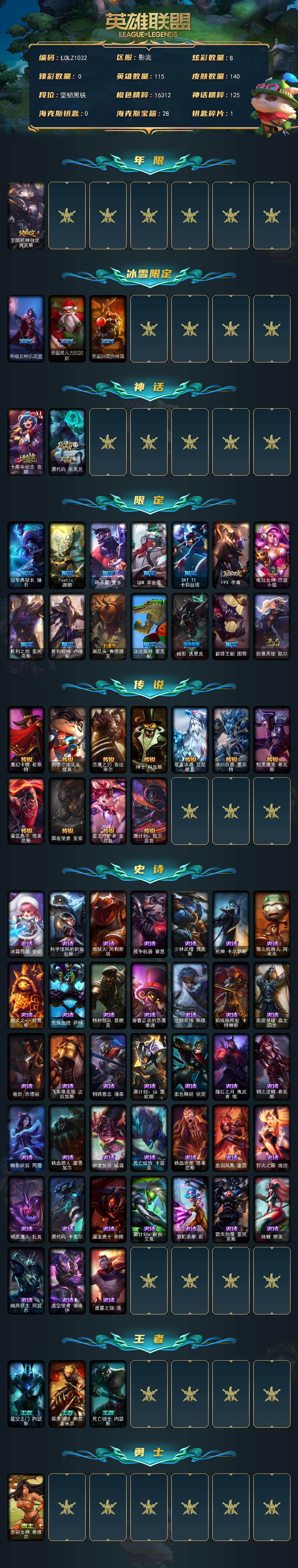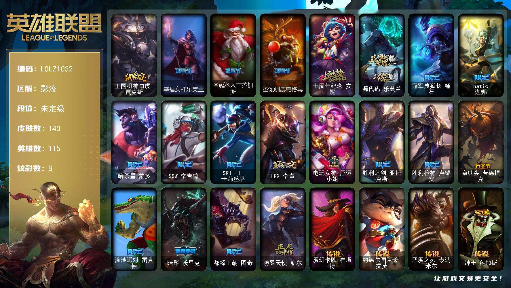 【85416】【LOLZ1032】115英雄/140皮肤/2神话/18限定/8炫彩/11传说/38史诗/未定级/王国机神白虎贾克斯/幸福女神乐芙兰/圣诞老人古拉加斯/圣诞驯鹿克格莫/十周年纪念安妮/源代码乐芙兰/冠军典狱长锤石/Fnatic迦娜/暗杀星蒙多/SSW辛吉德/SKTT1卡莉丝塔/FPX李青/电玩女神厄运小姐/胜利之剑亚托克斯/胜利枪神卢锡安/南瓜头费德提克/泳池派对雷克顿/暗影妖狐阿
