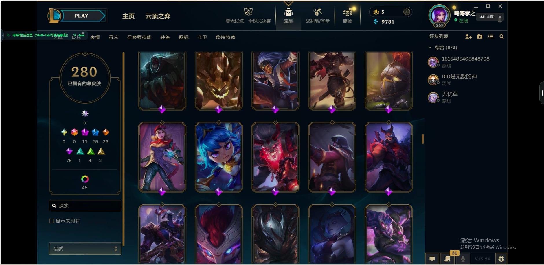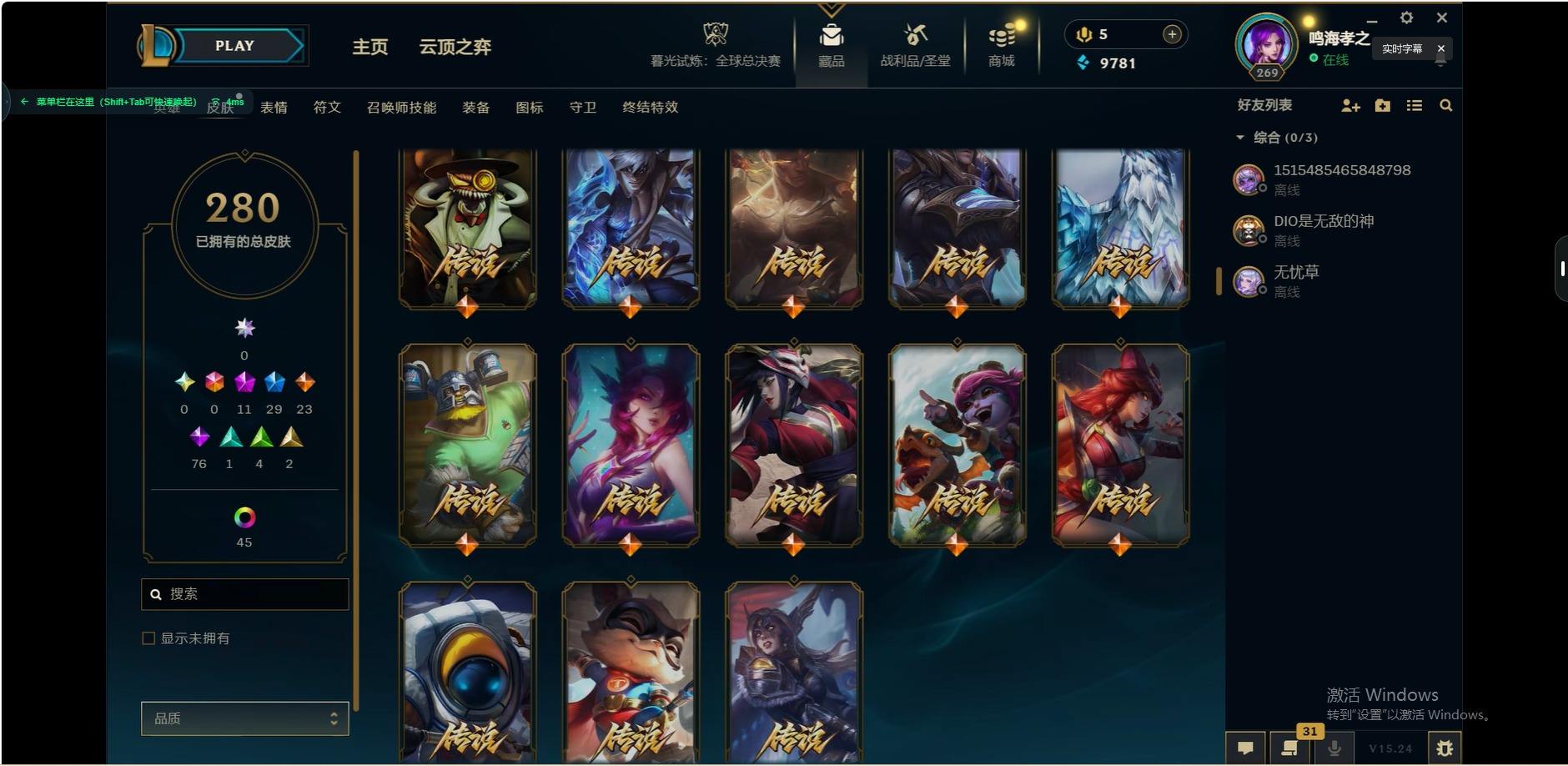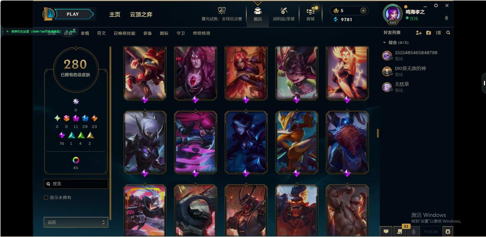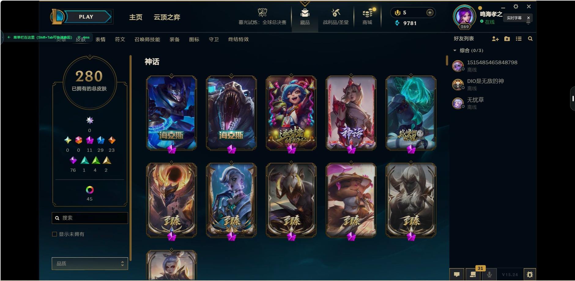 【120302】[14426689]11神话 29限定 23传说 76史诗 280皮肤 51炫彩 169英雄 可二次 可修改实名 【至臻】:至臻 北极星钢影 卡蜜尔,至臻 腥红之月 亚托克斯,至臻 玉剑传说 武剑仙,至臻 黑夜使者 李青,至臻 暗星 墨菲特,至臻 灵魂莲华 提莫,水晶圣骑 艾希 【海克斯】:海克斯 嘉文四世,海克斯 雷克顿 【赛季限定皮】:胜利女神 娑娜,胜利巨口 克格莫,胜利