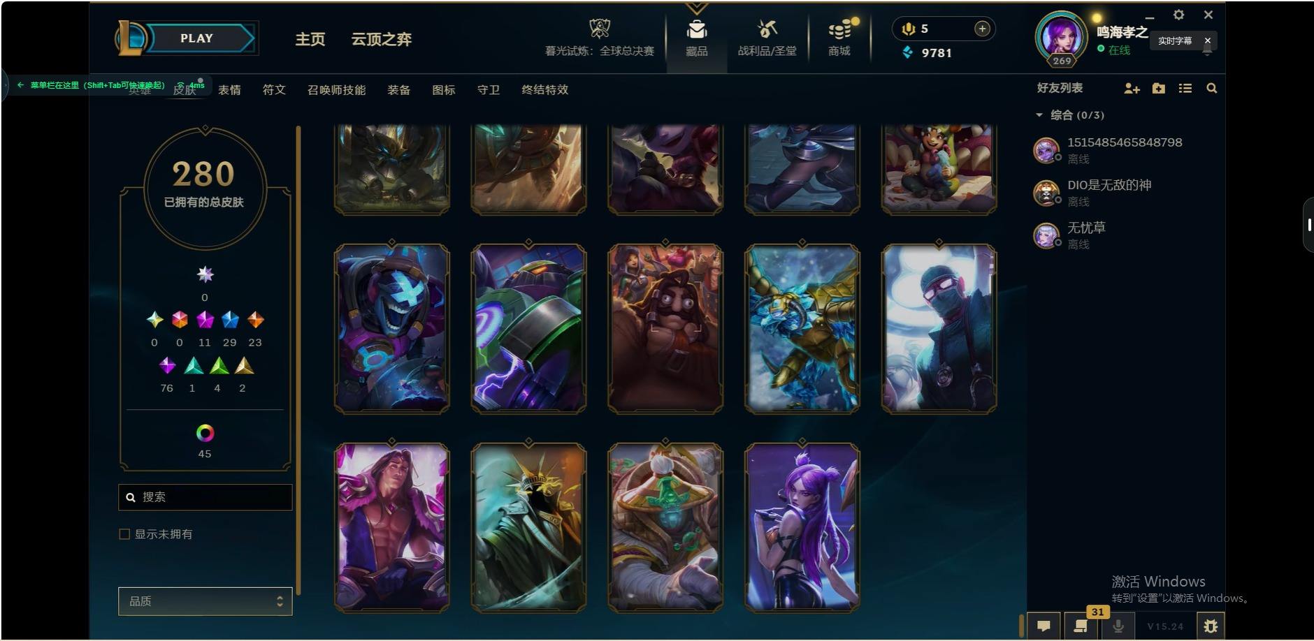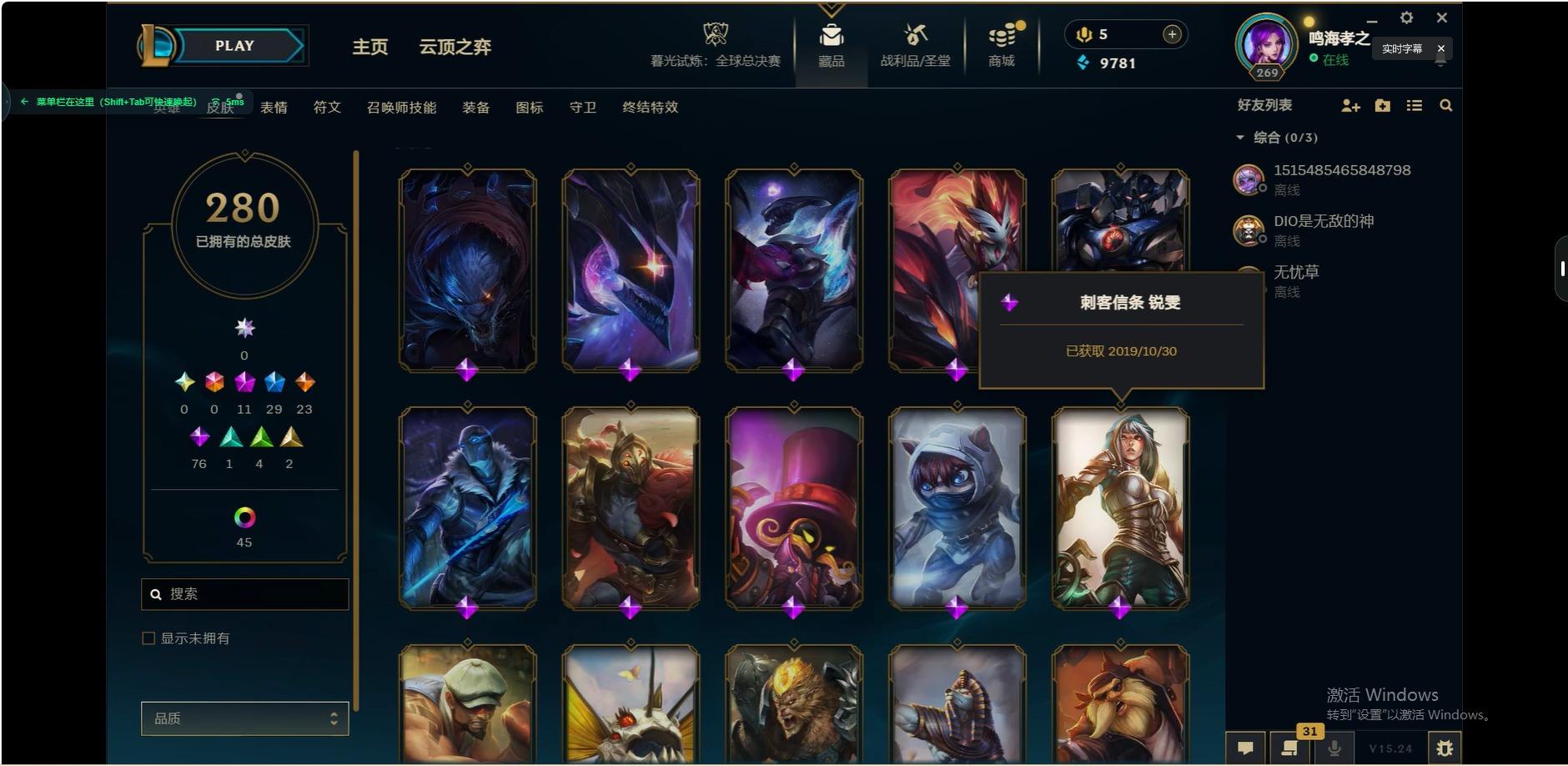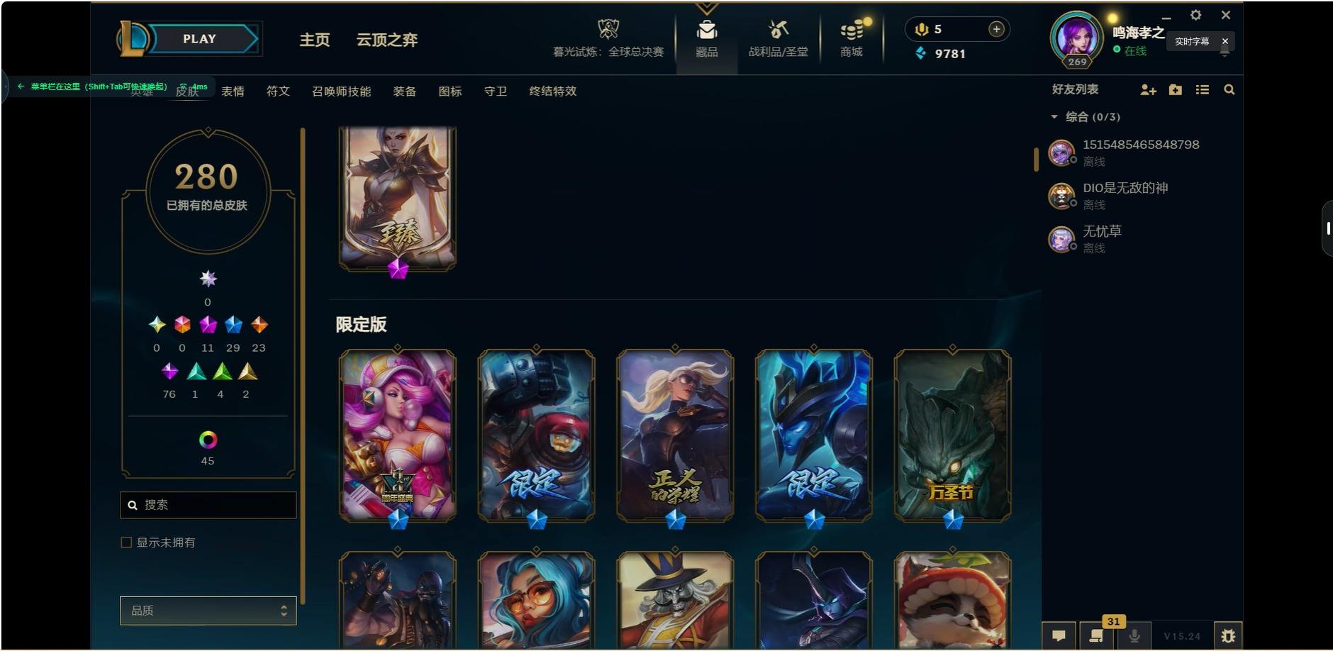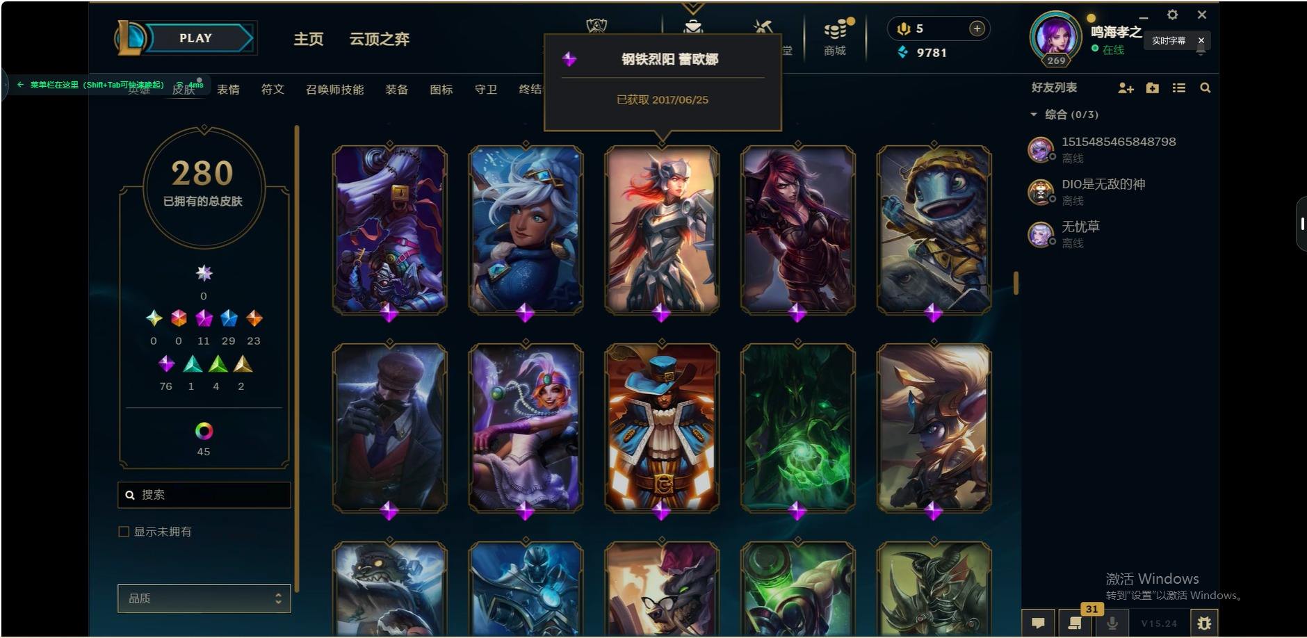 【120302】[14426689]11神话 29限定 23传说 76史诗 280皮肤 51炫彩 169英雄 可二次 可修改实名 【至臻】:至臻 北极星钢影 卡蜜尔,至臻 腥红之月 亚托克斯,至臻 玉剑传说 武剑仙,至臻 黑夜使者 李青,至臻 暗星 墨菲特,至臻 灵魂莲华 提莫,水晶圣骑 艾希 【海克斯】:海克斯 嘉文四世,海克斯 雷克顿 【赛季限定皮】:胜利女神 娑娜,胜利巨口 克格莫,胜利