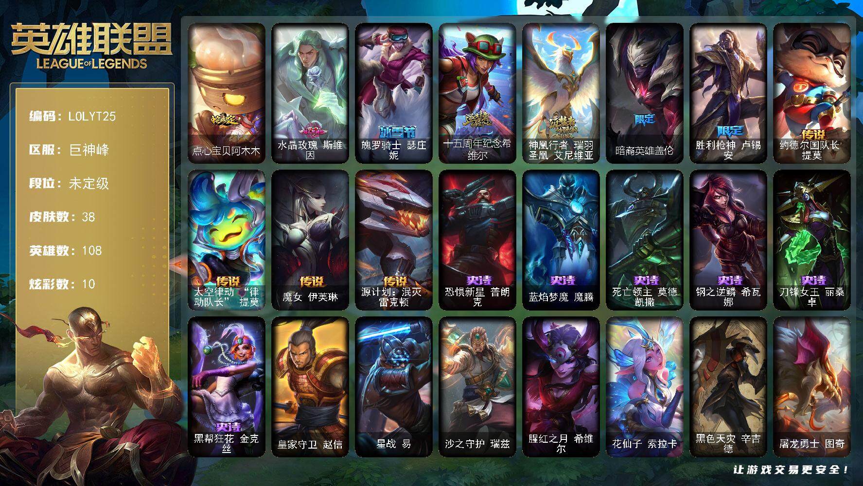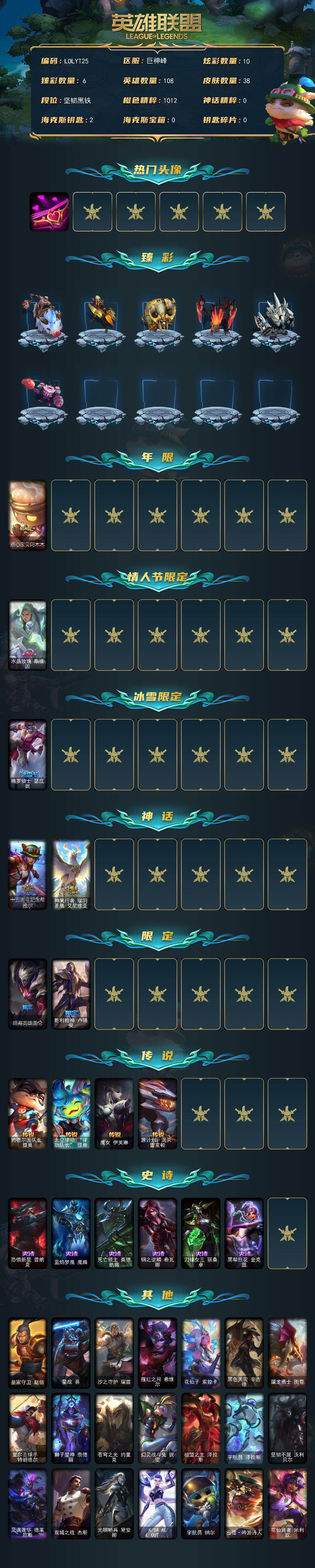 【123832】【LOLYT25】108英雄/38皮肤/2神话/5限定/6臻彩/10炫彩/4传说/6史诗/未定级/爱情之歌/无畏骑士瑟庄妮赤子初心/征服者韦鲁斯炫金/征服者阿利斯塔炫金/山海绘卷科加斯朱红/霸天巨兽雪崩墨菲特/可爱可爱粉红红布里茨/点心宝贝阿木木/水晶玫瑰斯维因/魄罗骑士瑟庄妮/十五周年纪念希维尔/神凰行者瑞羽凤凰艾尼维亚/暗裔英雄盖伦/胜利枪神卢锡安/约德尔国队长提莫/太空律动