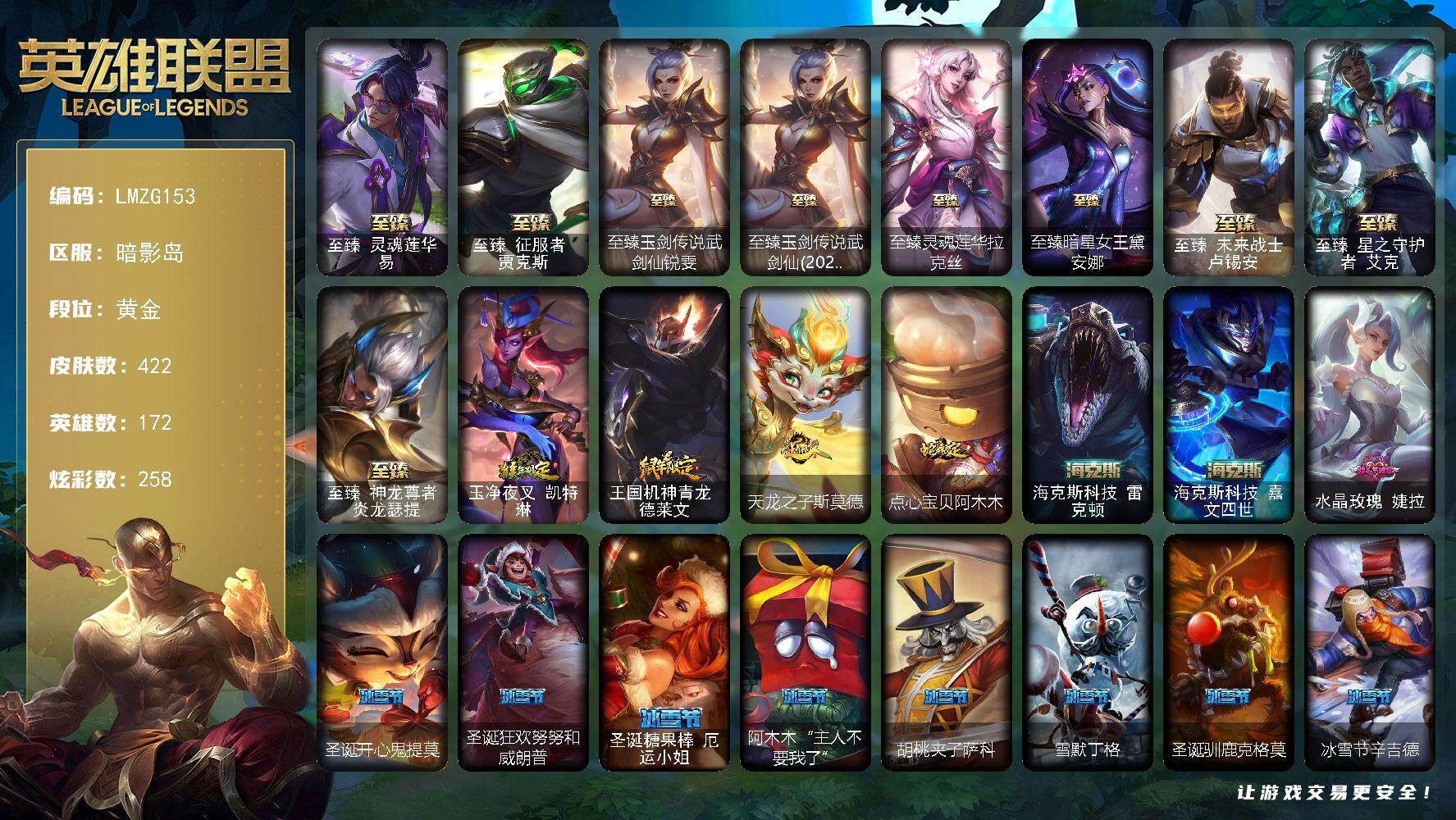 【138377】【LMZG153】172英雄/422皮肤/3终极/15神话/51限定/14臻彩/258炫彩/34传说/86史诗/黄金/红包/至臻灵魂莲华易/至臻征服者贾克斯/至臻玉剑传说武剑仙/至臻玉剑传说武剑仙(2022)/至臻灵魂莲华拉克丝/至臻暗星女王黛安娜/至臻未来战士卢锡安/至臻星之守护者艾克/至臻神龙尊者炎龙瑟提/天龙之子卡莎飞龙乘云/无畏骑士瑟庄妮赤子初心/墨之影武者亚索金墨耀影/