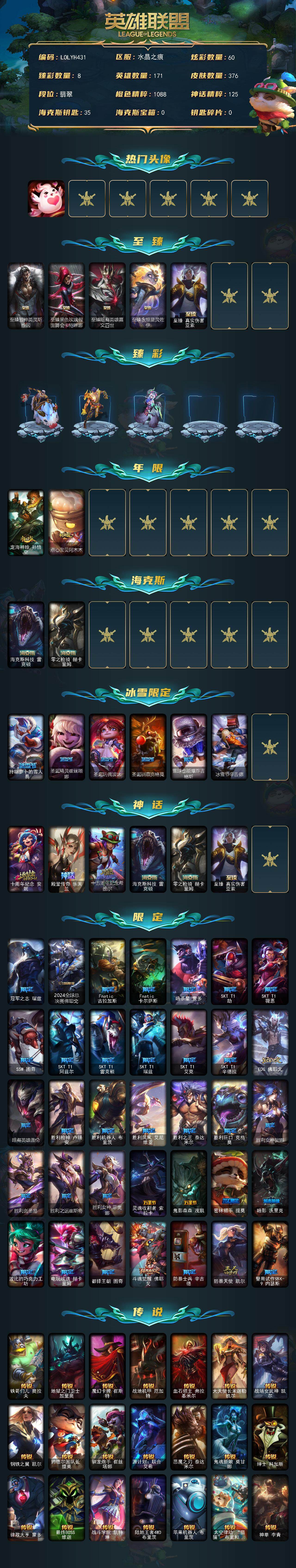 【139370】【LOLYH431】171英雄/376皮肤/10神话/43限定/8臻彩/60炫彩/41传说/88史诗/流光翡翠/爱情鸽/至臻狼神英灵斯维因/至臻黑色玫瑰假面舞会卡特琳娜/至臻暗裔英雄嘉文四世/至臻永恒星灵佐伊/至臻真实伤害亚索/天龙之子卡莎飞龙乘云/无畏骑士瑟庄妮赤子初心/神龙尊者圣龙李青龙腾云起/星之守护者奥莉安娜未来之光/灵魂莲华亚索霜见之时/殿堂传奇乐芙兰登神/魔女阿卡丽虚