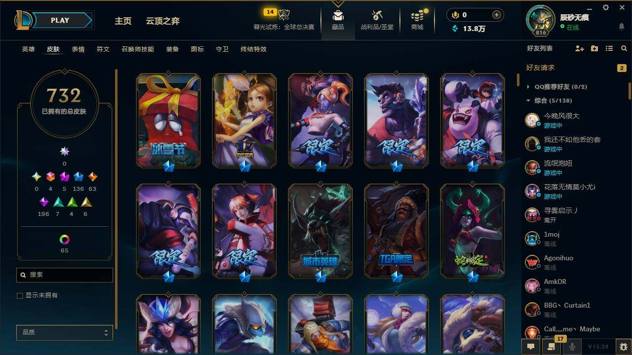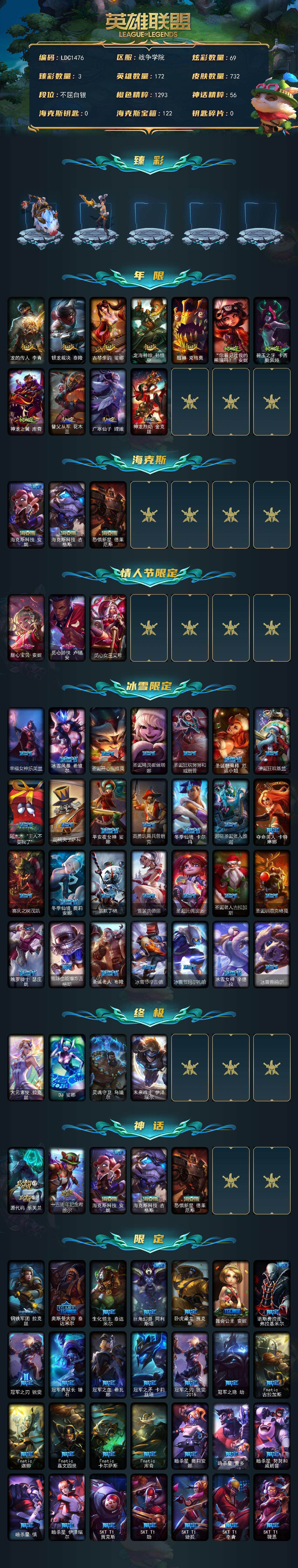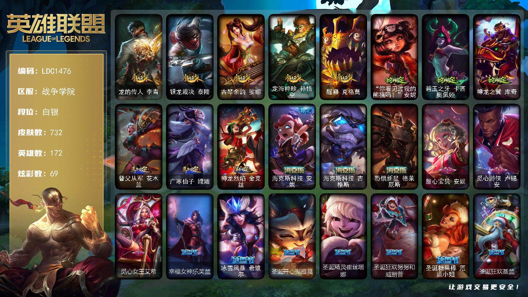 【140294】【LDC1476】172英雄/732皮肤/4终极/5神话/136限定/3臻彩/69炫彩/63传说/196史诗/白银账号等级:816/无畏骑士瑟庄妮赤子初心/雾雨之刃锐雯/龙的传人李青/银龙裁决泰隆/古琴余韵娑娜/定海神针孙悟空/醒狮克格莫/“你看见过我的熊猫吗?”安妮/碧玉之牙卡西奥佩娅/神龙之翼库奇/替父从军花木兰/广寒仙子嫦娥/神龙烈焰金克丝/海克斯科技安妮/海克斯科技吉格斯