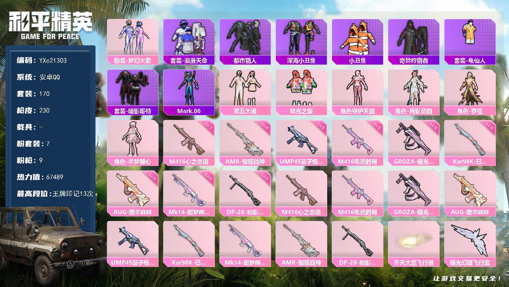 【143155】【可二次】【安卓QQ】软萌银虎 龟仙人 梦幻火箭降落伞 都市猎人 奇异狩猎者 齐天大圣飞行器 极速红龙 M762-奇异狩猎者 M416-电玩时刻 UMP45-量子极限 梦幻火箭 M416-心之恋语 深海小丑鱼 浪漫天命 暗影哥特 旋转彩虹降落伞 未来战士降落伞 AKM-奇异狩猎者