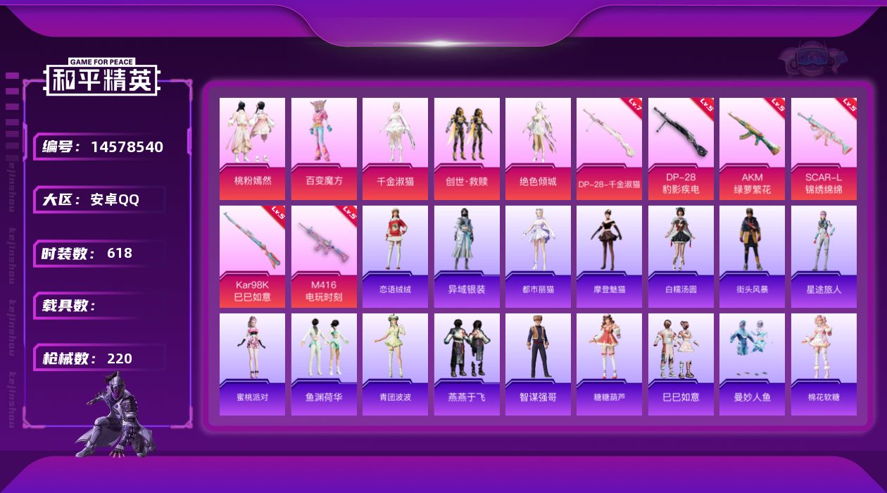 【143163】【不可二次】【安卓QQ】M416-电玩时刻 SCAR-L-锦绣绵绵 龟仙人 AKM-绿萝繁花 千面幻镜飞行器 极速红龙 M762-风花雪月