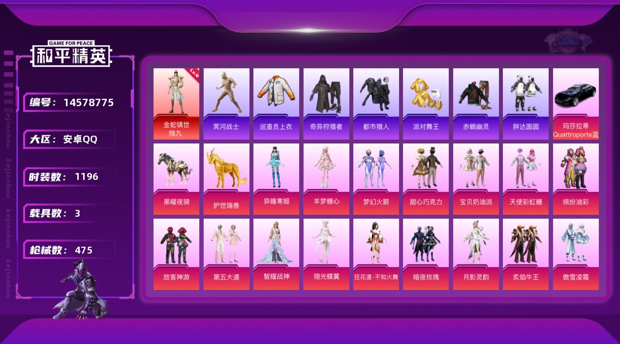 【143195】【可二次】【安卓QQ】龟仙人 水银刺客 漫步者 都市猎人 Mini14-林间仙鹿 快乐主宰 M416-心之恋语 缤纷油彩 浪漫波比 M416-超新星 AWM-黄金龙骨 纯白誓言 AKM-奇异狩猎者 迅捷狂鲨 M762-瑞龙福将 齐天大圣飞行器 新侠客行 狂沙舞者 SCAR-L-锦绣绵绵 AKM-炫紫旋律 金风玉露 暗夜玫瑰 AKM-梦之光华 天之羽翼飞行器 SKS-碧影闪光 神秘
