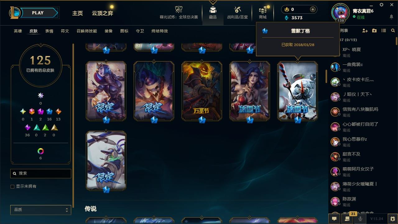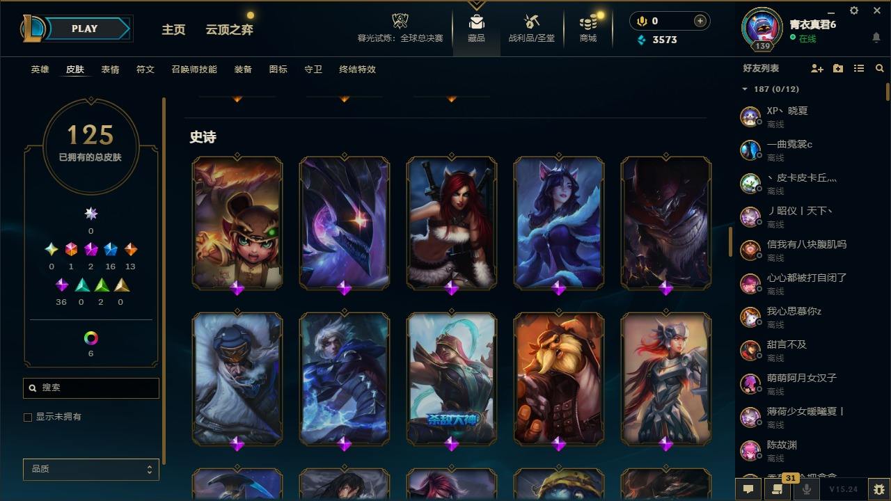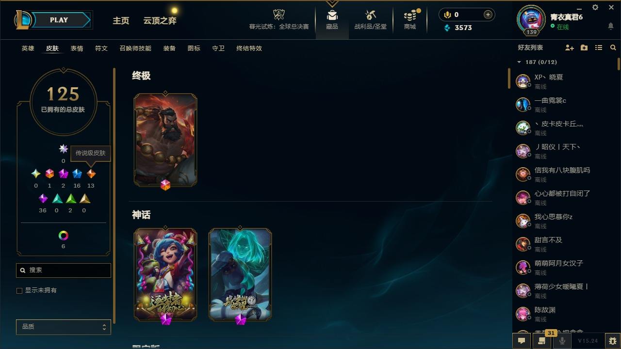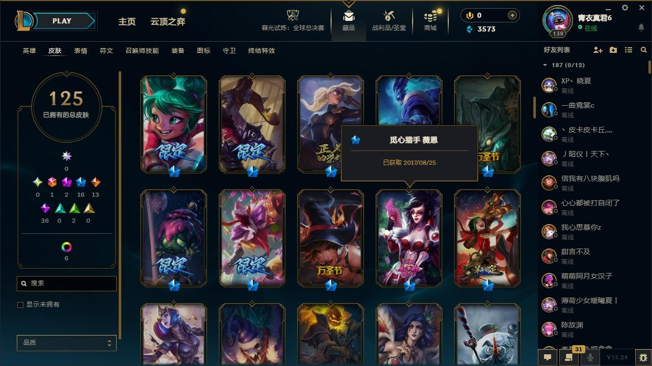 【144334】[14585351]1终极 2神话 16限定 13传说 36史诗 125皮肤 11炫彩 144英雄 可二次 可修改实名 【情人节限定】:觅心猎手 薇恩【赛季限定皮】:胜利女神 奥莉安娜【冠军限定系列】:S4 SSW 锤石【冰雪节限定】:幸福女神 乐芙兰,雪默丁格【万圣节限定】:鬼影森森 茂凯,魅惑女巫 奈德丽,无头骑士 赫卡里姆【年限】:神龙烈焰 金克丝【周年】:10周年 安妮【