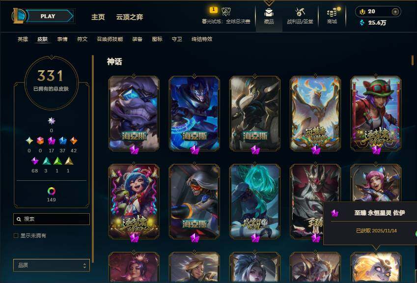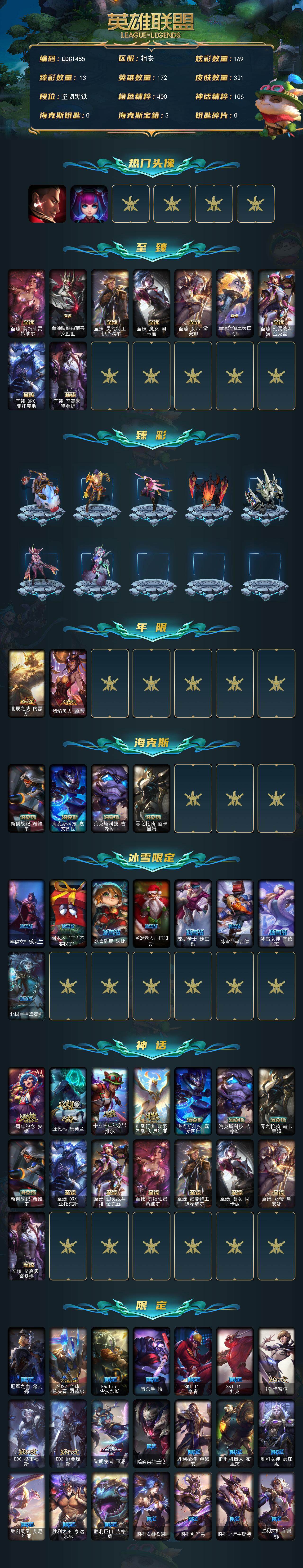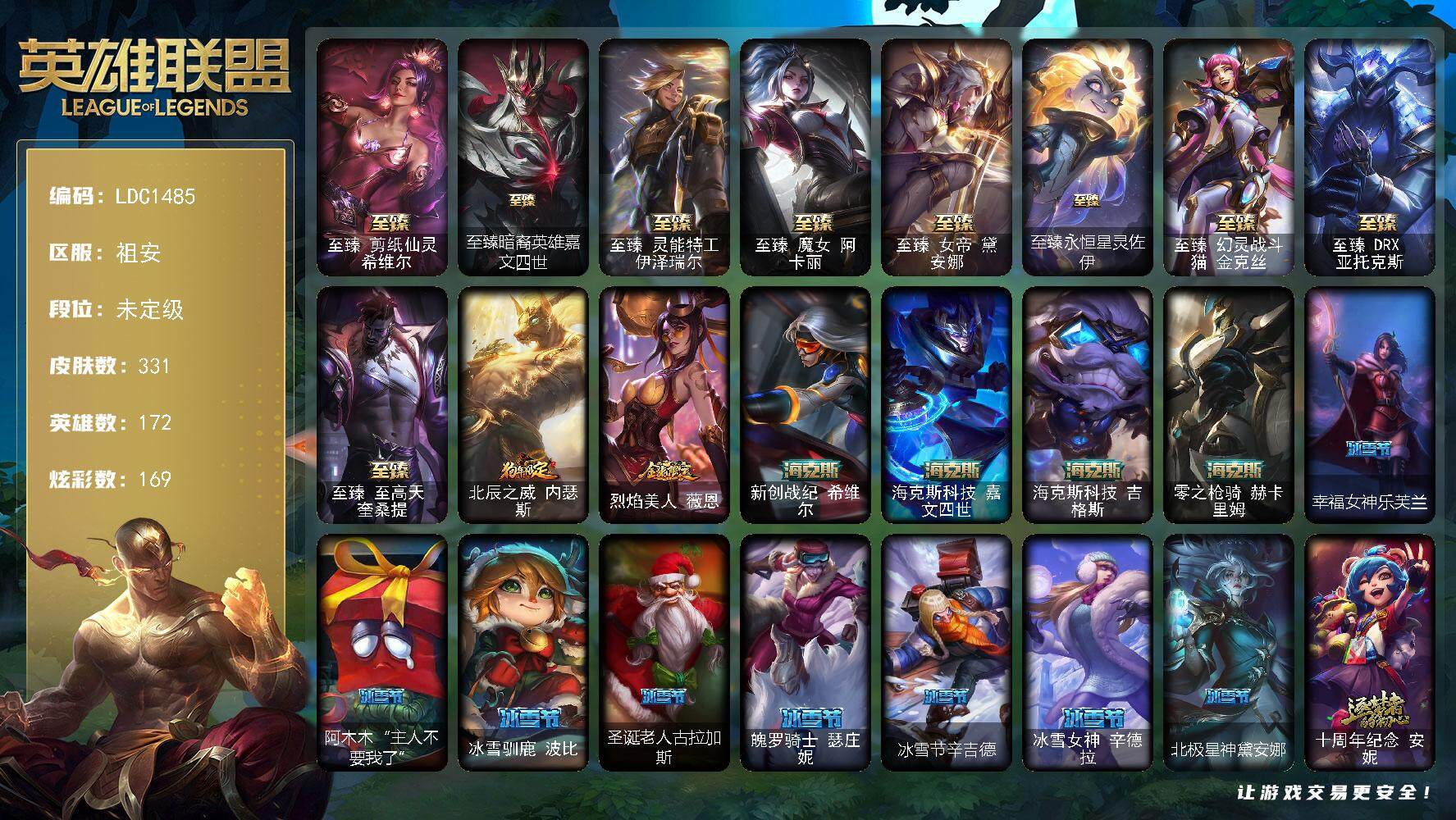 【147179】【LDC1485】172英雄/331皮肤/17神话/37限定/13臻彩/169炫彩/42传说/68史诗/未定级/觅心游侠卢锡安/银河魔装机神安妮/至臻剪纸仙灵希维尔/至臻暗裔英雄嘉文四世/至臻灵能特工伊泽瑞尔/至臻魔女阿卡丽/至臻女帝黛安娜/至臻永恒星灵佐伊/至臻幻灵战斗猫金克丝/至臻DRX亚托克斯/至臻至高天奎桑提/天龙之子卡莎飞龙乘云/无畏骑士瑟庄妮赤子初心/神龙尊者圣龙李青