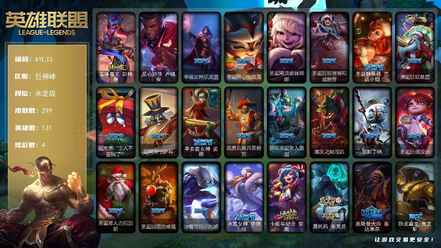 【148632】[14621160]可二次【店主推荐捡漏号!可直接换绑】未定级段位-131英雄-299皮肤-4炫彩-2神话-49限定-25传说-87史诗【年限皮肤】:玉净夜叉凯特琳【情人节限定】:觅心游侠卢锡安【冰雪限定】:幸福女神乐芙兰,圣诞开心鬼提莫,圣诞精灵崔丝塔娜,圣诞狂欢努努和威朗普,圣诞糖果棒厄运小姐,圣诞狂欢基兰,阿木木“主人不要我了”,胡桃夹子萨科,平安夜女神娑娜,英勇玩具兵普朗