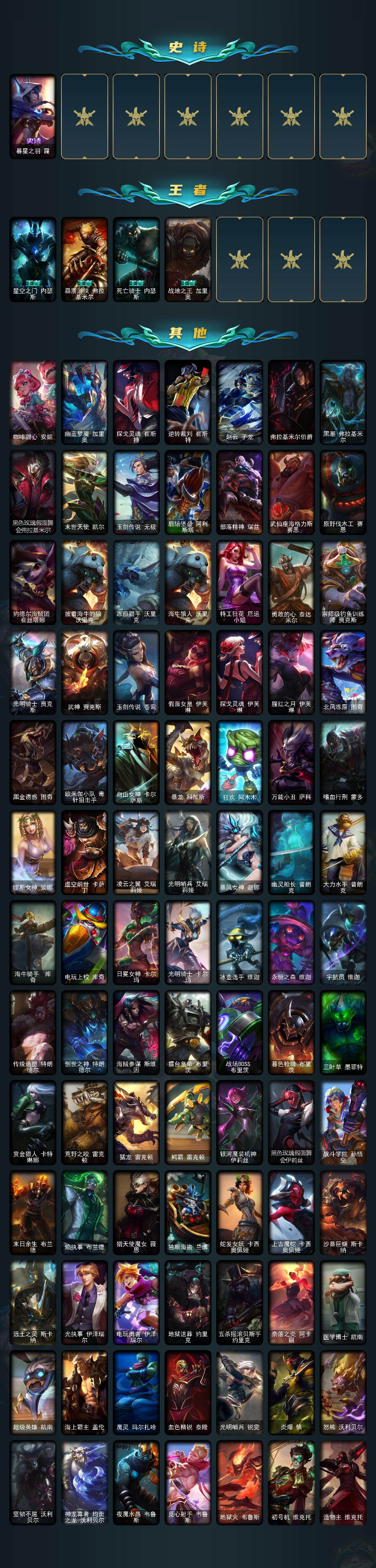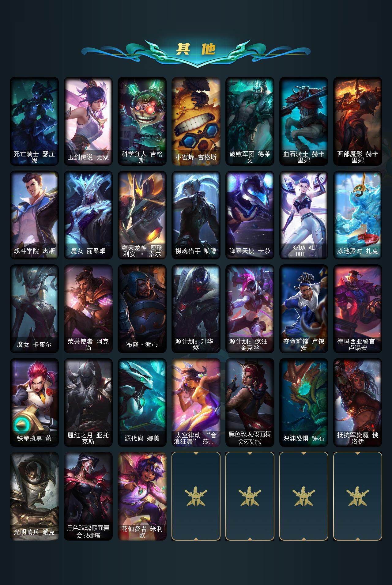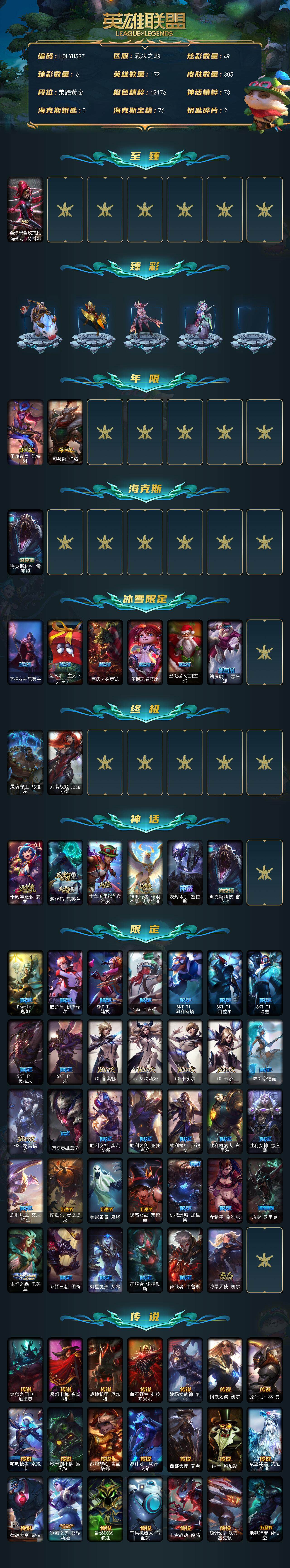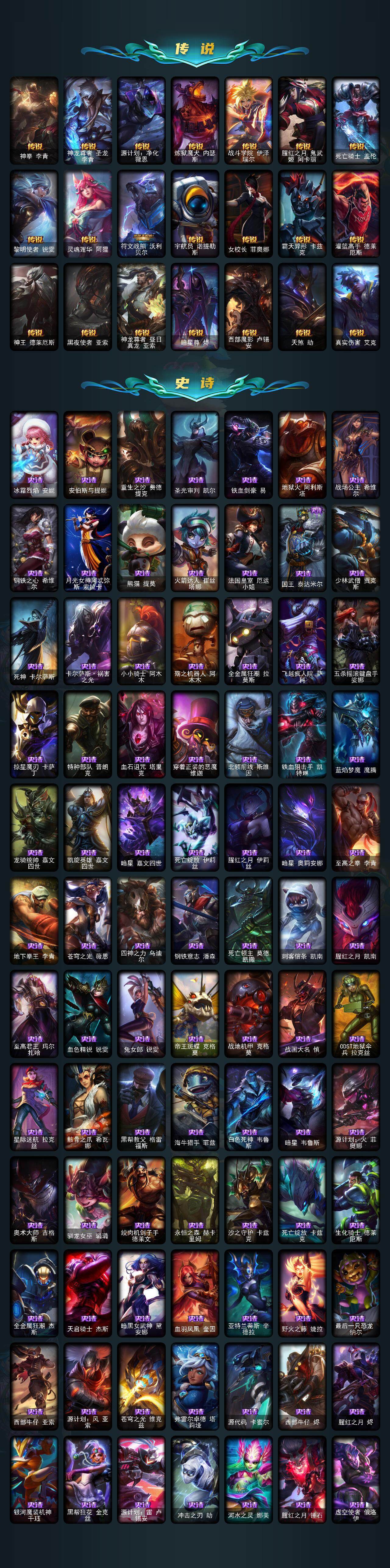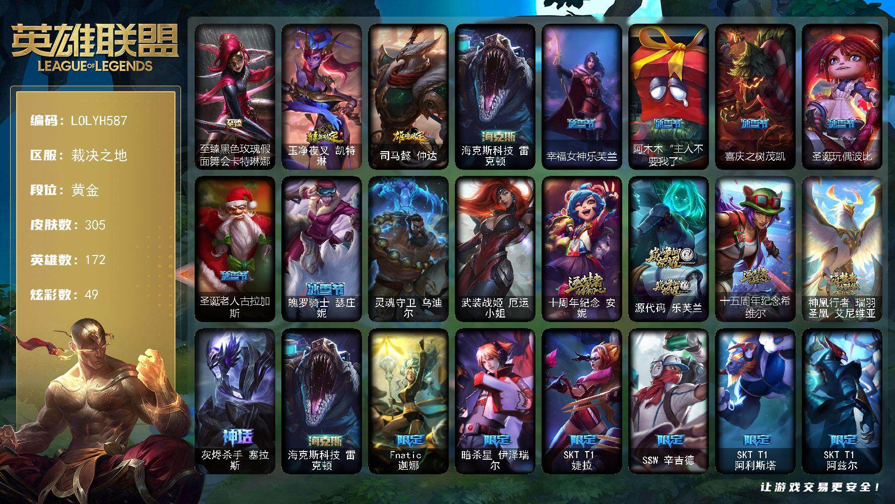 【150316】【LOLYH587】172英雄/305皮肤/2终极/7神话/42限定/6臻彩/49炫彩/42传说/85史诗/黄金/至臻黑色玫瑰假面舞会卡特琳娜/天龙之子卡莎飞龙乘云/无畏骑士瑟庄妮赤子初心/征服者韦鲁斯炫金/破败军团厄运小姐灵岛征伐使/魔女阿卡丽虚荣/净雪之月莫甘娜冬虹/玉净夜叉凯特琳/司马懿仲达/海克斯科技雷克顿/幸福女神乐芙兰/阿木木:“主人不要我了”/喜庆之树茂凯/圣诞玩偶