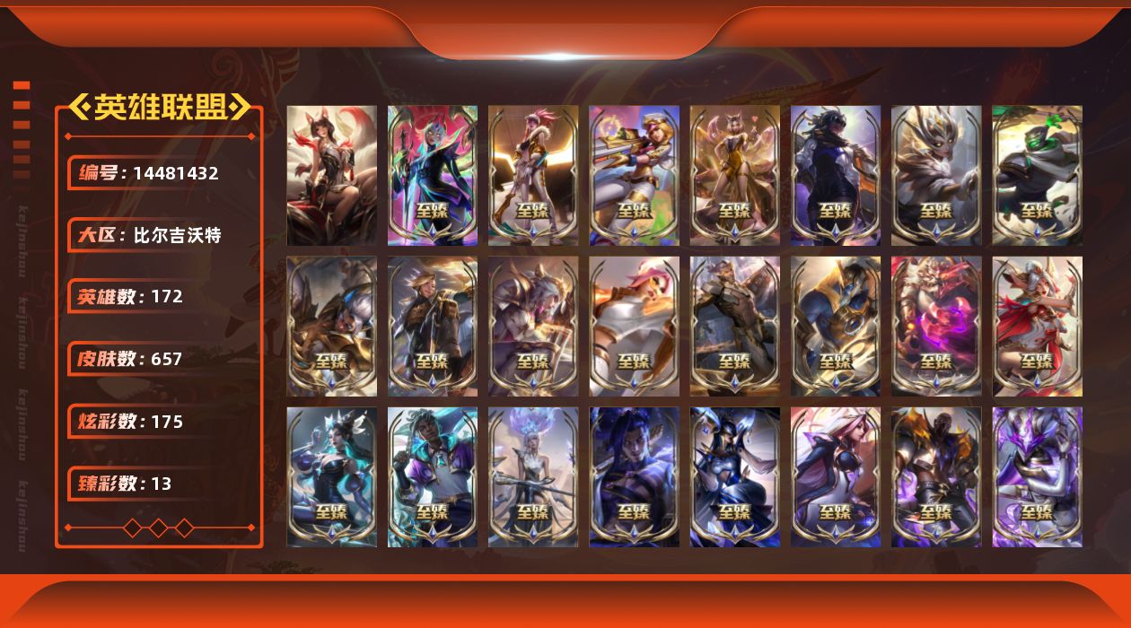 【152247】[14481432]t32072 皇冠账号【比尔吉沃特】殿堂传奇阿狸 657皮肤 175炫彩 13臻彩 42神话/93限定/62传说/172英雄 账号等级:555 单双排段位:白银【重要头像】爱意绵绵 披萨鸡 圣诞捣蛋鬼金克丝 至臻青花瓷丽桑卓 至臻魔女婕拉 【重要皮肤】殿堂传奇阿狸 至高天凯尔至臻 西部魔影伊芙琳至臻 青花瓷千珏至臻 天龙之子伊泽瑞尔至臻 北