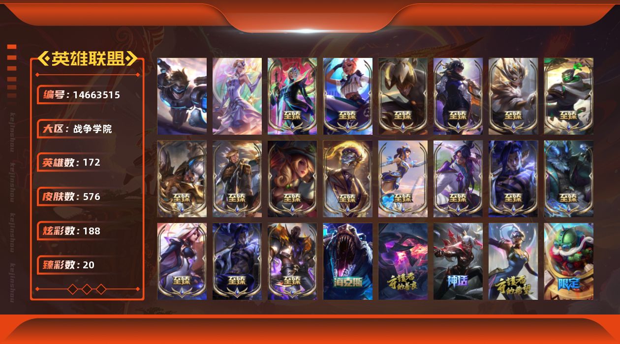 【153534】[14663515]t32447【战争学院】 576皮肤 188炫彩 20臻彩 25神话/72限定/52传说/172英雄 账号等级:305 云顶神话:3【重要头像】云顶古琴娑娜 觅心之翼奎因 我麦是开的么 万圣节卡特琳娜 星守金克丝炫彩 水晶圣骑艾希炫彩头 水晶圣骑艾希头 【重要皮肤】至高天凯尔至臻 斗魂觉醒派克至臻 墨之影武者亚索至臻 绝息圣堂厄运小姐至臻
