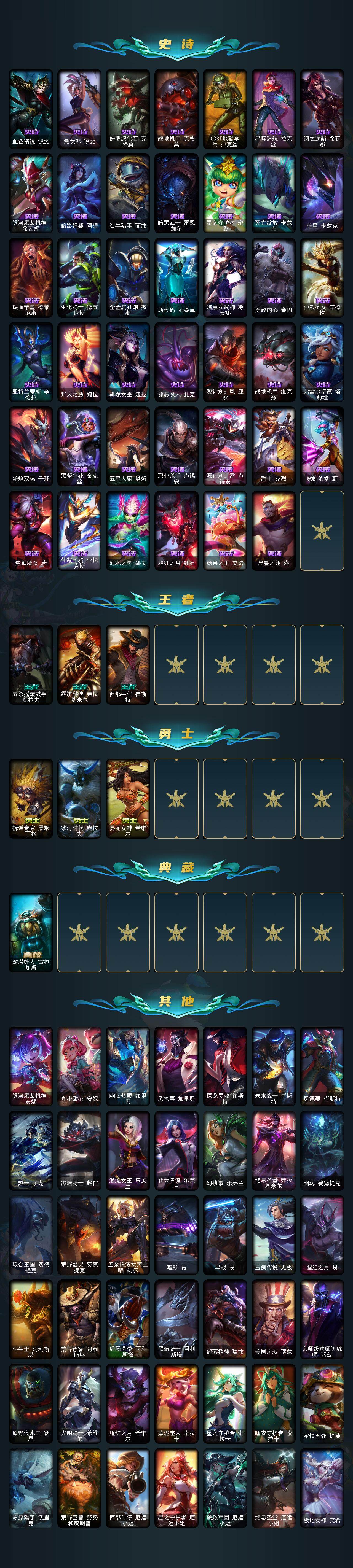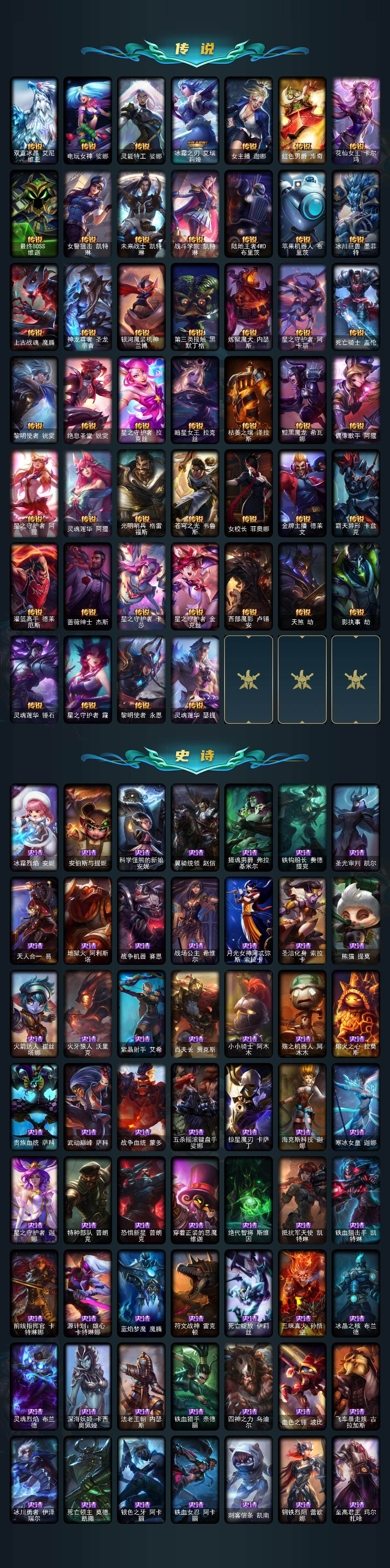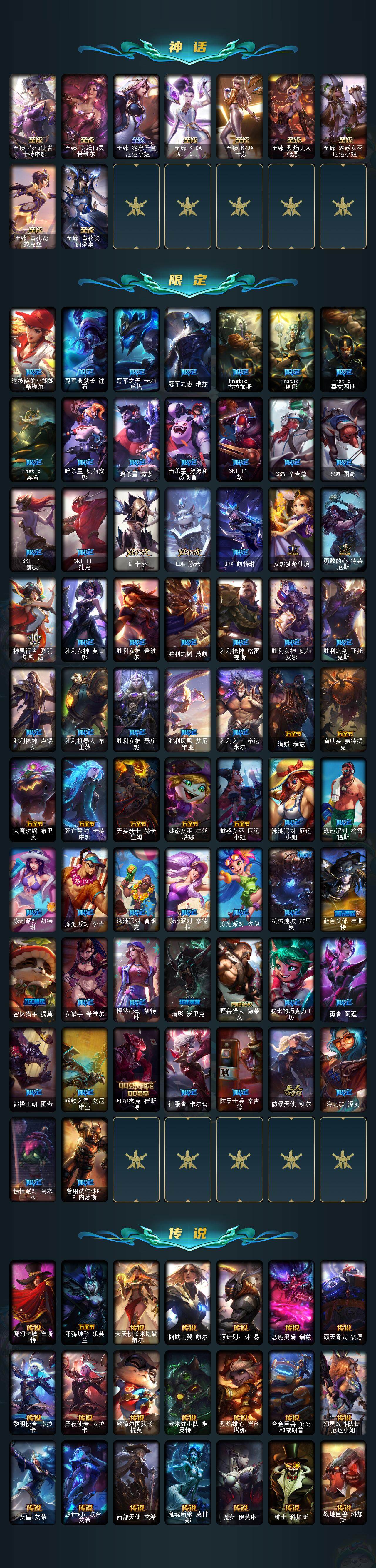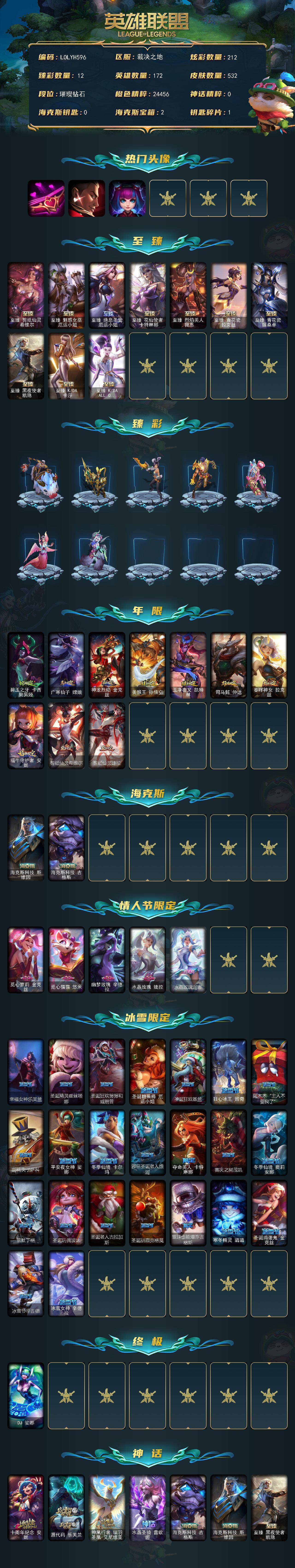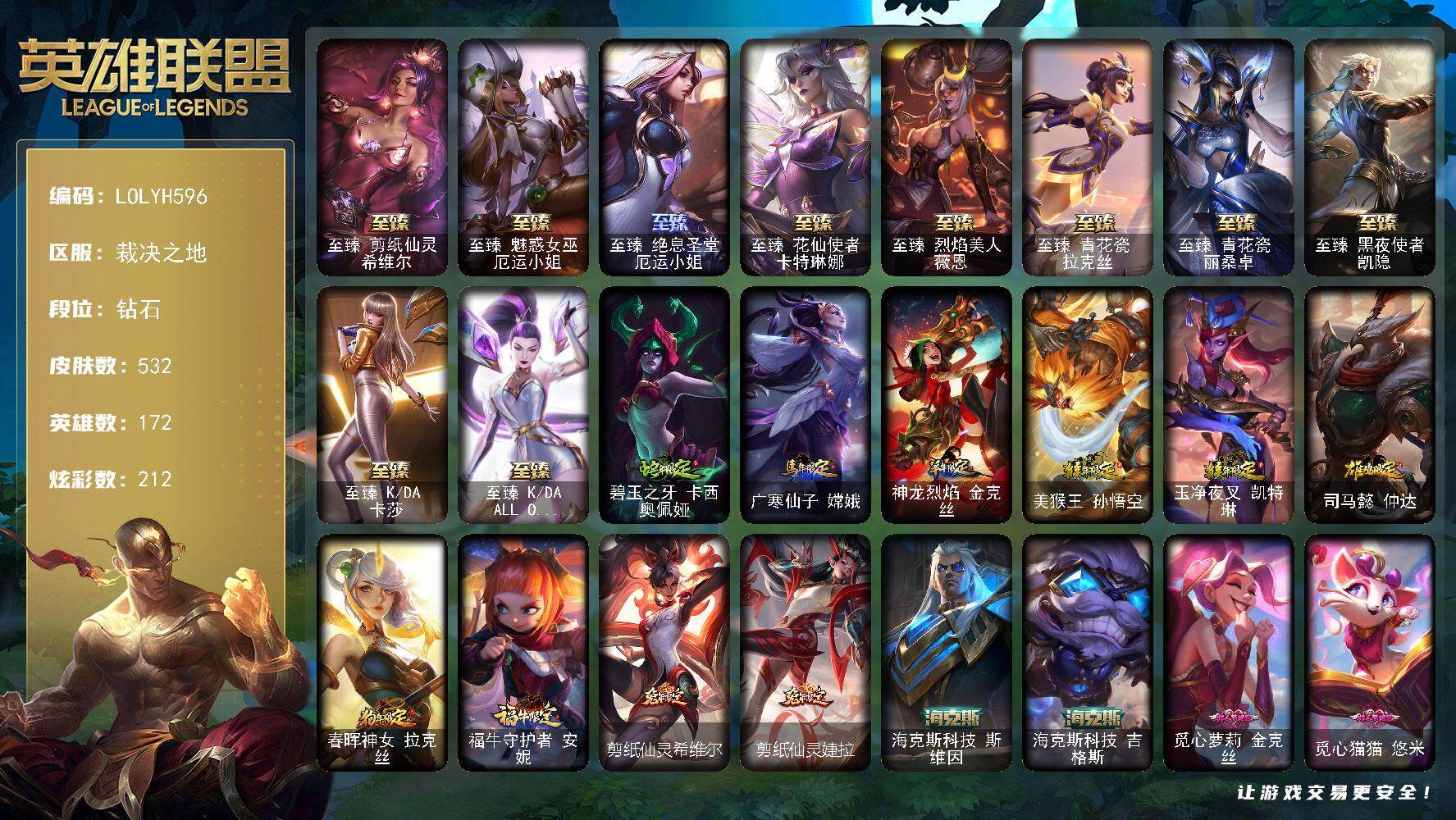 【153583】【LOLYH596】172英雄/532皮肤/1终极/16神话/103限定/12臻彩/212炫彩/67传说/97史诗/钻石/爱情之歌/觅心游侠卢锡安/银河魔装机神安妮/至臻剪纸仙灵希维尔/至臻魅惑女巫厄运小姐/至臻绝息圣堂厄运小姐/至臻花仙使者卡特琳娜/至臻烈焰美人薇恩/至臻青花瓷拉克丝/至臻青花瓷丽桑卓/至臻黑夜使者凯隐/至臻K/DA卡莎/至臻K/DAALLOUT卡莎/天龙之子卡