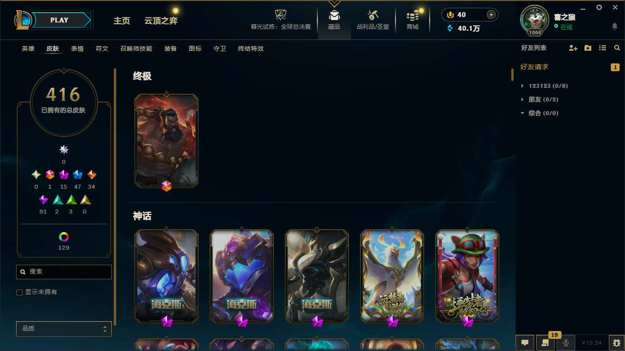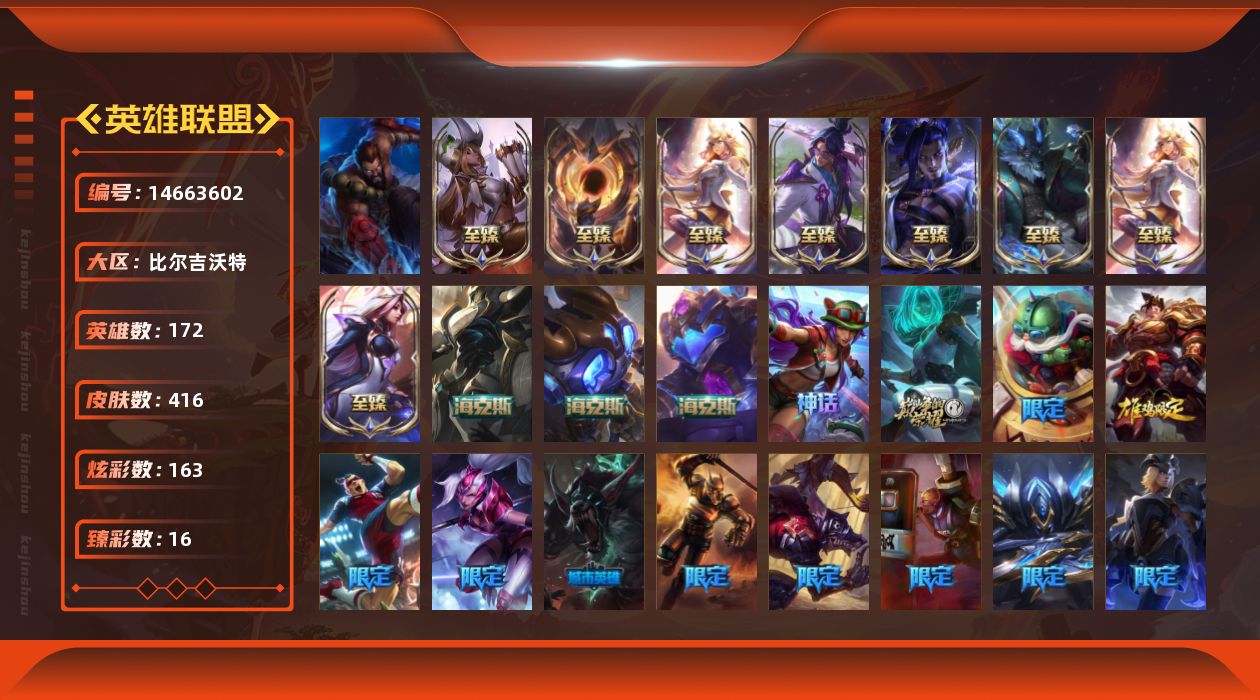 【153602】[14663602]t32448【比尔吉沃特】416皮肤 163炫彩 16臻彩 15神话/47限定/34传说/172英雄 账号等级:1068 单双排段位:铂金【重要头像】云顶战斗学院伊泽瑞尔 北极星神黛安娜 北极星神黛安娜炫彩 可爱悠米 可爱安妮 不错哦 至臻星之守护者索拉卡 【重要皮肤】绝息圣堂厄运小姐至臻 北极星使者沃里克至臻 至高天奎桑提至臻 灵魂莲华易