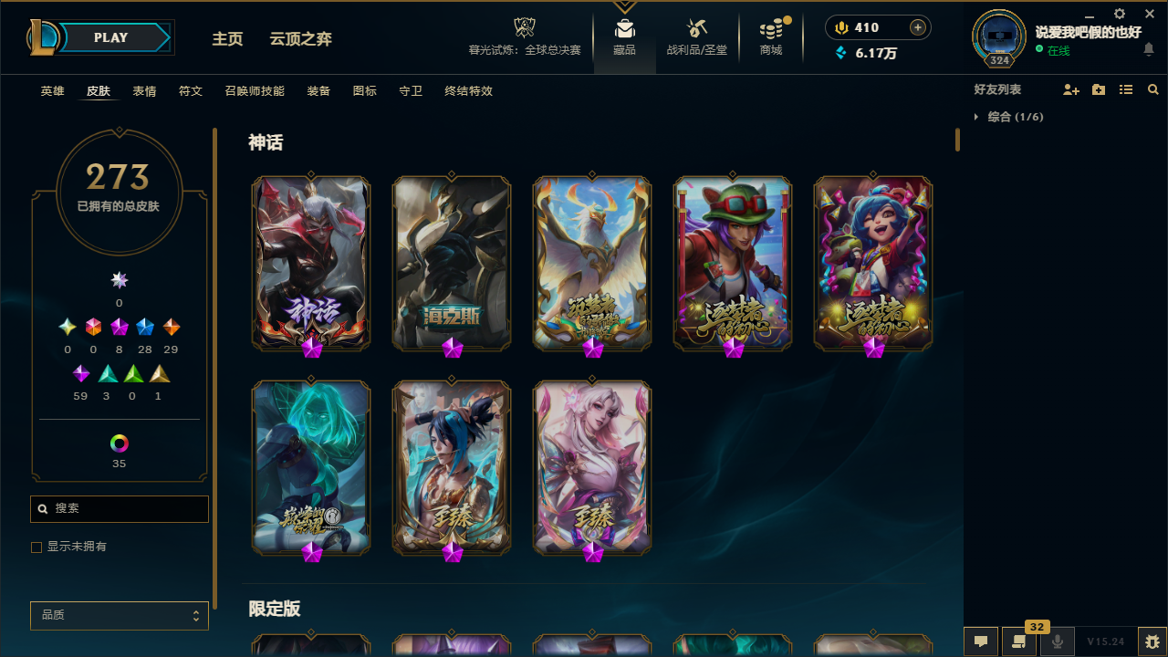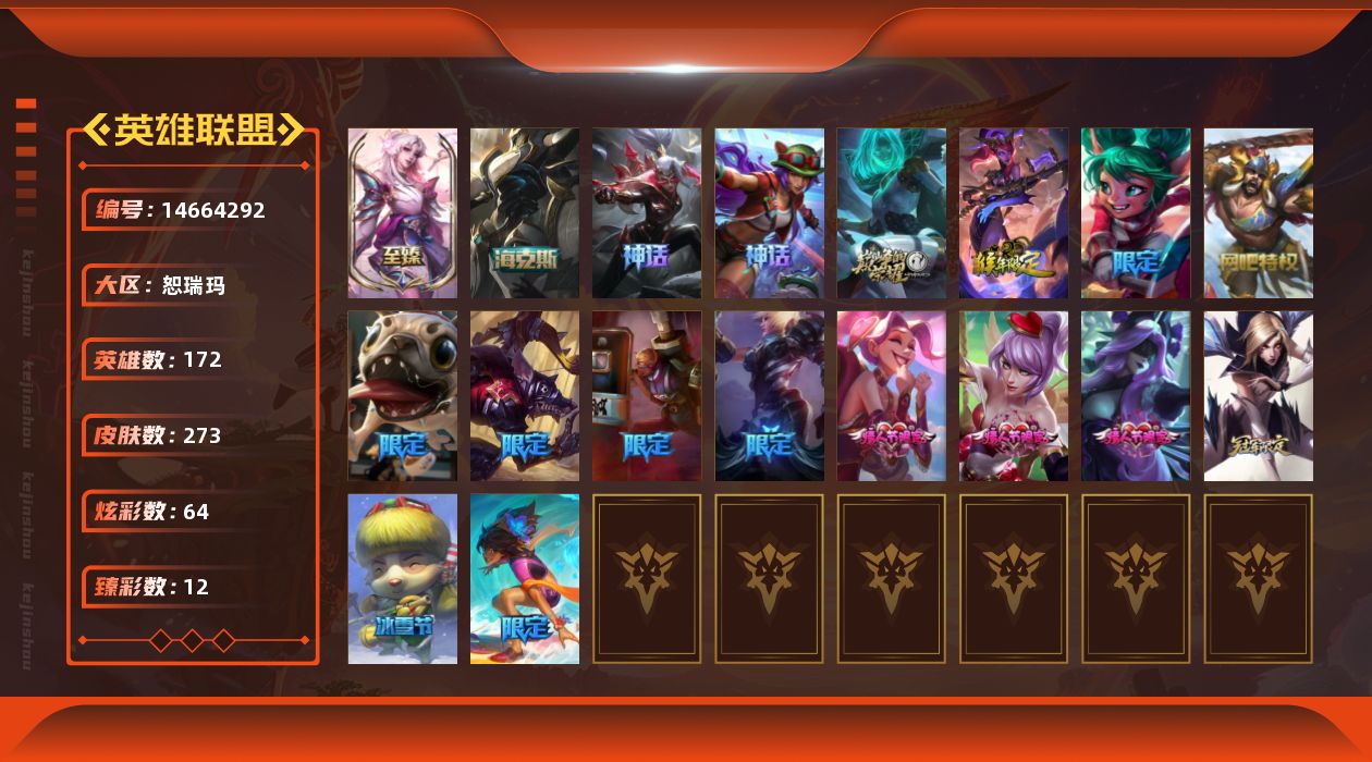 【153720】[14664292]t32494【恕瑞玛】273皮肤 64炫彩 12臻彩 8神话/28限定/29传说/172英雄 账号等级:324段位翡翠【重要头像】爱情之歌 心型钥匙 觅心之翼奎因 永恒之森霞炫彩 黎明使者莫甘娜 KDA萨勒芬妮 糖果大战伊芙琳炫彩 北极星守望者佐伊炫彩 可爱安妮 不错哦 【重要皮肤】莲华温泉厄斐琉斯至臻 灵魂莲华拉克丝至臻 殿堂传奇薇恩