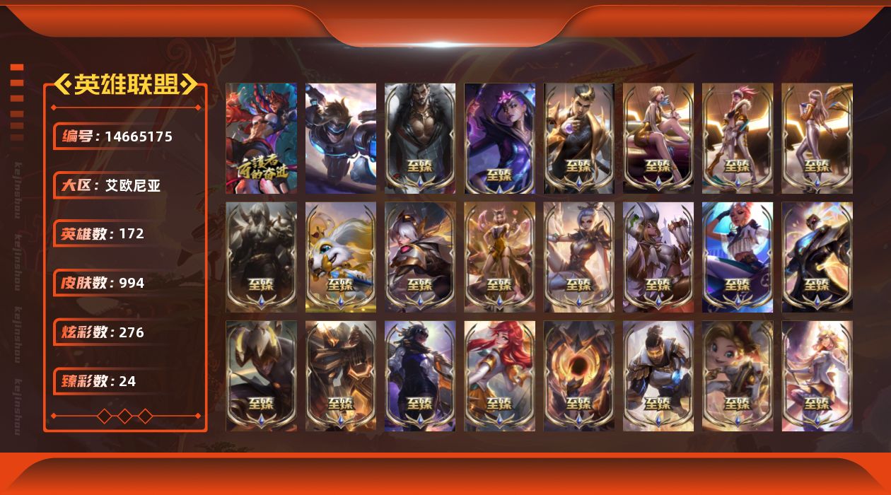【153878】[14665175]t32504 皇冠账号 【艾欧尼亚】994皮肤 276炫彩 24臻彩 80神话/150限定/92传说/172英雄 账号等级:746段位黄金【重要头像】云顶战斗学院伊泽瑞尔 至爱的鹿 爱情之歌 大家伙 KDA阿卡丽 KDA阿狸 KDA萨勒芬妮 星守卡莎 EDG佛耶戈 EDG格雷福斯 EDG悠米 太空律动拉克丝 太空律动璐璐 幼犬内瑟斯