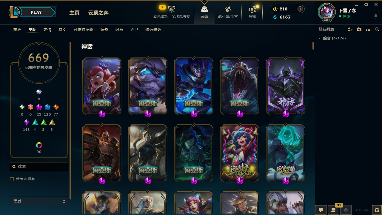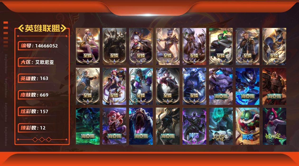 【154070】[14666052]t32519 皇冠账号【艾欧尼亚】 绿龙瞎 669皮肤 157炫彩 12臻彩 23神话/120限定/77传说/163英雄 账号等级:381【重要头像】爱意绵绵 星守金克丝炫彩 剪纸仙灵艾瑞莉娅 剪纸仙灵艾瑞莉娅炫彩 福运魄罗 真实伤害艾克 【重要皮肤】魔女阿卡丽至臻 DRX亚托克斯至臻 星之守护者艾克至臻 幻灵战斗猫金克丝至臻 灵能特工伊泽