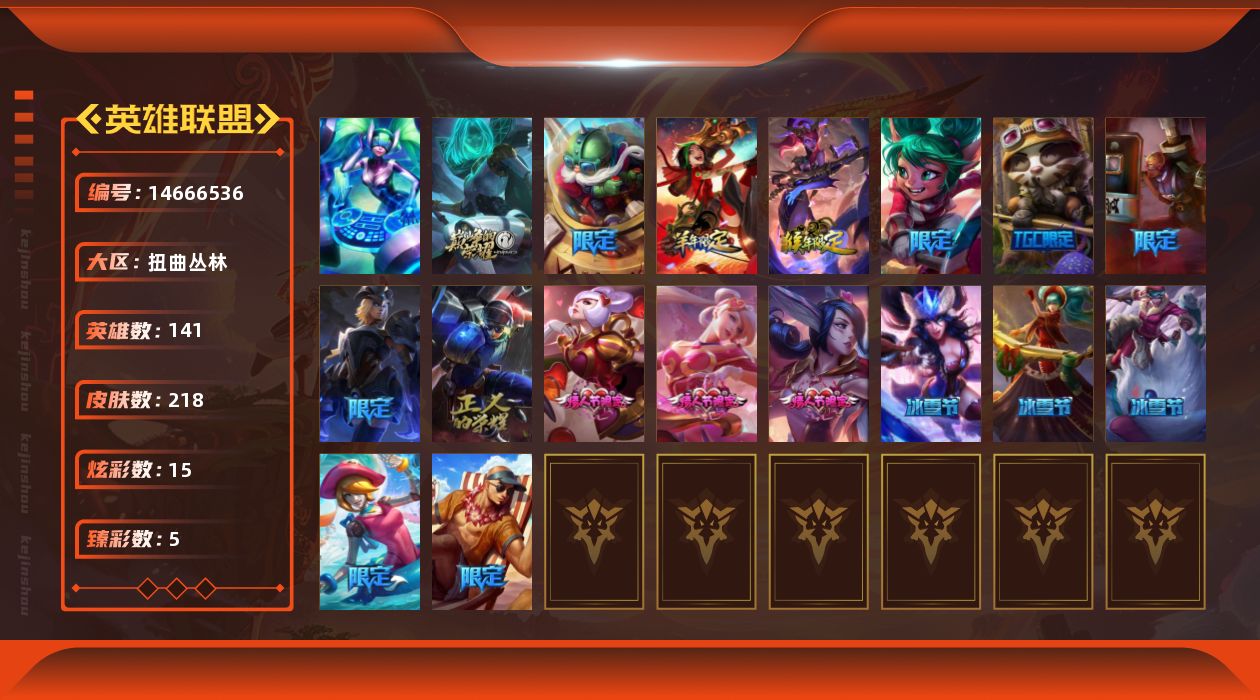 【154473】[14666536]t32472【扭曲丛林】 218皮肤 15炫彩 5臻彩 2神话/30限定/22传说/141英雄 账号等级:160 单双排段位:青铜【重要头像】银河魔装机神安妮 女帝卡特琳娜 【重要皮肤】舞会公主安妮 电玩勇者锐雯 银龙裁决泰隆 神龙烈焰金克丝 玉净夜叉凯特琳 胜利枪神卢锡安 胜利之剑亚托克斯 甜心之羽霞 甜心宝贝娑娜 觅心魔灵奥莉安娜