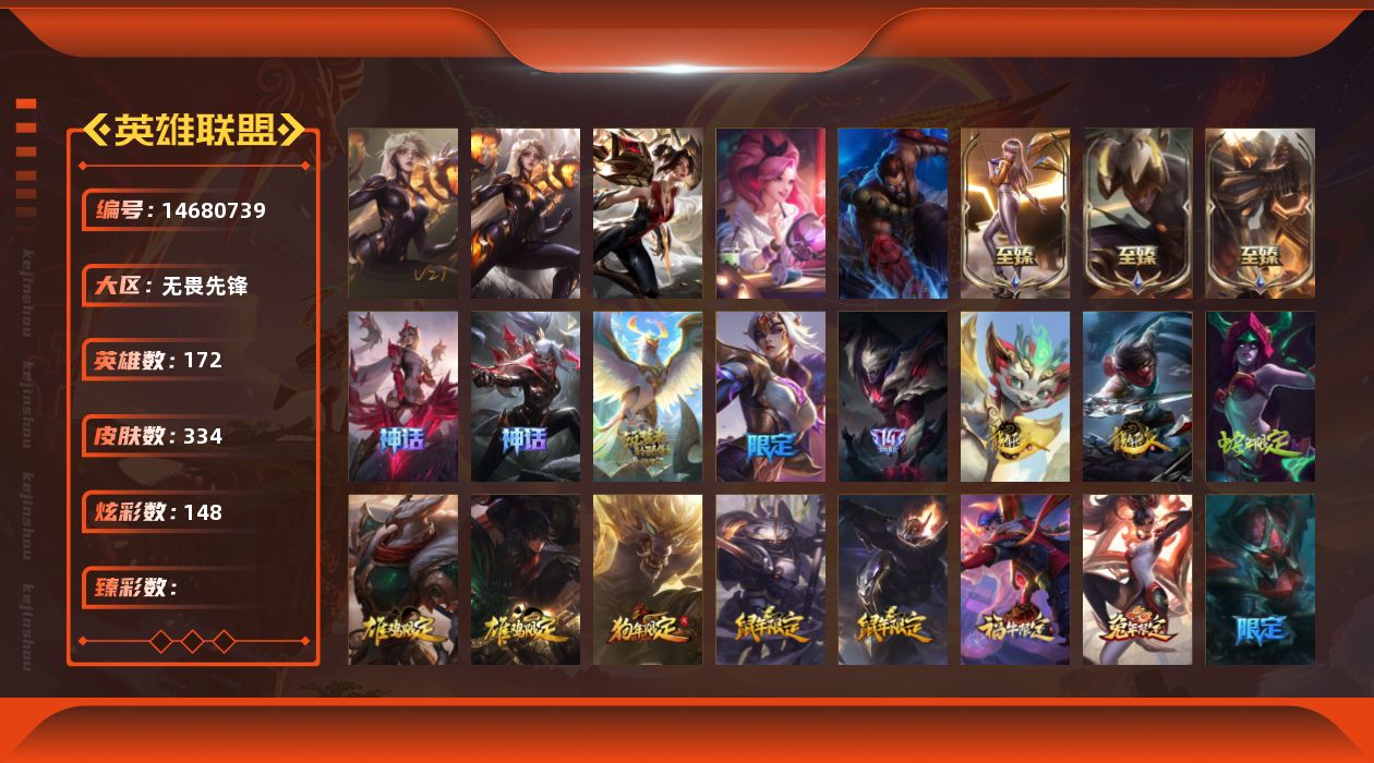 【156624】[14680739]3卓越 2终极 6神话 72限定 36传说 47史诗 334皮肤 148炫彩 172英雄 可二次 可修改实名 【卓越】殿堂传奇 卡莎,联盟不朽 卡莎,签名版联盟不朽 卡莎 【至臻】至臻 K/DA 卡莎,至臻 王国机神玄武 盖伦,至臻 黑夜使者 李青,水晶圣骑 艾希 【限定】2021 全球总决赛 嘉文四世,创星之灵 璐璐,2022 全球总决赛 阿兹尔 【情人节限
