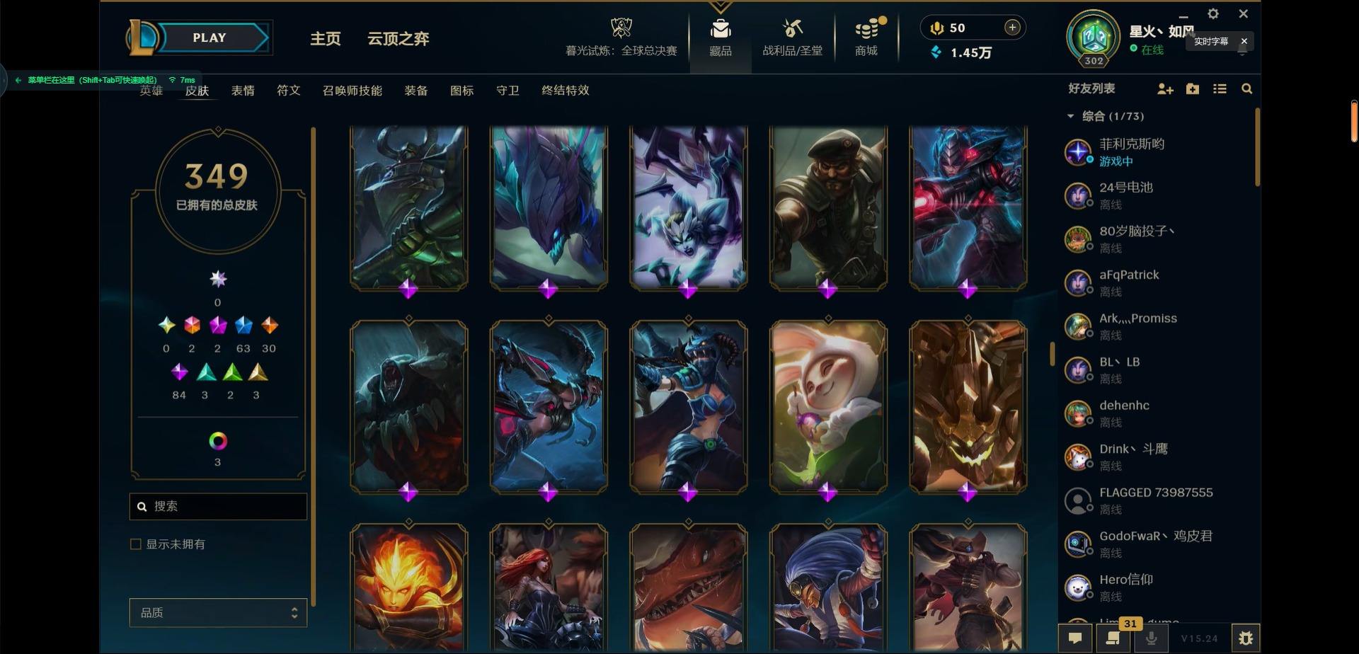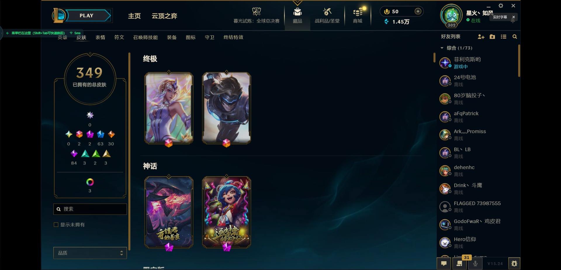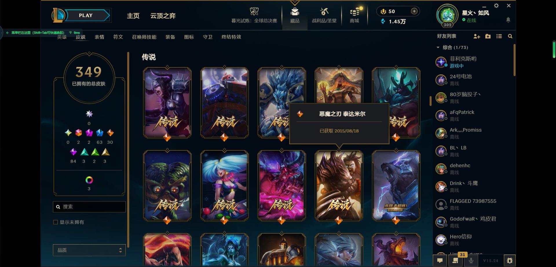 【156870】[14682602]2终极 2神话 63限定 30传说 84史诗 349皮肤 3炫彩 170英雄 可二次 可修改实名 【限定】:舞会公主 安妮【情人节限定】:觅心女王 艾希【赛季限定皮】:胜利之剑 亚托克斯【冠军限定系列】:S1FNC 酒桶,S2 暗杀星 蒙多,S2 暗杀星 努努,S2 暗杀星 慎,S3 SKT T1 劫,S4 SSW 锤石,S4 SSW 雷恩加尔,S4 SSW