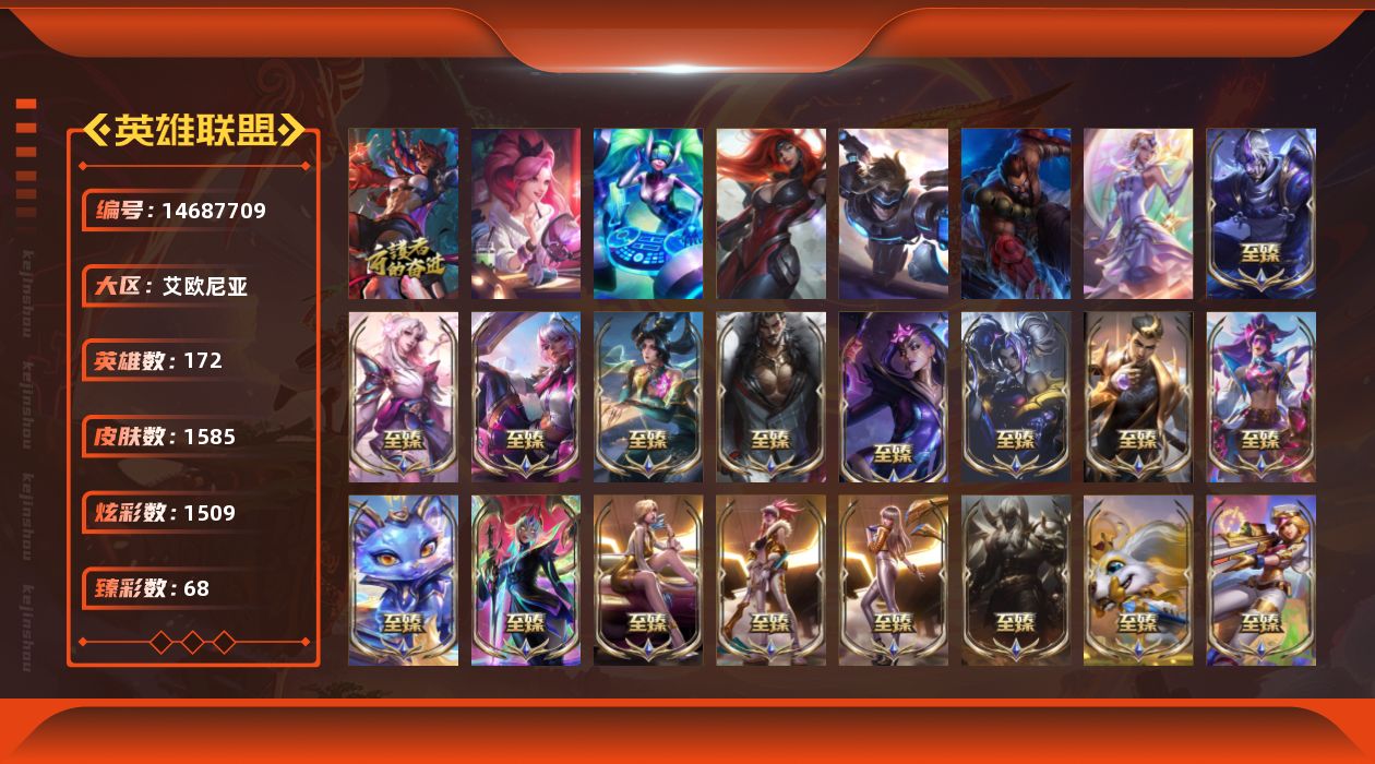 【158021】[14687709]t32491【艾欧尼亚】三色龙瞎 1585皮肤 1509炫彩 68臻彩 136神话/324限定/122传说/172英雄 账号等级:996 云顶神话:2 单双排段位:翡翠【重要头像】爱意绵绵 爱情之歌 心型钥匙 觅心游侠卢锡安 觅心之翼奎因 雪花 大家伙 两仪无极 萨勒芬妮超级巨星 萨勒芬妮独立音乐人 我麦是开的么 神龙尊者艾希 咖啡甜心