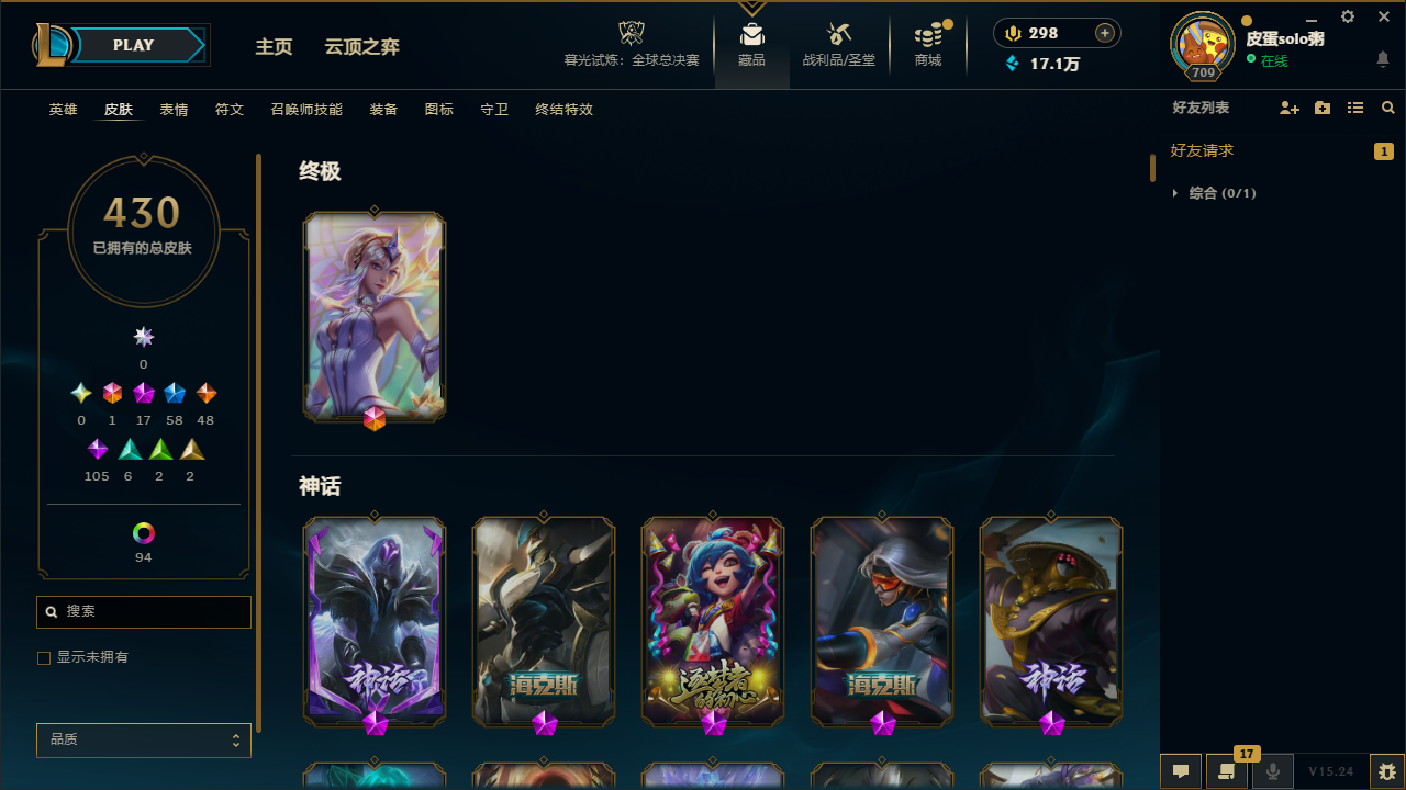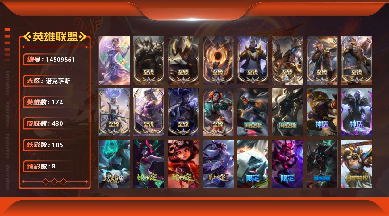 【158367】[14509561]t31979【诺克萨斯】430皮肤 105炫彩 8臻彩 17神话/58限定/48传说/172英雄 账号等级:709段位翡翠【重要头像】心型钥匙 觅心之翼奎因 KDA萨勒芬妮 披萨鸡 不错哦 【重要皮肤】魂蔷薇烈娜塔至臻 墨之影武者亚索至臻 花仙使者卡特琳娜至臻 海珀利安小队X09星环灵风迦娜至臻 真实伤害亚索至臻 灵能特工伊泽瑞尔至臻 源