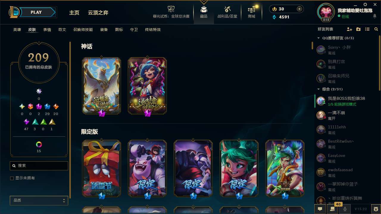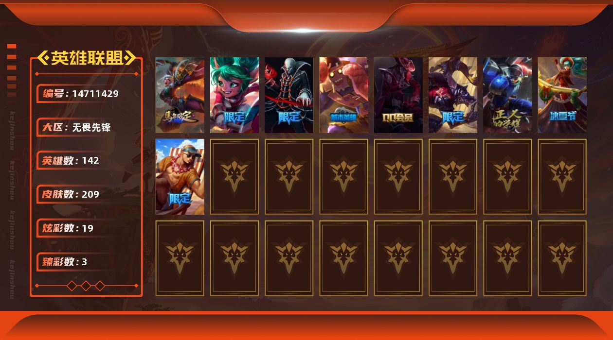 【158661】[14711429]t30418【无畏先锋】209皮肤 19炫彩 3臻彩 2神话/29限定/20传说/142英雄 账号等级:212 单双排段位:黄金 【重要头像】至爱的鹿 【重要皮肤】胜利剑圣易 胜利女神希维尔 电玩勇者锐雯 替父从军花木兰 胜利之树茂凯 胜利机器人布里茨 胜利枪神格雷福斯 胜利枪神卢锡安 平安夜女神娑娜 圣诞糖果棒厄运小姐 泳池派对李青 SKTT1劫 暗杀星努努