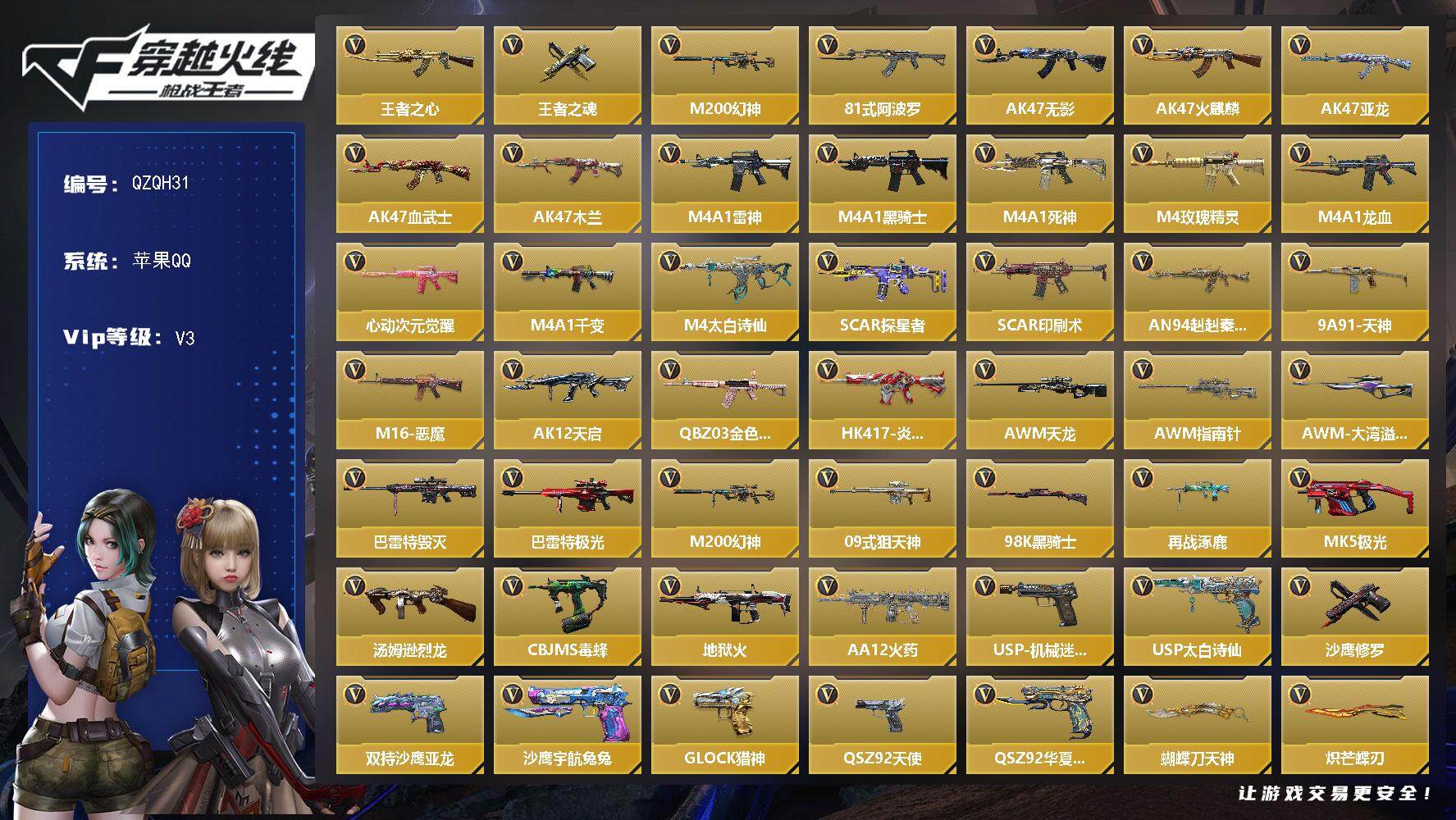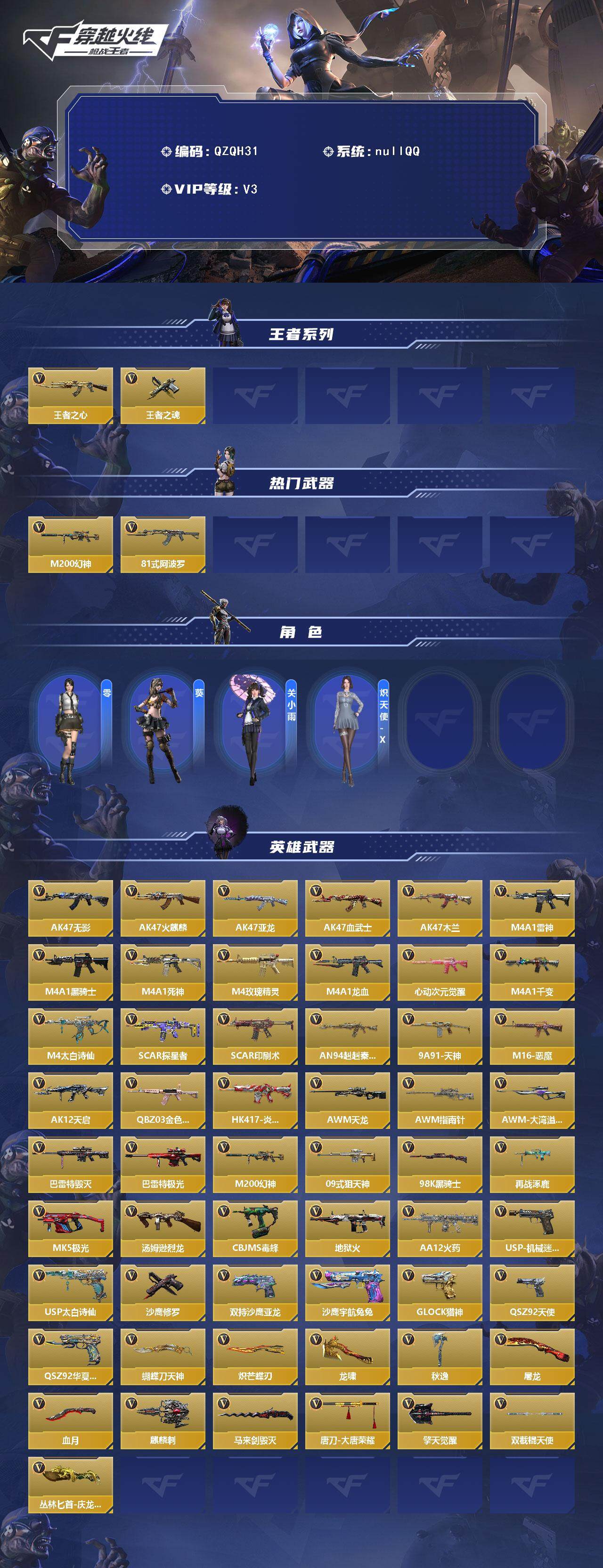 【158729】【QZQH31】VIP3/131V/王者之心/王者之魂/幻神/81式-阿波罗/零/葵/关小雨/炽天使-X/无影/火麒麟/AK47-亚龙/AK47-血武士/AK47-木兰/雷神/黑骑士/M4A1-死神/M4A1-玫瑰精灵/M4A1-龙血/M4A1-心动次元觉醒/M4A1-千变/M4A1-太白诗仙/SCAR-探星者/SCAR-印刷术/AN94-赳赳秦师/9A91-天神/M16-恶魔/