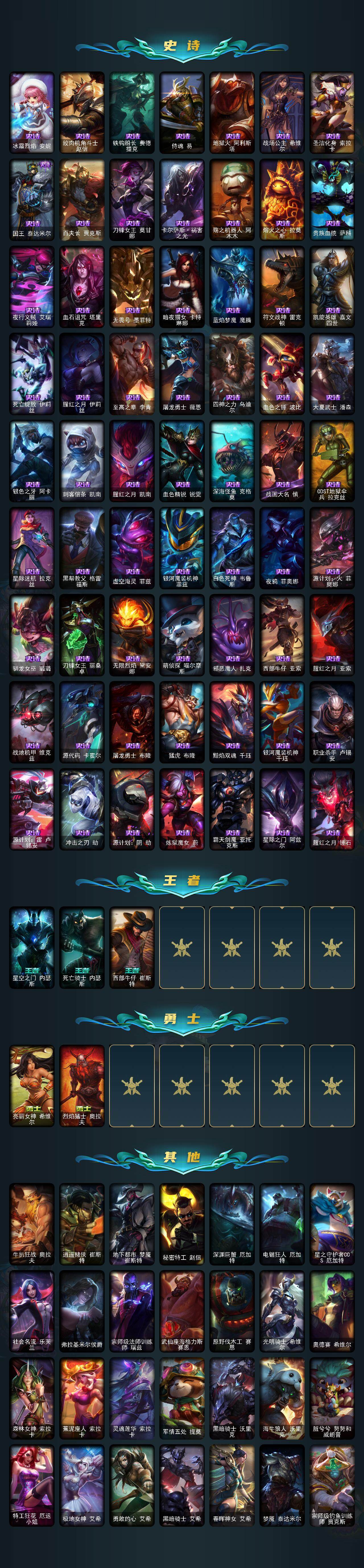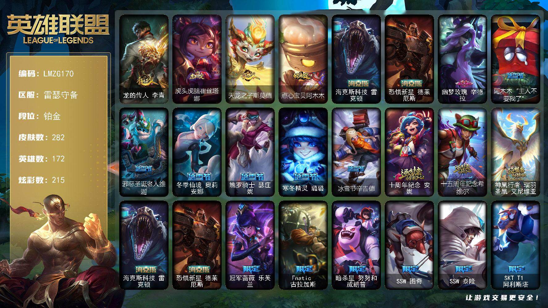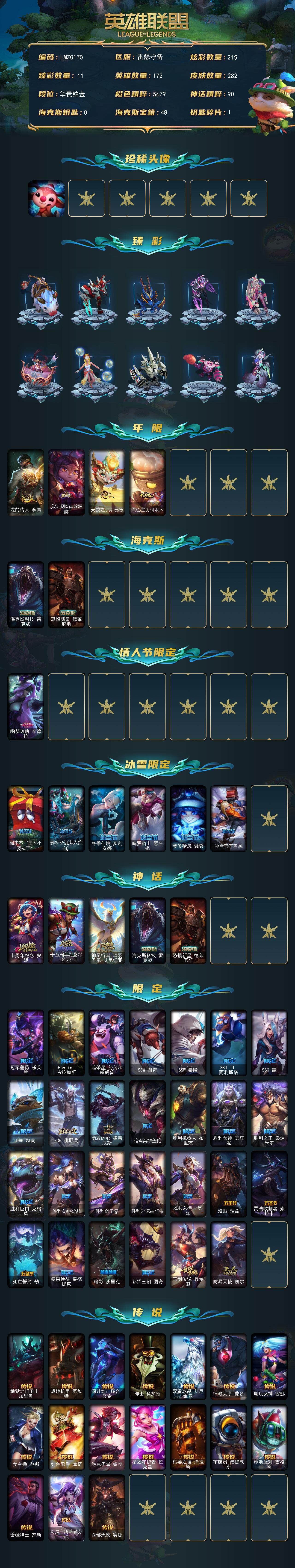 【158735】【LMZG170】172英雄/282皮肤/5神话/39限定/11臻彩/215炫彩/17传说/63史诗/铂金/至爱的鹿/无畏骑士瑟庄妮赤子初心/霸天战士雷恩加尔星啸天火/霸天异形卡兹克掠空魅影/天煞劫恒星游历者/幻灵战斗猫金克丝梦幻强袭/玉剑传说琴仙子丁香/泳池派对辛德拉荔枝枝连击/霸天巨兽雪崩墨菲特/可爱可爱粉红红布里茨/魔女阿卡丽虚荣/净雪之月莫甘娜冬虹/龙的传人李青/虎头虎脑