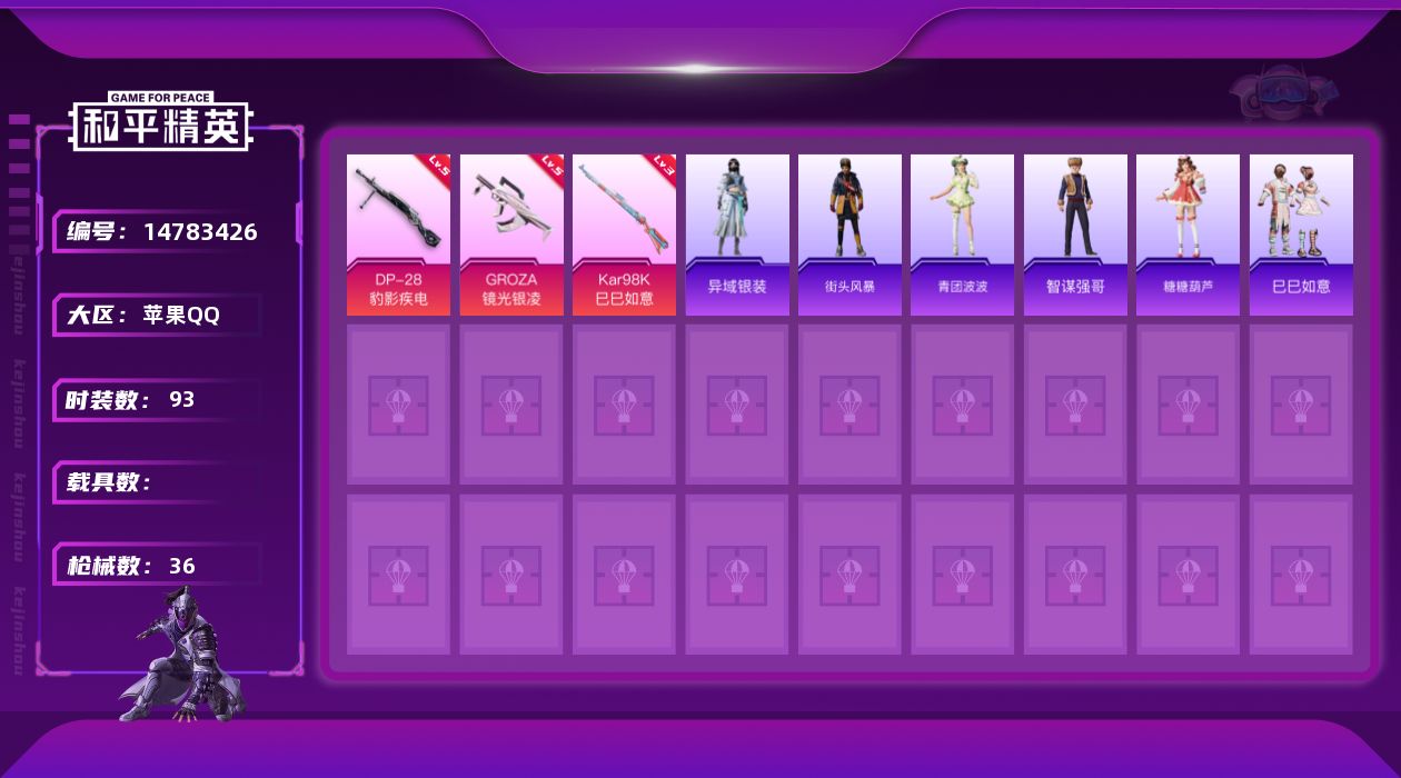 【166517】[14783426]【特价出售】 安卓十年苹果Q-3特效枪17套装36枪皮 8712热力值 历史不朽星钻Ⅳ 【3特效枪】 Kar98K-巳巳如意 (3级) DP-28-豹影疾电 (5级) GROZA-镜光银凌 (5级)