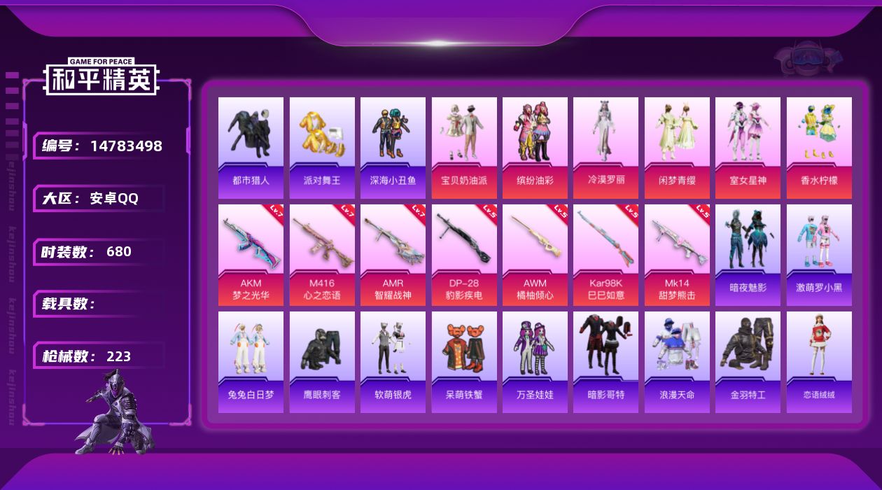 【166531】【不可二次】【安卓QQ】龟仙人 漫步者 都市猎人 AWM-橘柚倾心 极速红龙 梦起落英 庄周梦蝶飞行器 M416-心之恋语 缤纷油彩 浪漫假日 深海小丑鱼 M24-香水柠檬 瑞龙福将 浪漫天命 激萌罗小黑 团圆交子 软萌银虎 M762-瑞龙福将 狂沙舞者 金羽特工 香水柠檬 AKM-梦之光华 宝贝奶油派 派对舞王 暗影哥特