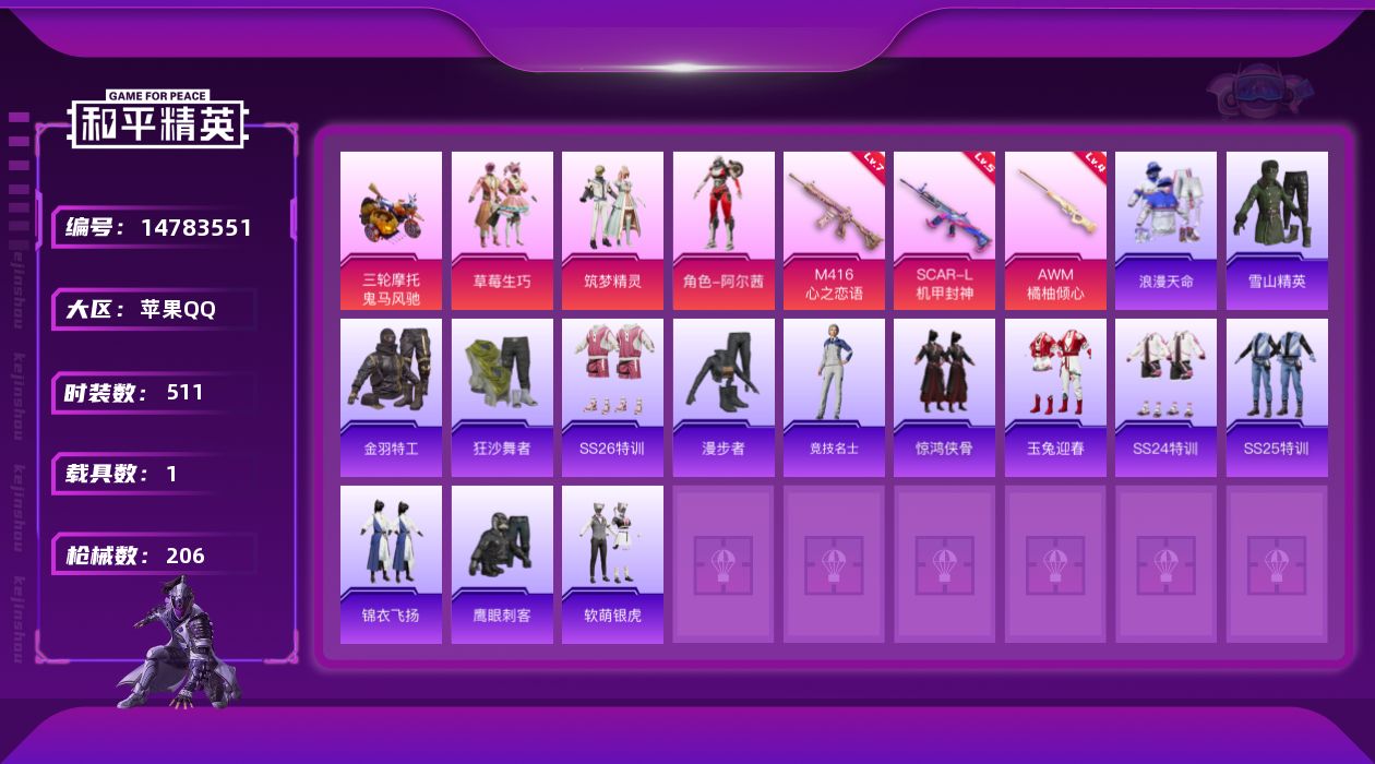【166541】【可二次】【苹果QQ】软萌银虎 漫步者 M762-瑞龙福将 SCAR-机甲封神 机械英豪 AWM-橘柚倾心 狂沙舞者 豚鼠丹丹 金羽特工 SCAR-L-机甲封神 鬼马风驰 M416-心之恋语 AKM-百万伏特 浪漫假日 草莓生巧 瑞龙福将 浪漫天命 雪山精英 怪笑疯兔 团圆交子