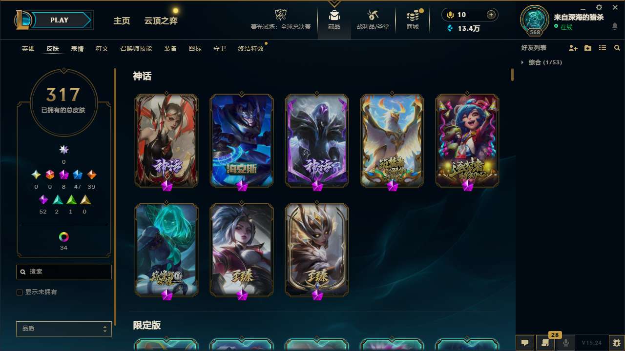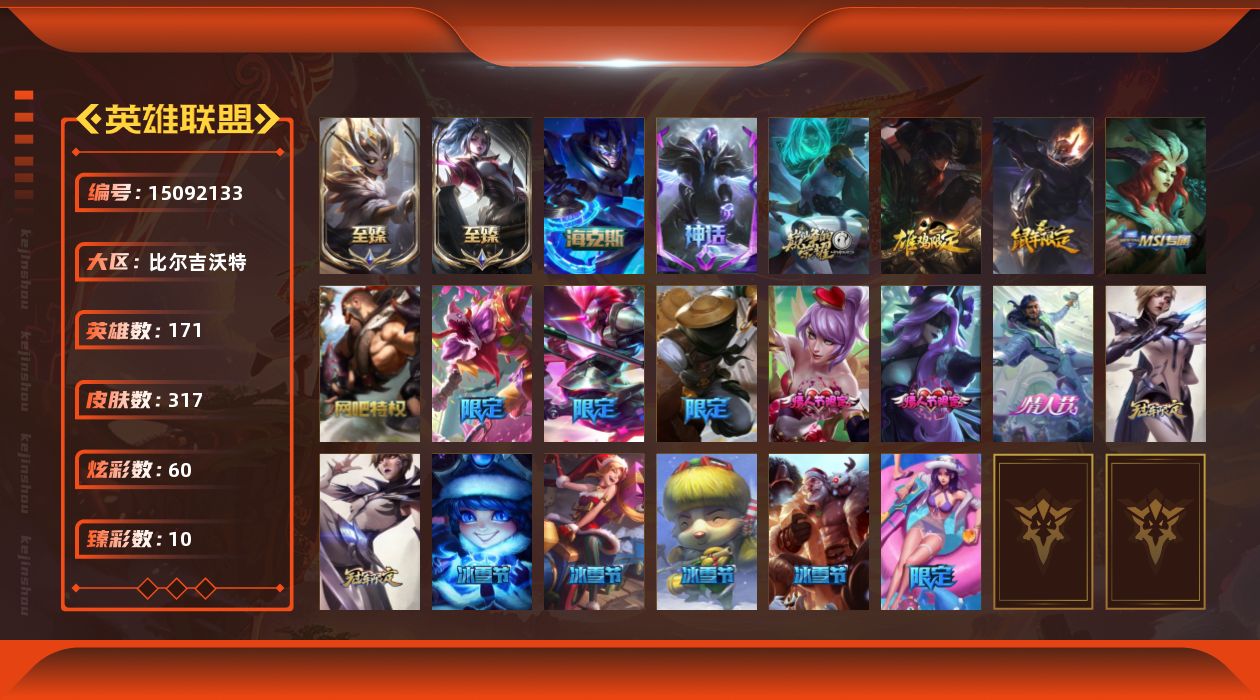 【217599】[15092133]t33290【比尔吉沃特】317皮肤 60炫彩 10臻彩 8神话/47限定/39传说/171英雄 账号等级:568 单双排段位:白银【重要头像】幼犬内瑟斯 不错哦 至臻魔女婕拉 西部魔影卢锡安炫彩头 【重要皮肤】魔女阿卡丽至臻 魔女婕拉至臻 殿堂传奇乐芙兰 灰烬骑士派克 海克斯科技嘉文四世 胜利剑圣易 胜利女神娑娜 胜利之王泰达米尔 胜