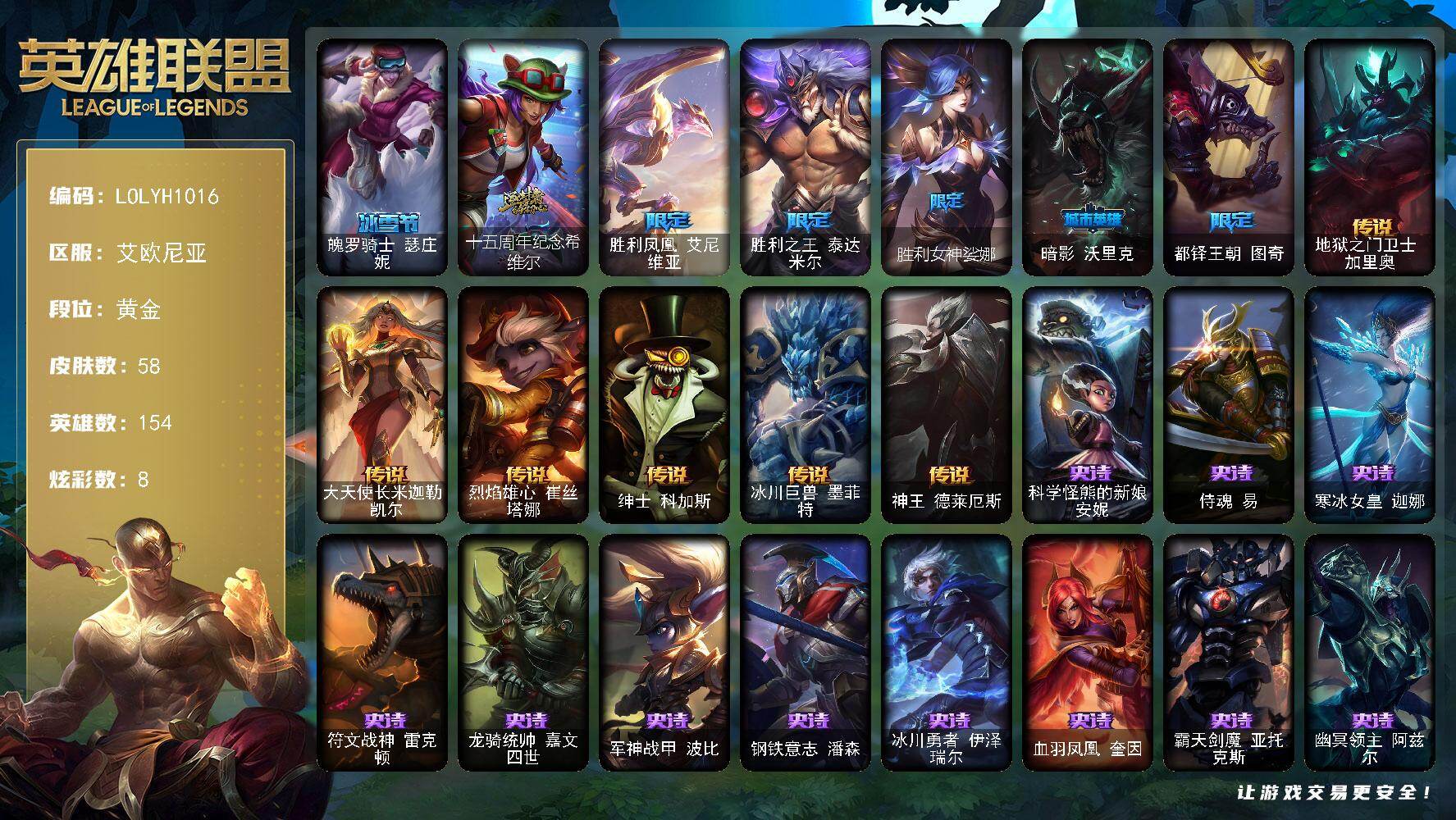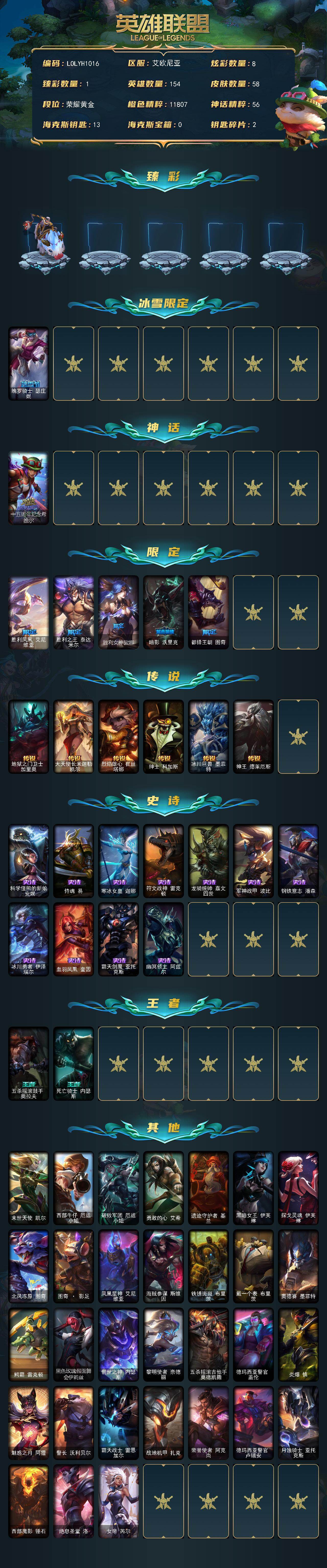 【340531】【LOLYH1016】154英雄/58皮肤/1神话/6限定/1臻彩/8炫彩/6传说/11史诗/黄金/无畏骑士瑟庄妮赤子初心/魄罗骑士瑟庄妮/十五周年纪念希维尔/胜利凤凰艾尼维亚/胜利之王泰达米尔/胜利女神娑娜/暗影妖狐阿狸/都铎王朝图奇/地狱之门卫士加里奥/大天使长米迦勒凯尔/烈焰雄心崔丝塔娜/绅士科加斯/冰川巨兽墨菲特/神王德莱厄斯/科学怪熊的新娘安妮/侍魂易/寒冰女皇迦娜/符