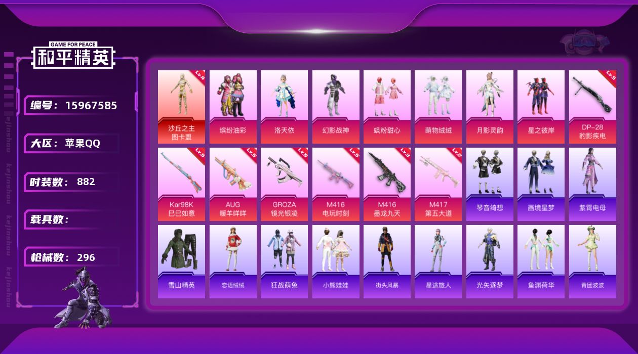 【362394】【不可二次】【苹果QQ】龟仙人 红熊茄茄 水银刺客 SS1特训 M762-瑞龙福将 洛天依 M417射手步枪 龙翔九天飞行器 忍者信条 M416-墨龙九天 M416-电玩时刻 沙丘之主-图卡盟 星之彼岸 缤纷油彩 粉红小猪 幻影战神 瑞龙福将 醒狮腾龙 M417-第五大道 雪山精英 团圆交子